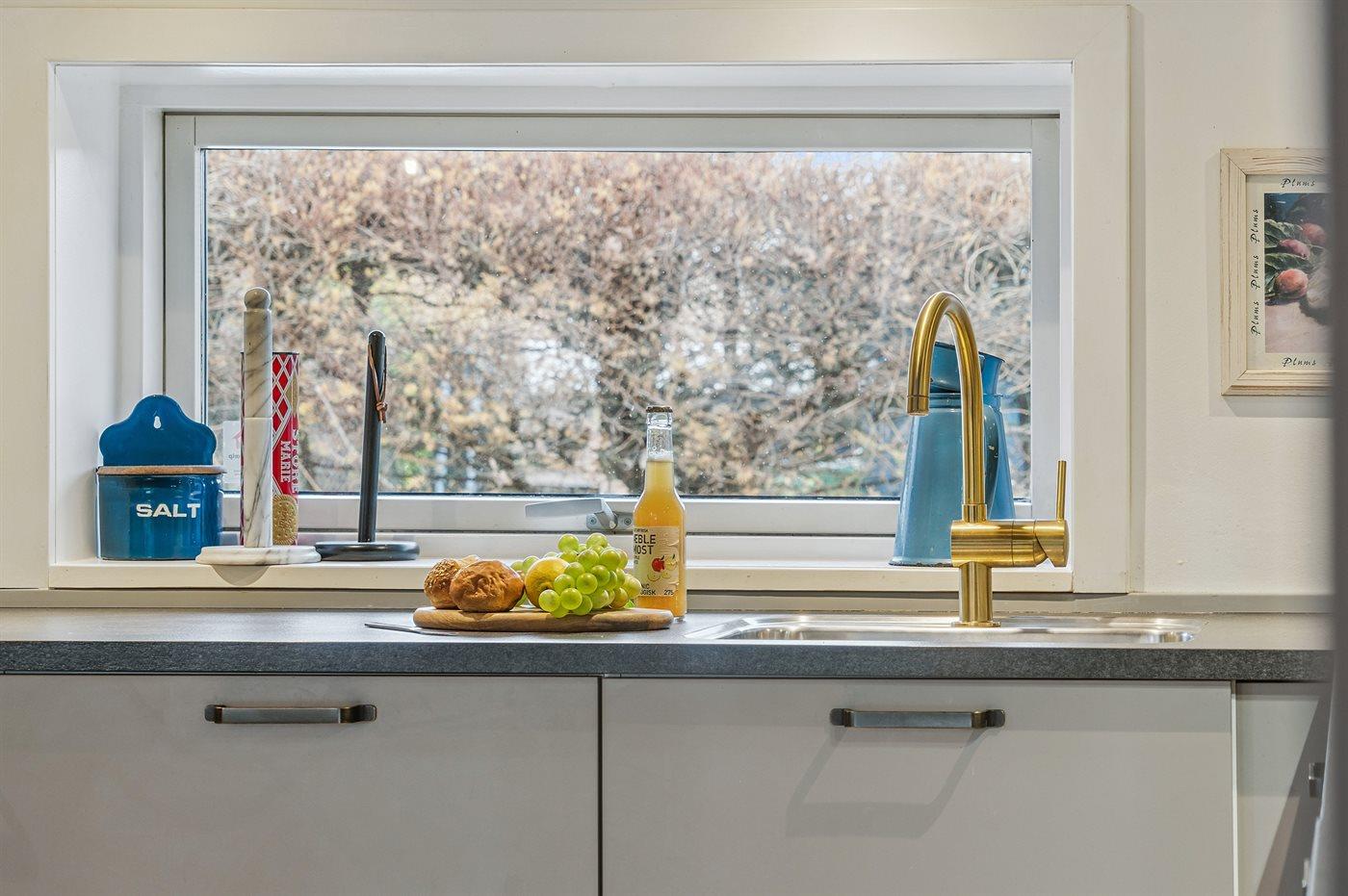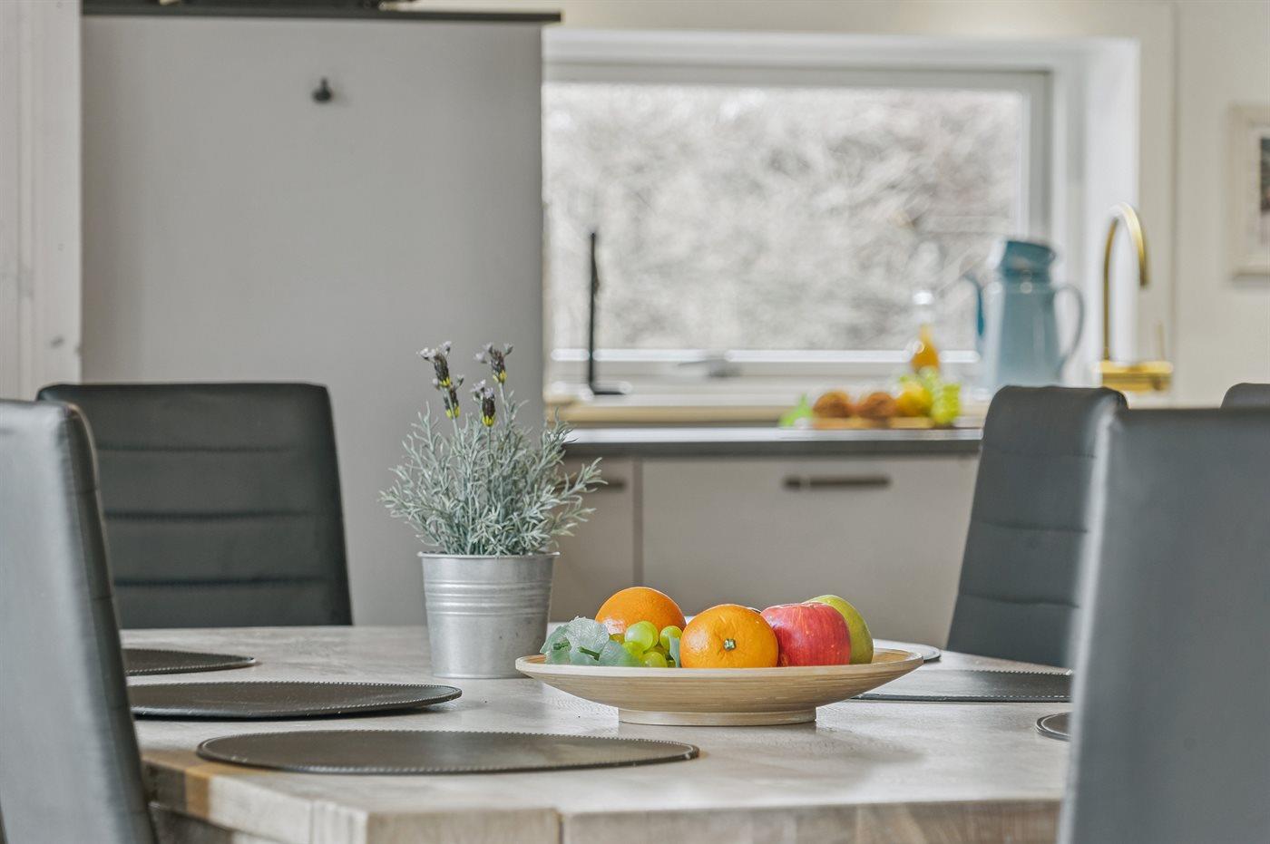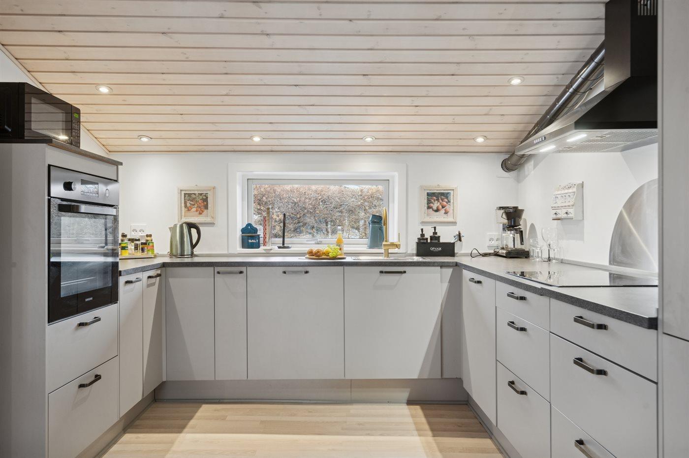 Køkkenet er udstyret med 1 køleskab. Der er 4 induktionskogeplader, varmluftovn samt opvaskemaskine.