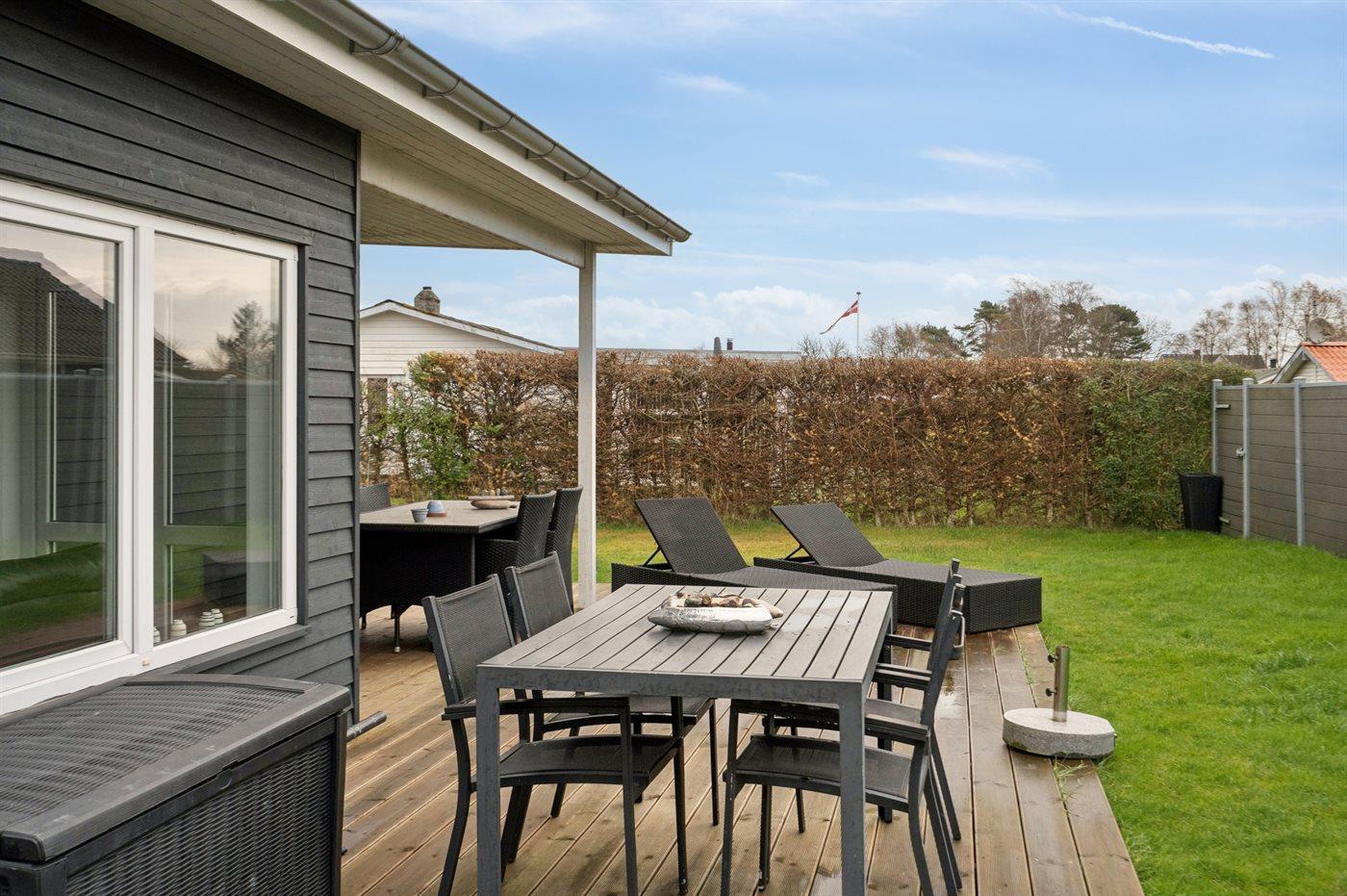 Ferieboligen er beliggende på en 552 m² stor havegrund. Grunden er indhegnet. Der er 275 m til havet. Nærmeste forretning er beliggende i en afstand af 3000 m. Til ferieboligen hører åbent terrasseareal. Desuden er der overdækket terrasse. Parkering ved ferieboligen.