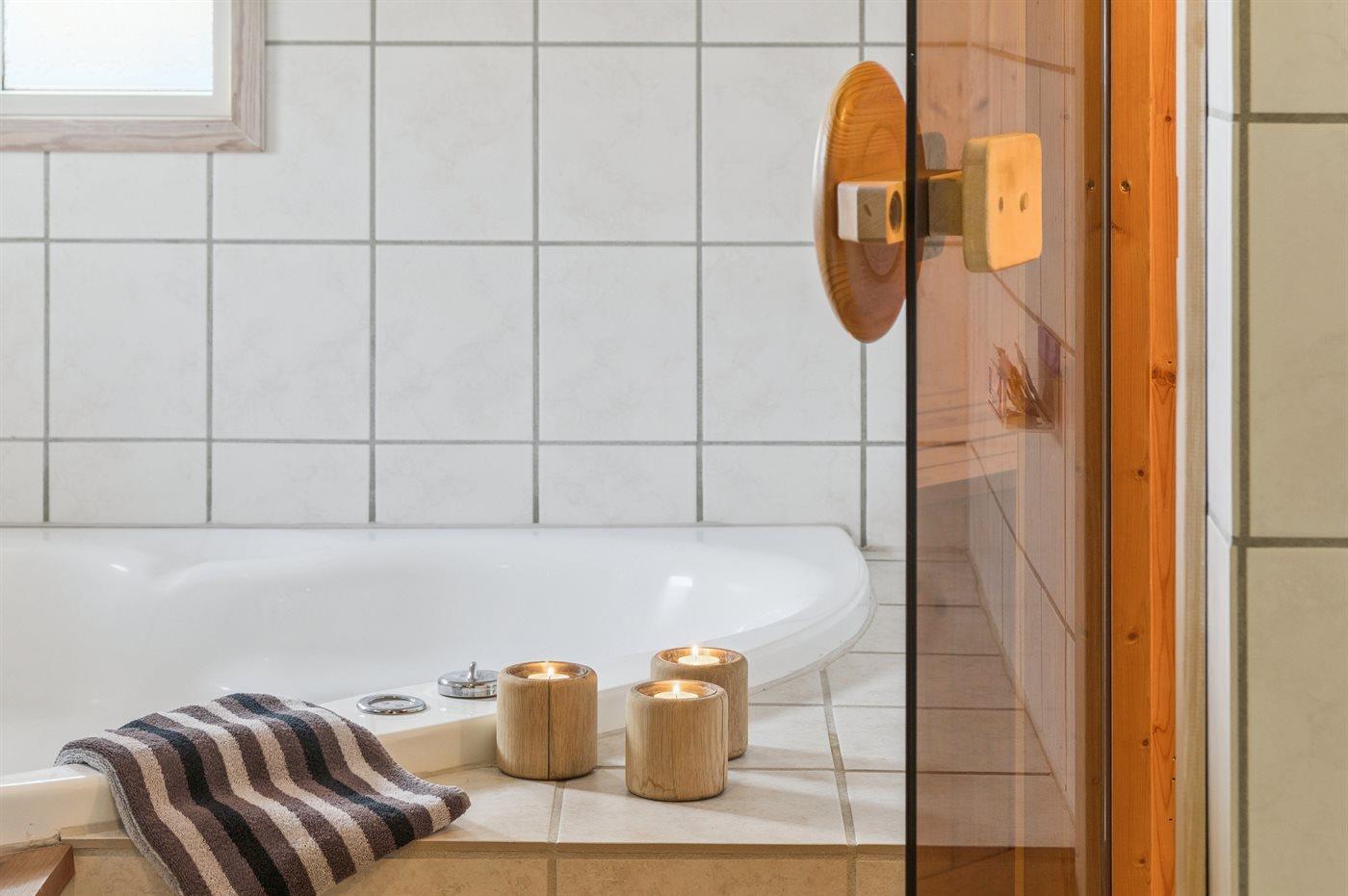 Der er 2 badeværelser med bruseniche og 2 toiletter. Der er gulvvarme på 2 badeværelser. I saunaen er der mulighed for afslapning.