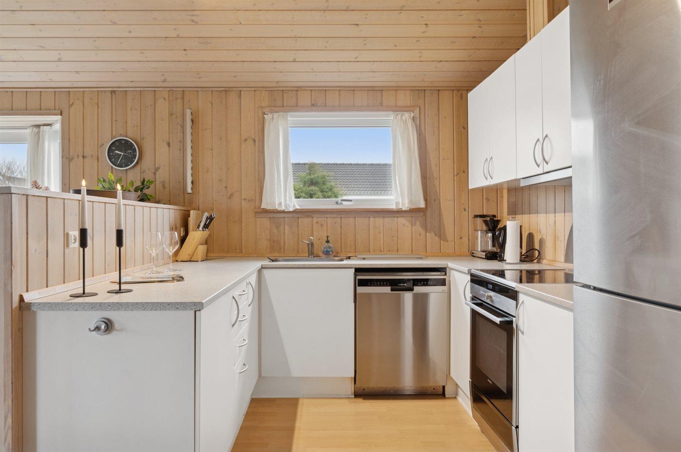 Køkkenet er udstyret med 1 køleskab. Der er 4 induktionskogeplader, varmluftovn, mikrobølgeovn samt opvaskemaskine.