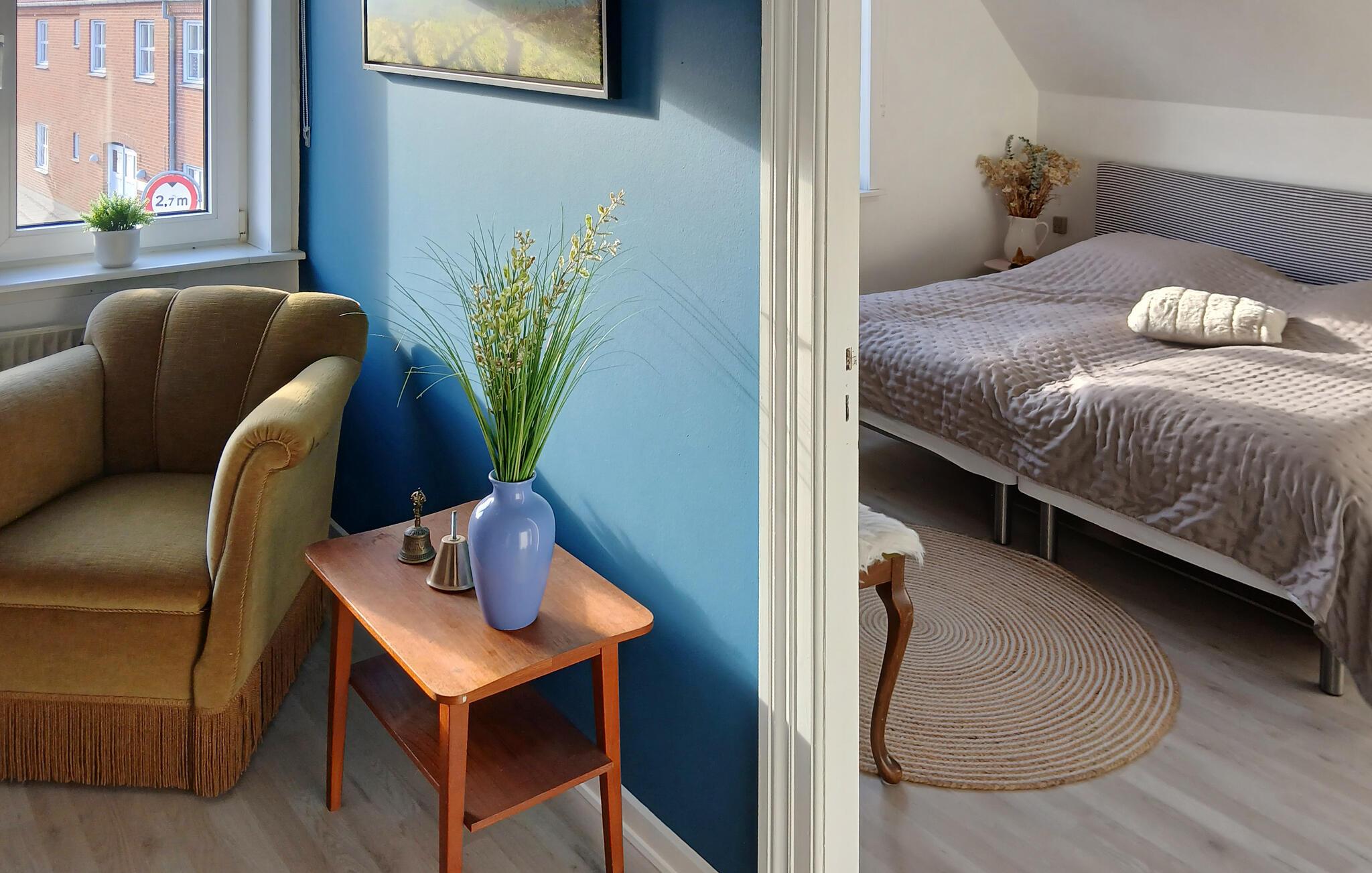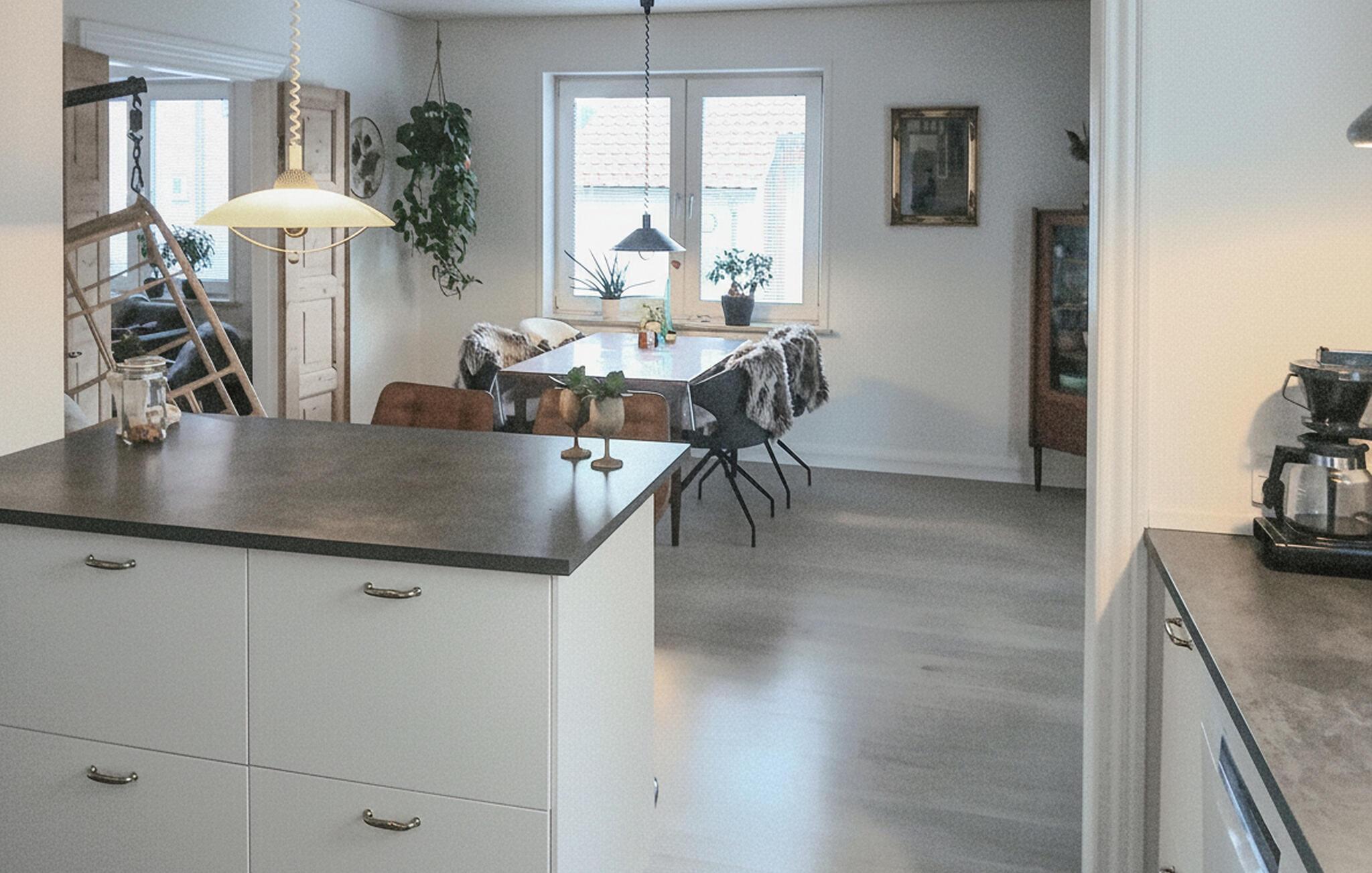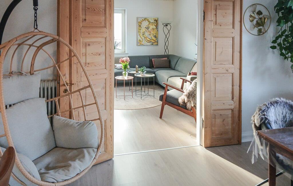 Træd indenfor og lad jer byde velkommen i dette velindrettede feriehus. Læn jer tilbage i den stilfulde stue, der er møbleret med en stor hjørnesofa, varme farver og dekorative detaljer. Her finder I masser af plads til at slappe af, læse eller se tv. Udnyt den åbne planløsning, der forbinder spiseområdet, og lav mad i det moderne køkken, der er udstyret med funktionelle apparater og en stor bordplade. Dekorative detaljer som den flettede hængestol og de smukke trædøre tilføjer et særligt præg til interiøret og skaber en indbydende atmosfære.