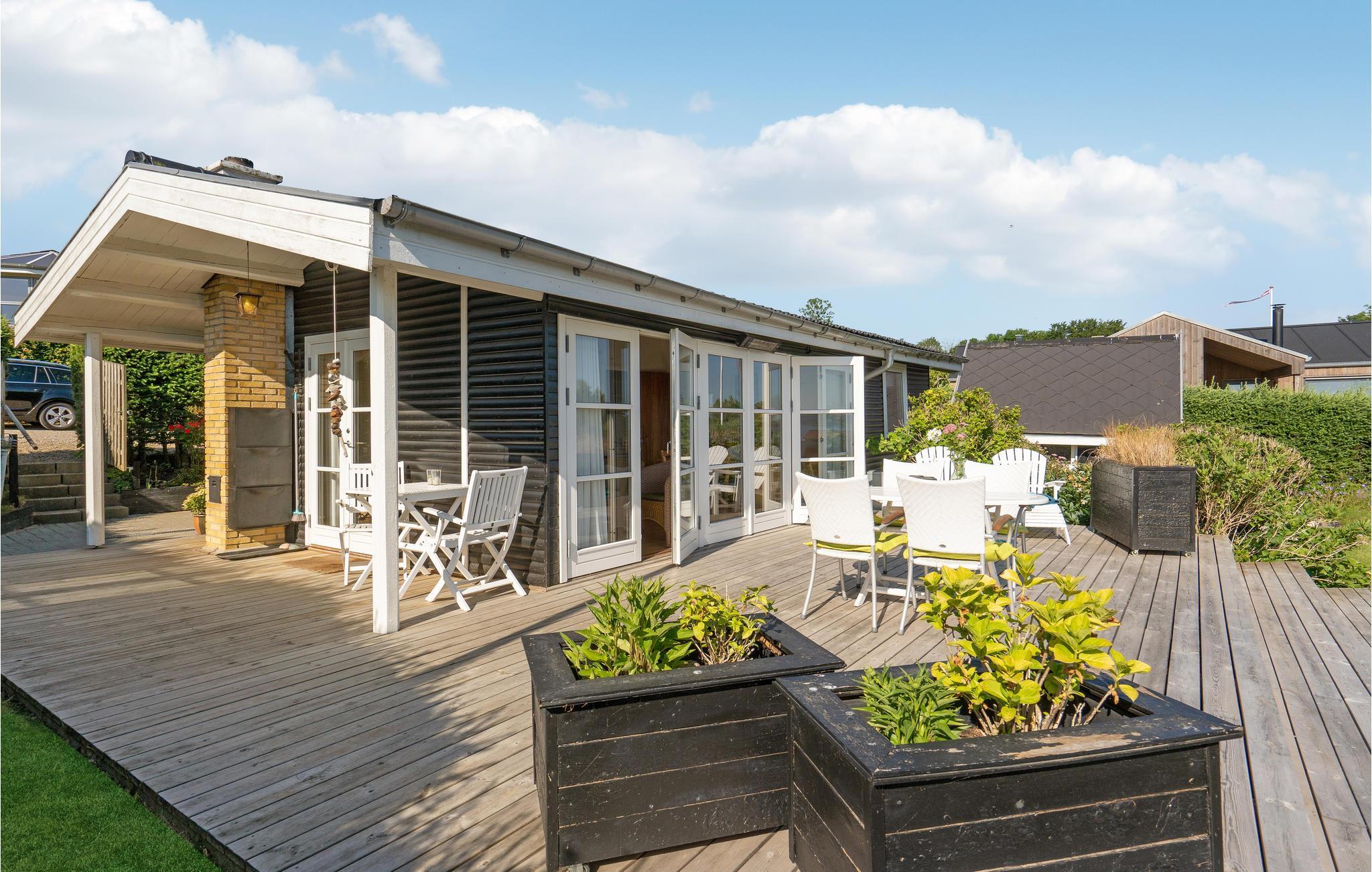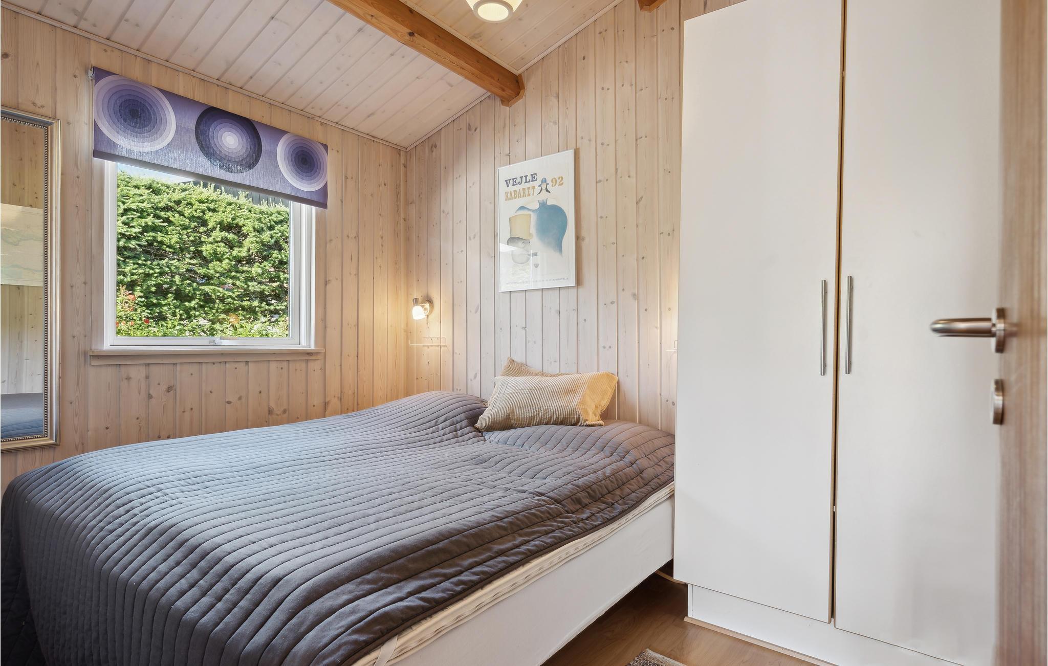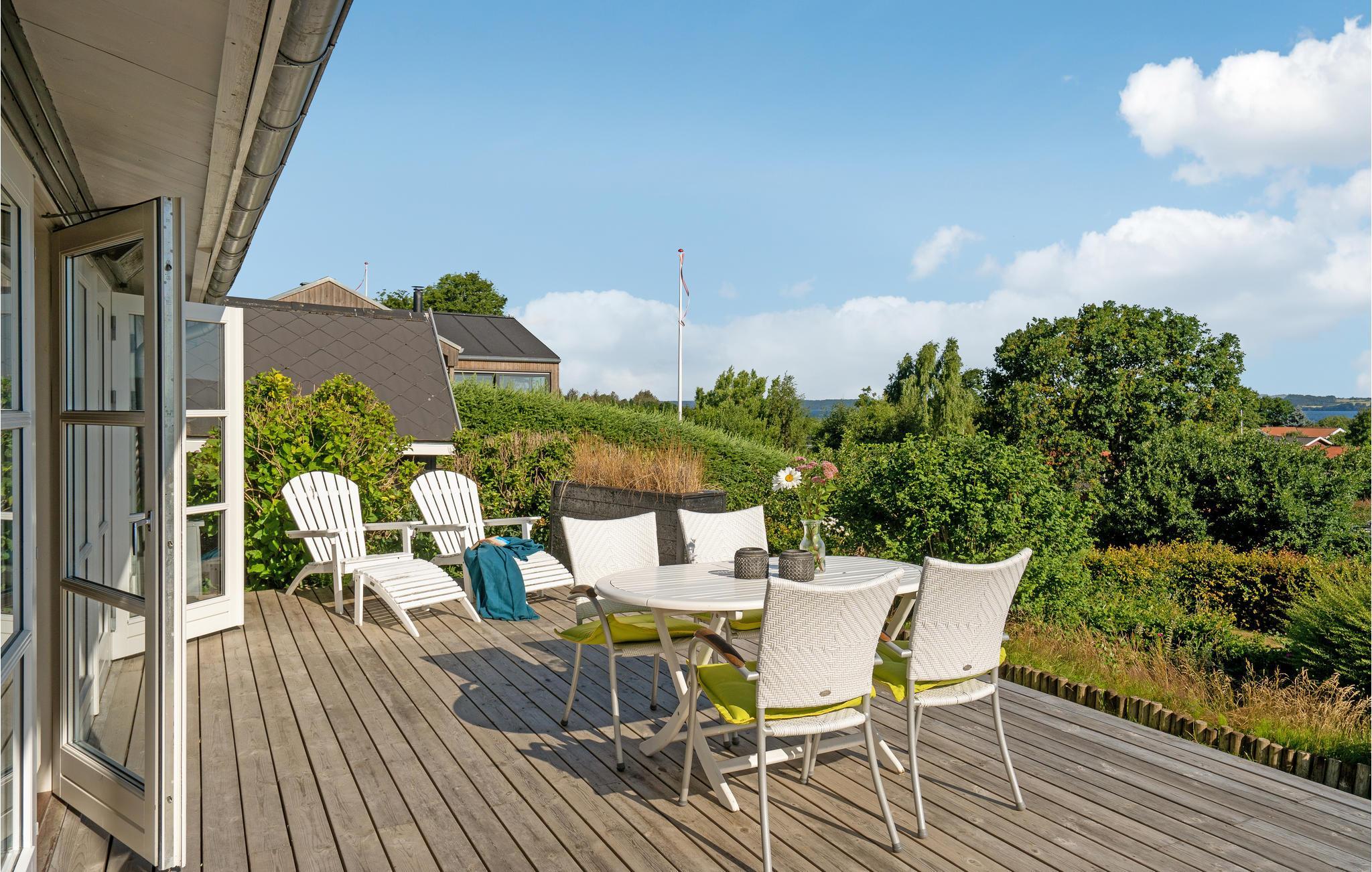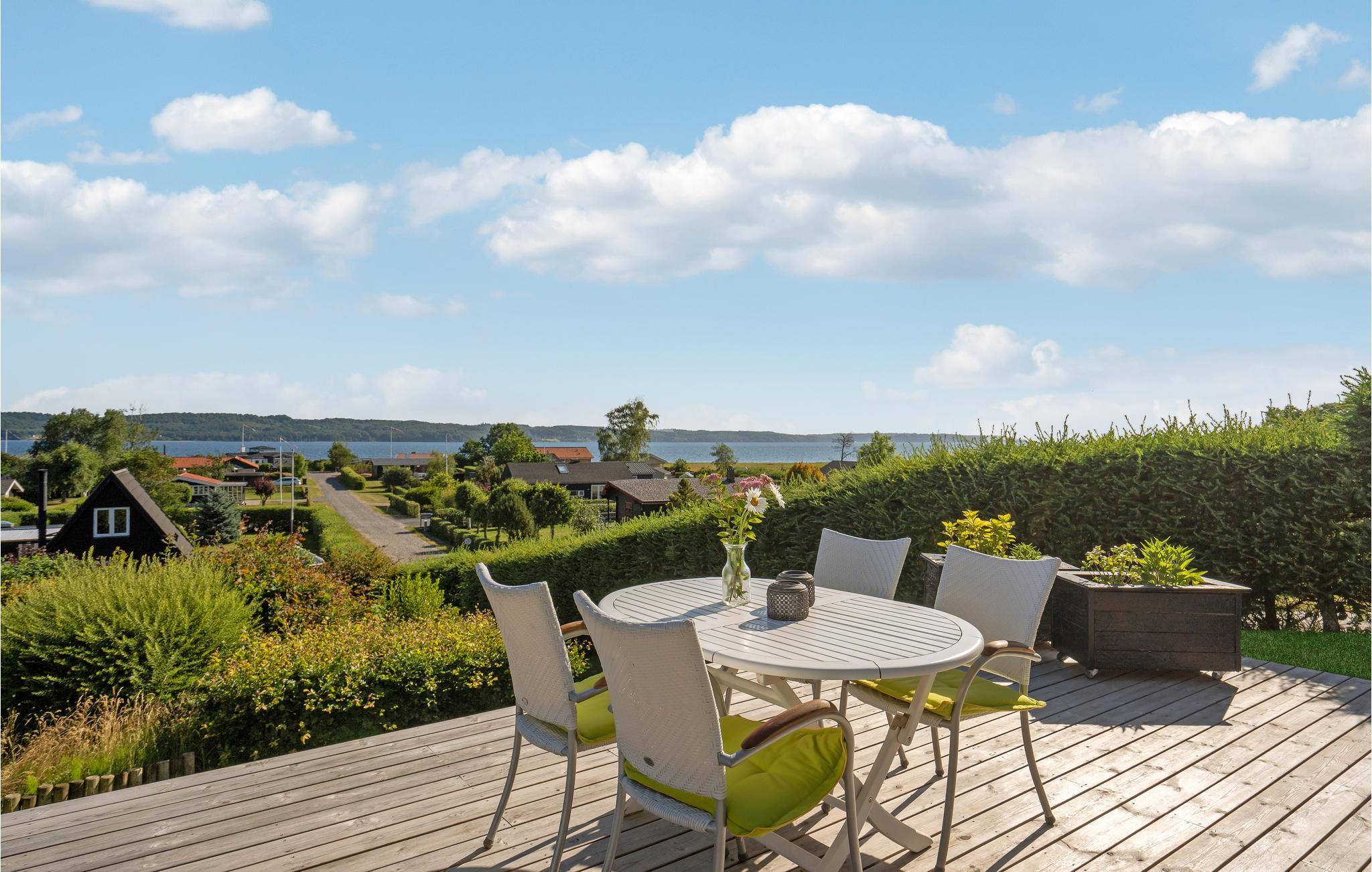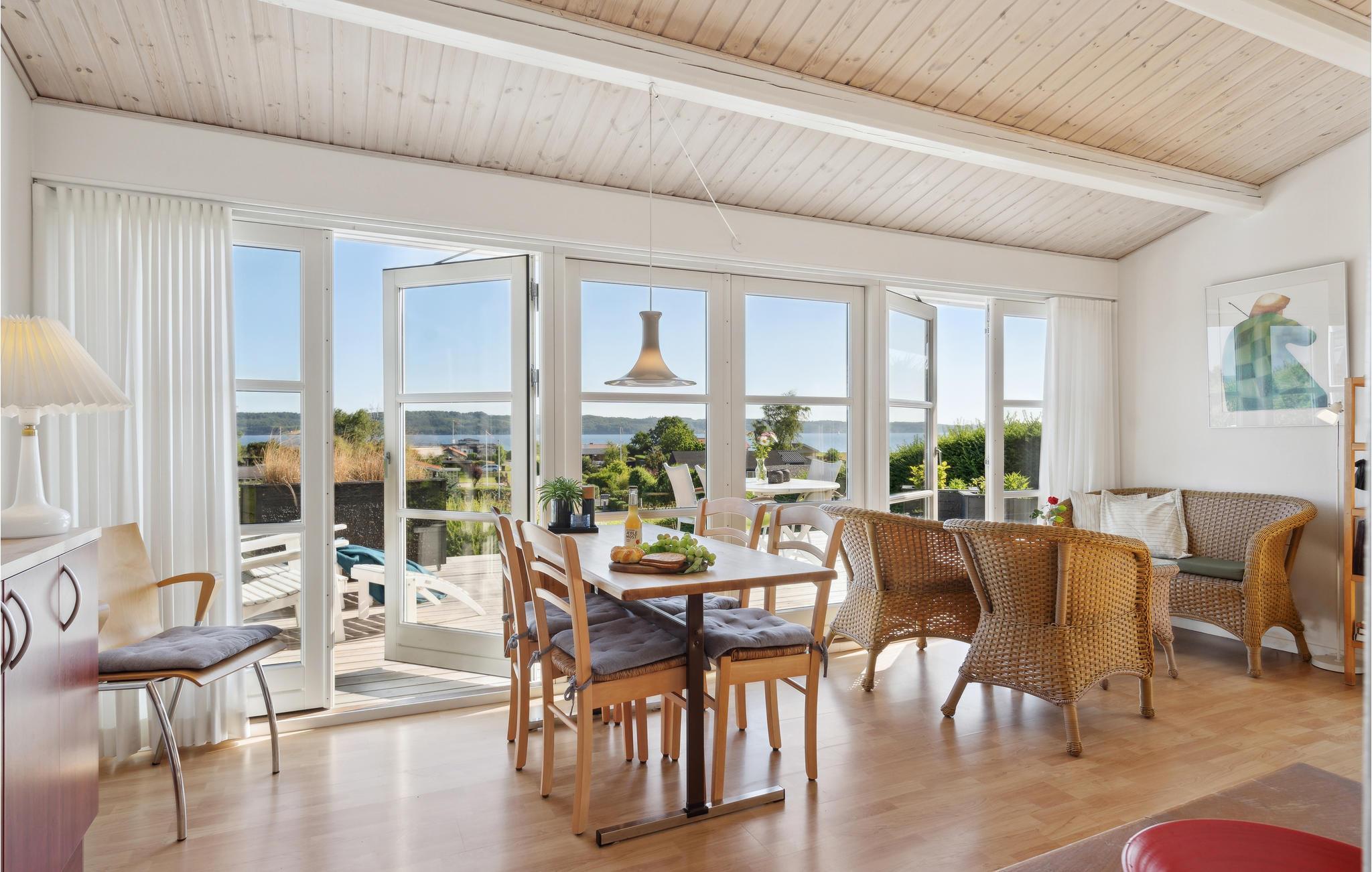 Dette feriehus ligger på en charmerende lille bakketop med en smuk udsigt over den sydlige del af Vejle Fjord. Huset byder på en lys og hjemlig atmosfære, og det store vinduesparti i stuen lukker en masse dagslys ind og skaber en følelse af harmoni. Nyd såvel dejlige familiemåltider med udsigt over vandet som også solnedgangen i den tilstødende hyggekrog med rattanmøbler. Sæt jer godt til rette på sofaen efter en begivenhedsrig dag og se en god film. Der er flere dejlige steder på grunden, hvor I kan nyde hyggelige timer. Nyd en kop kaffe på terrassen, når I kommer tilbage fra stranden. Inden da kan I skylle sandet af under den udendørs bruser. Mærk ferielykken strømme igennem jer, når I sidder i strandkurven. Lige om lidt breder duften af sydende grillmad sig rundt i haven. I morgen kan I gå ned til stranden.