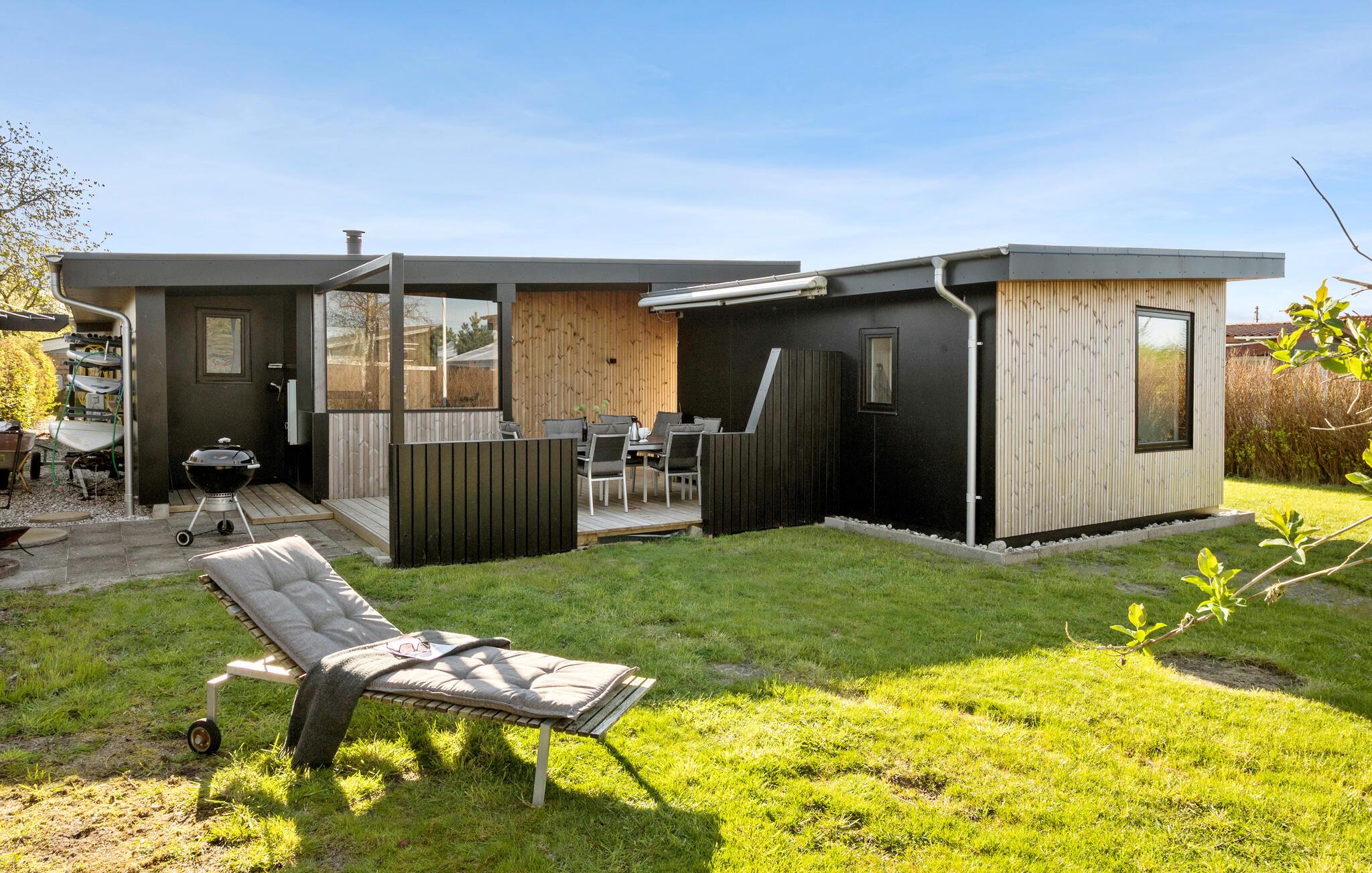 Dejligt træhus med to terrasser og brændeovn nær Vejle Fjord og børnevenlig strand.
