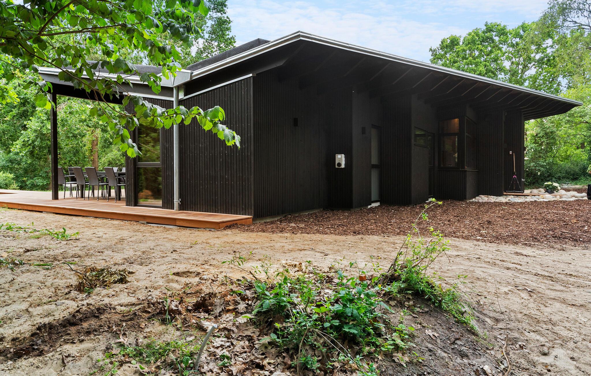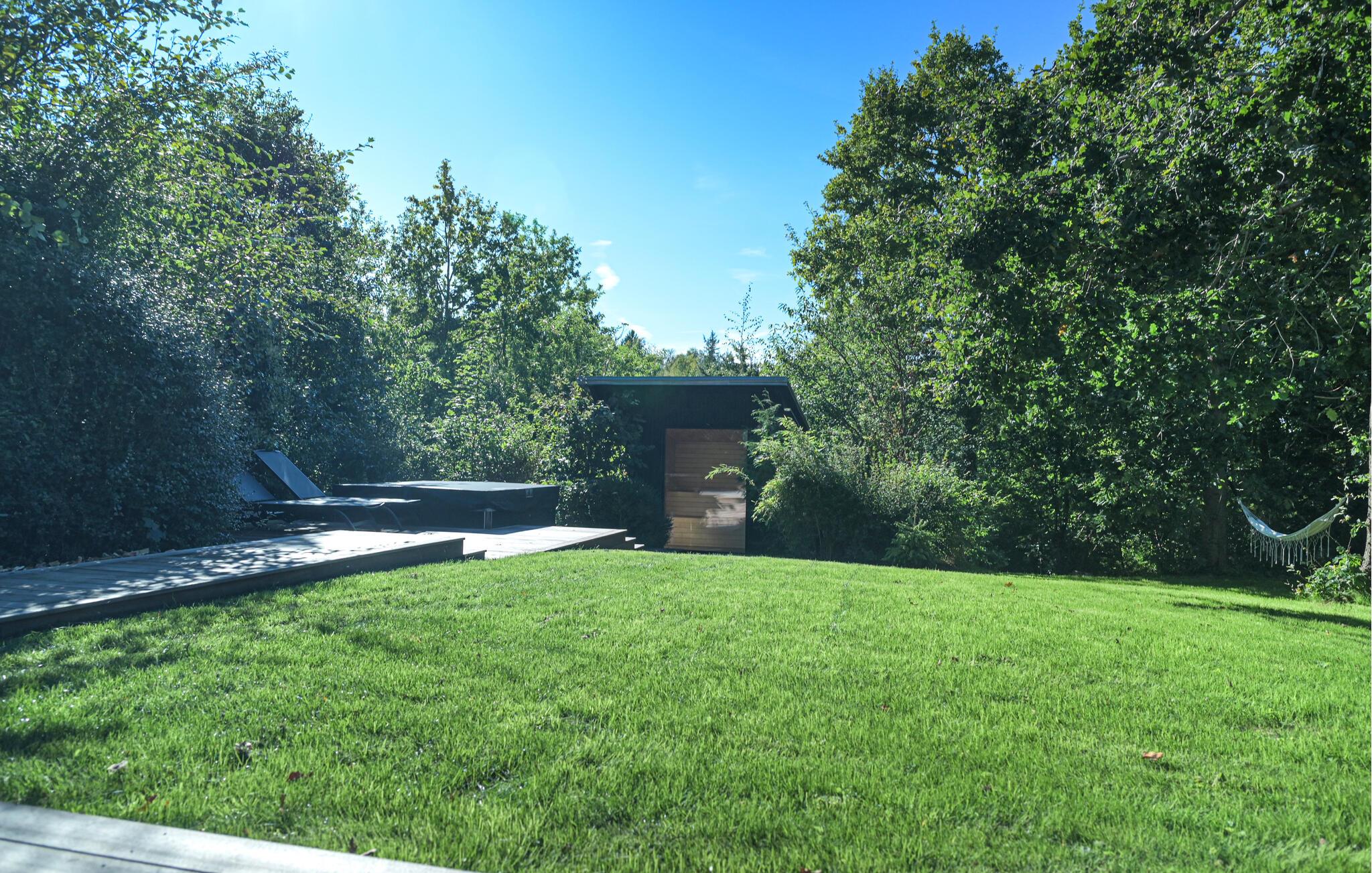 Nyd den store terrasse med forskellige siddemuligheder, et udendørs spabad og en udendørs bruser omgivet af grønne områder. Slap af på de komfortable liggestole med udsigt over de frodige grønne områder. Den overdækkede træterrasse omgiver huset og skaber en behagelig forbindelse mellem inde og ude.