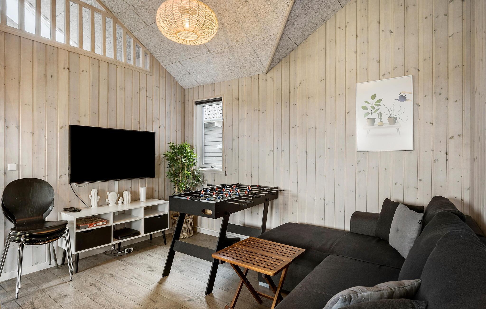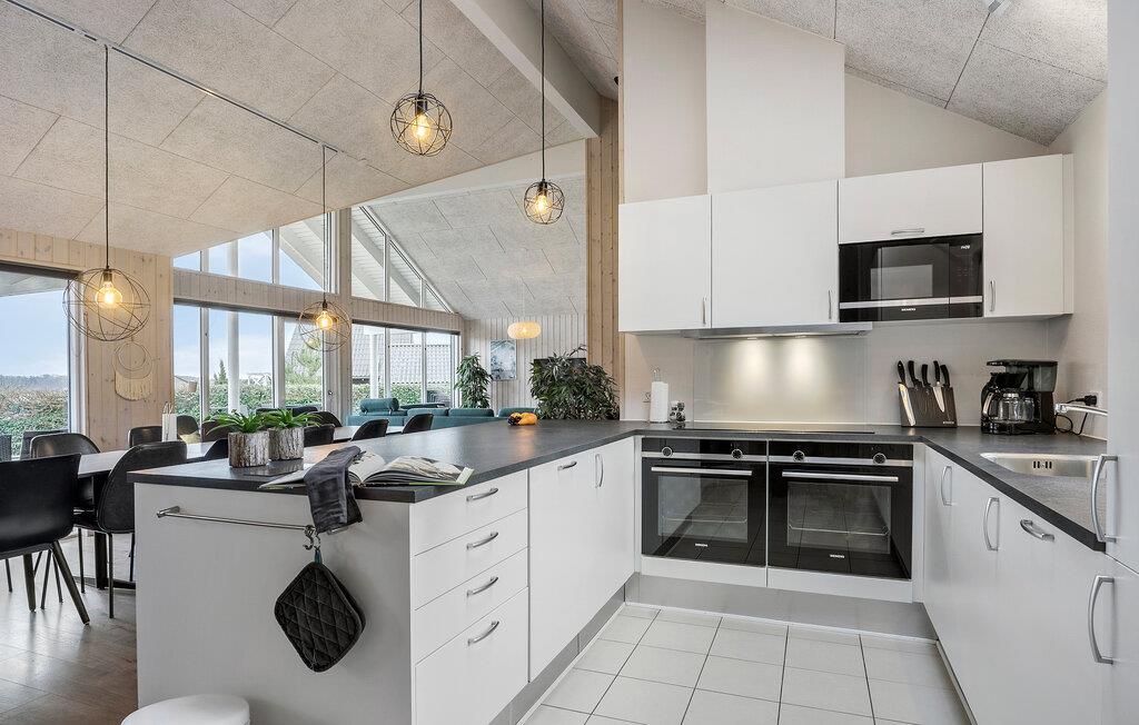 Dette rummelige sommerhus er noget særligt med sensationelle faciliteter, som I kan nyde med jeres venner eller udvidede familie. Glæd jer til hyggelige madlavningsaftener i det moderne køkken og harmoniske måltider ved det lange spisebord. Forkæl jer selv med hyggelige stunder i poolen, saunaen eller spabadet, og kom sammen til en filmaften i den hyggelige stue, mens brændeovnens knitren giver ekstra komfort.