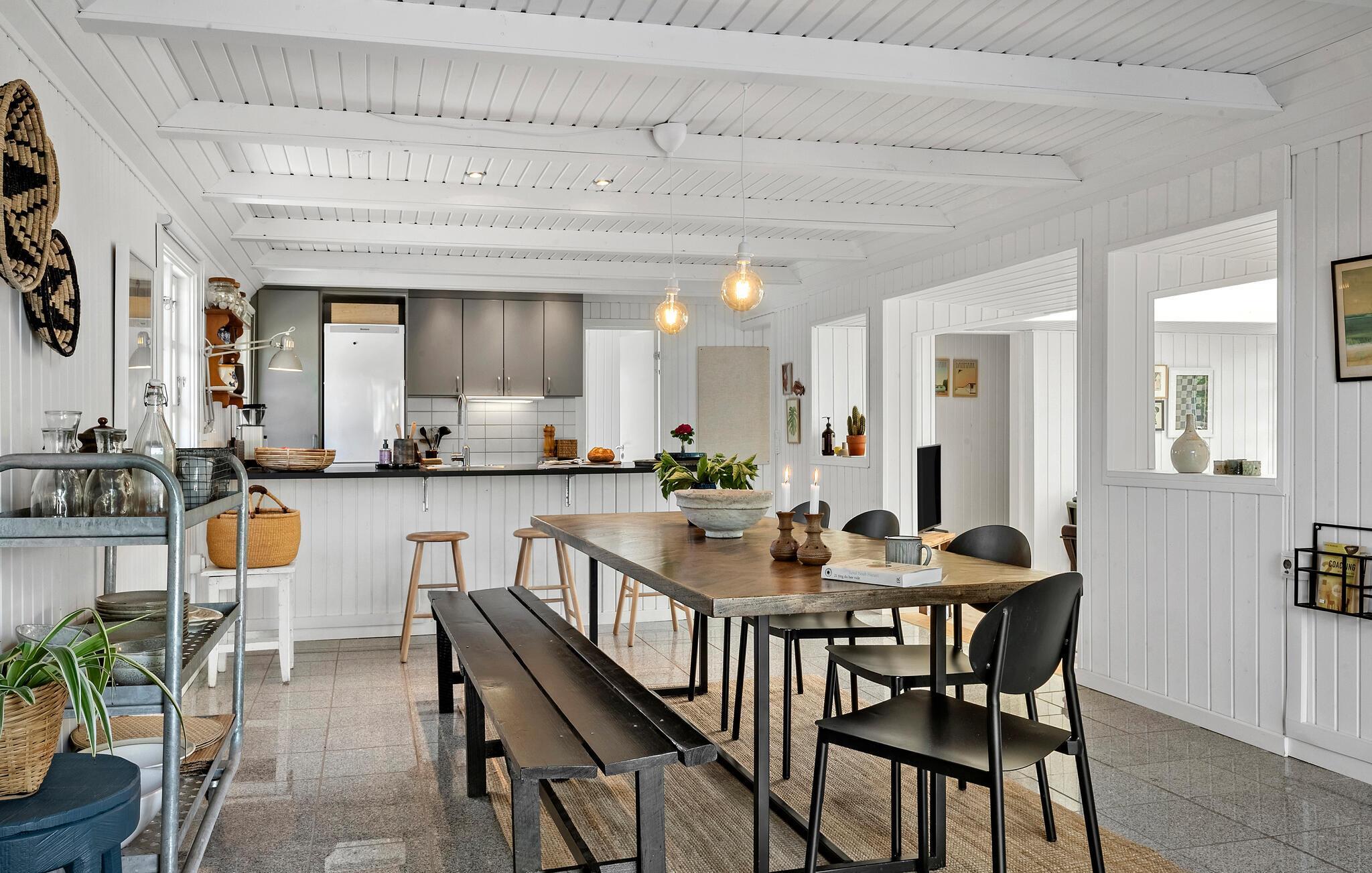 Nogle få skridt fra stranden byder dette lyse og stilfuldt møblerede stråtagshus jer velkommen med masser af naturskønt lys og en vidunderlig udsigt over den frodige have. Her kan I trylle lækre retter frem med friske ingredienser fra gårdbutikken og lade den beroligende duft af naturen fylde værelserne, mens I nyder jeres måltider. Forkæl jer selv med stille læsning ved brændeovnen eller brug den hyggelige stue til gode snakke over et glas vin.