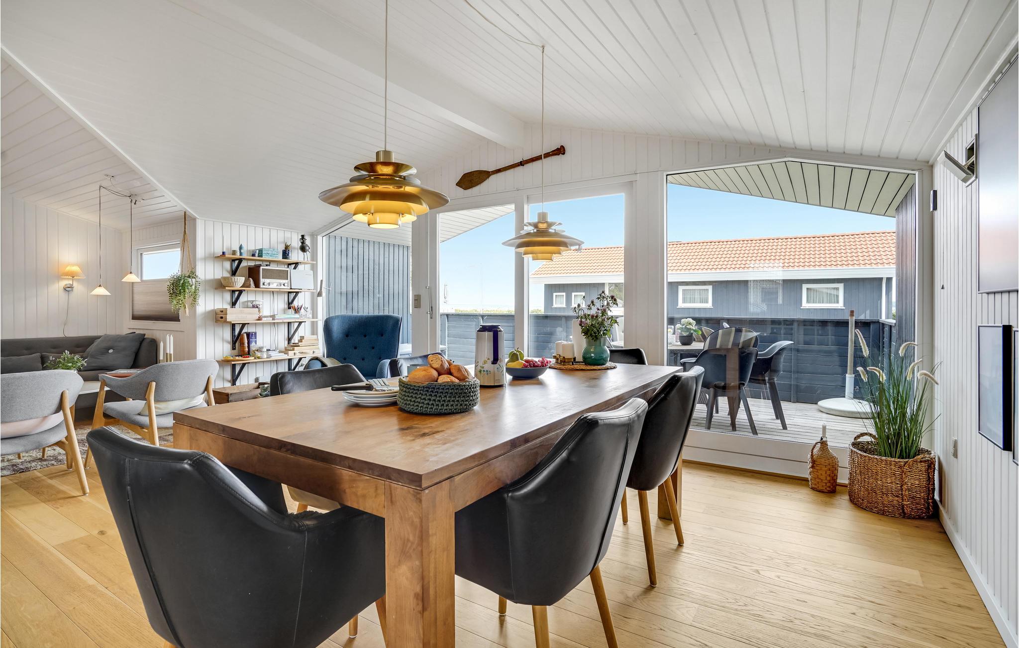 Velkommen til dette moderne og pænt indrettede feriehus med havudsigt, en dejlig terrasse og en privat have. Husets hjerte er den rummelige og lyse spise- og opholdsstue med brændeovn og TV. Her kommer I til at tilbringe mange hyggelige stunder sammen. Den åbne, delvist overdækkede terrasse med havemøbler og grill er det perfekte sted at sidde og nyde solen eller læse en god bog, mens børnene og jeres hund leger, gynger eller rutcher i haven. Om aftenen kan I tænde op i grillen og tilberede et lækkert feriemåltid.