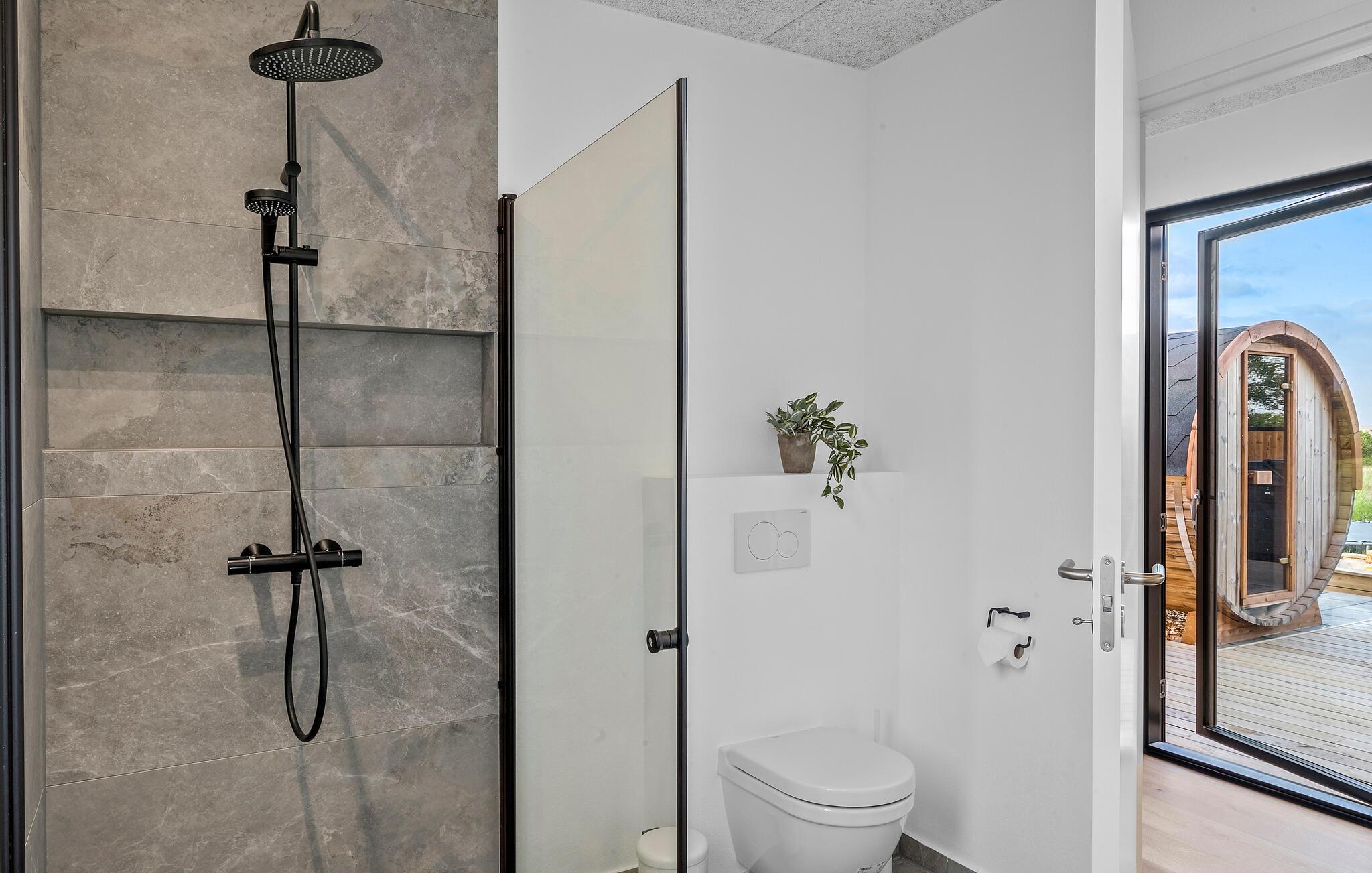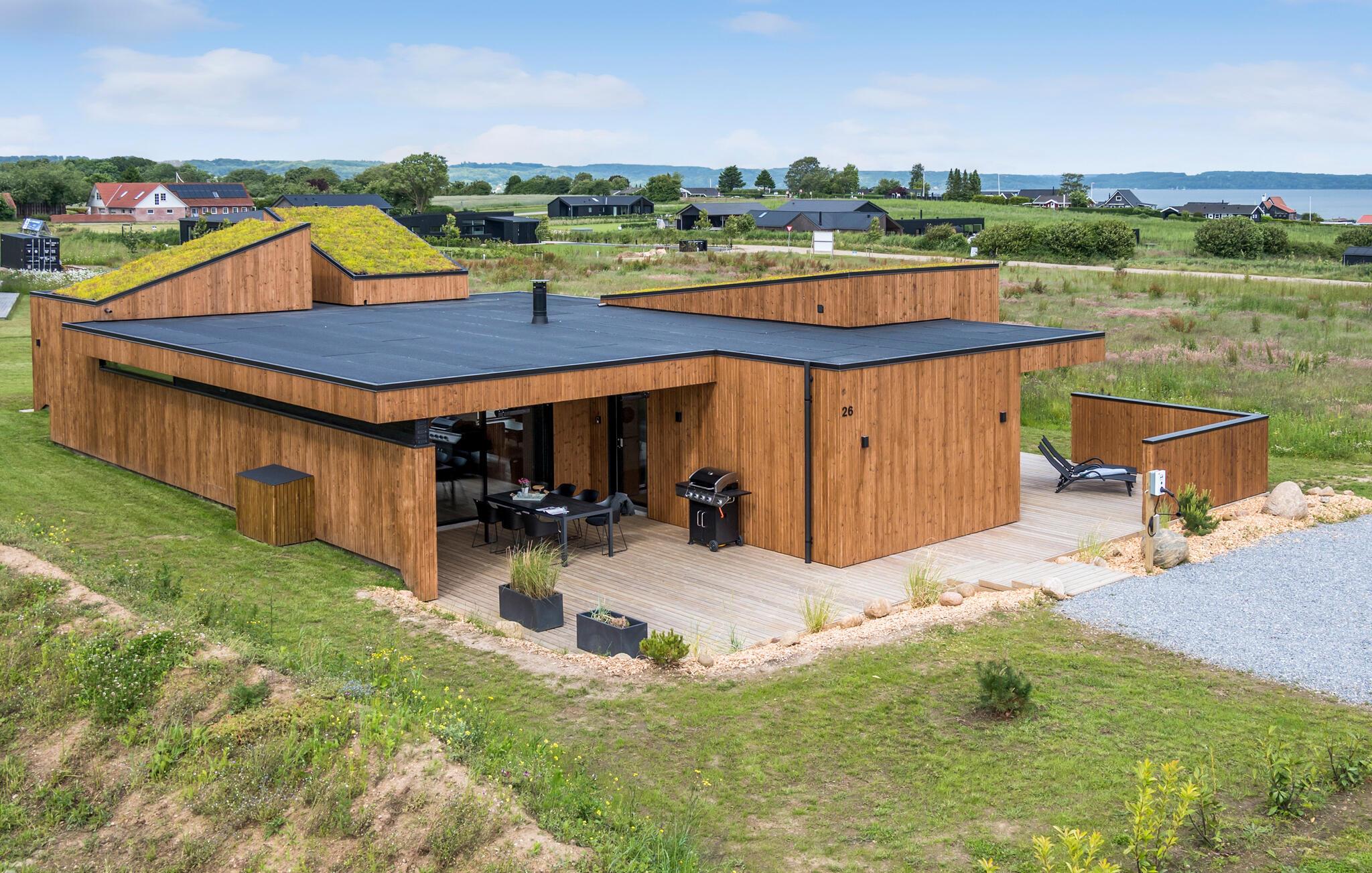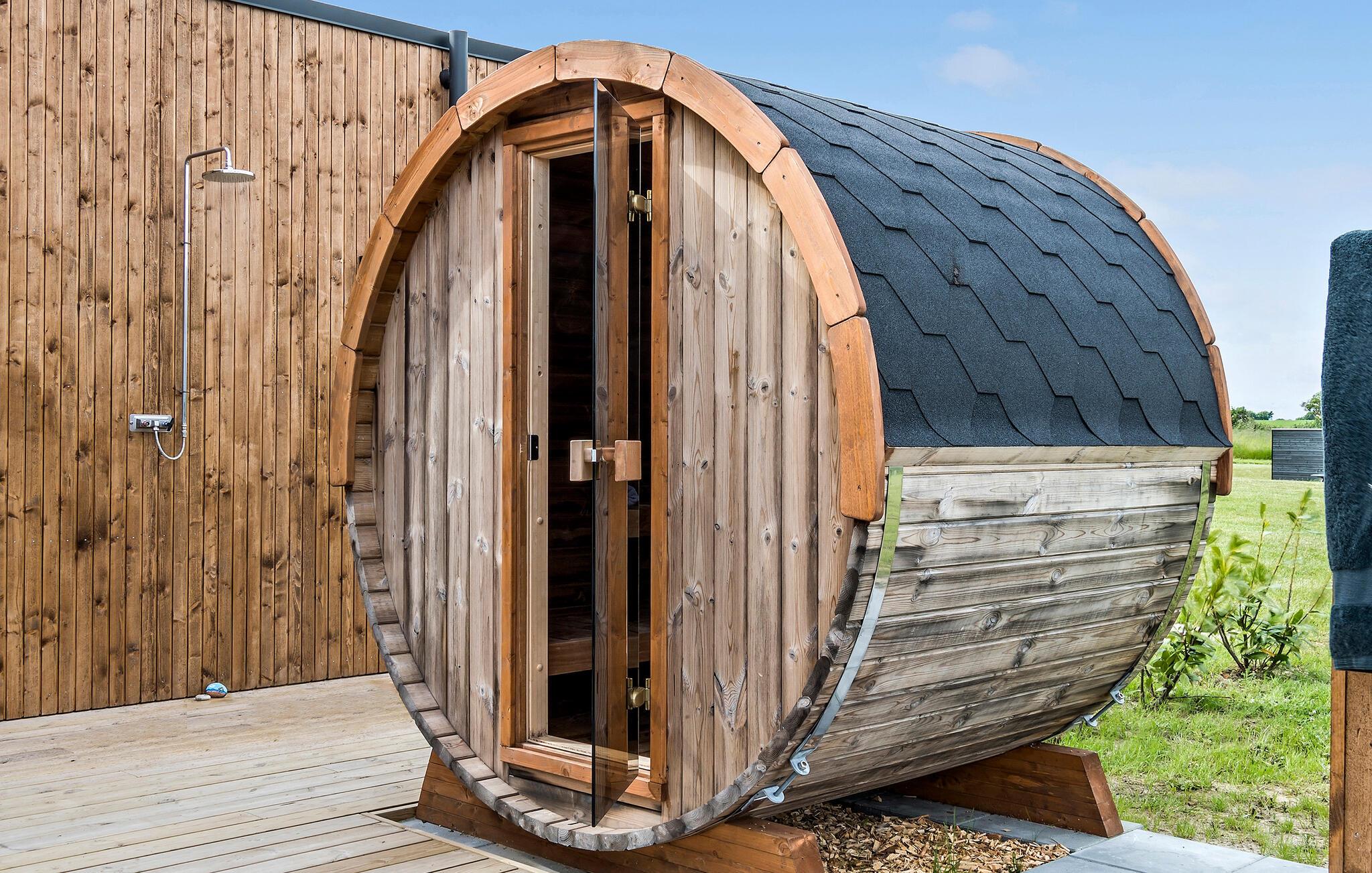Træd ud på den dejlige træterrasse, som har mange fordele. Her er wellness en topprioritet, for terrassen tilbyder både en tøndesauna og et udendørs boblebad til ren afslapning. I kan også tilberede en lækker grillmenu, mens jeres børn leger i haven og hopper på trampolinen.