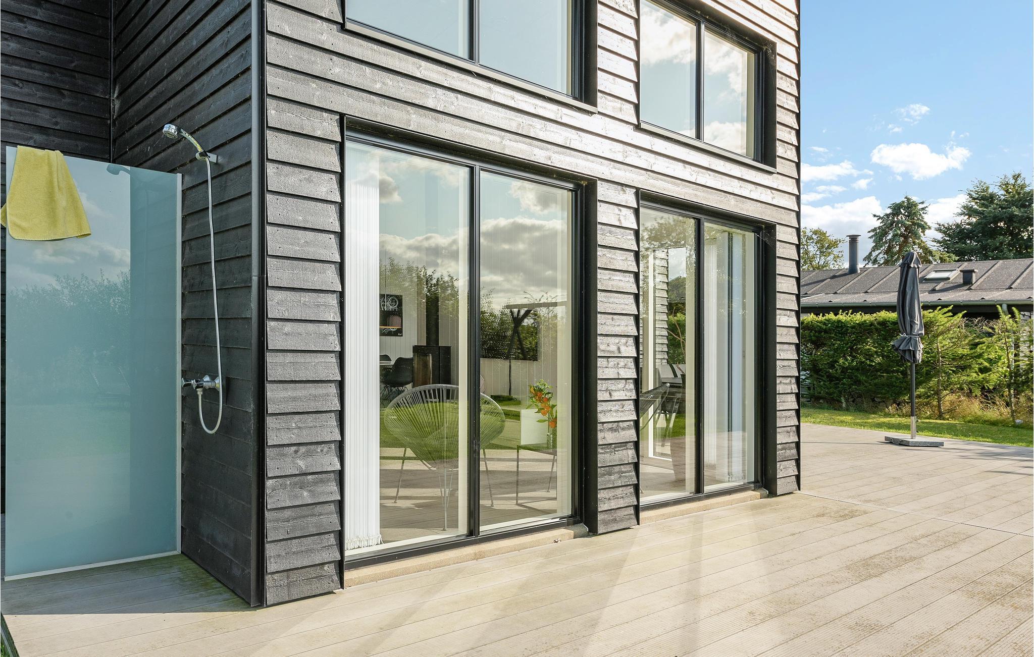 Eksklusivt feriehus ved Hvidbjerg strand med stor terrasse og udsigt over marker.