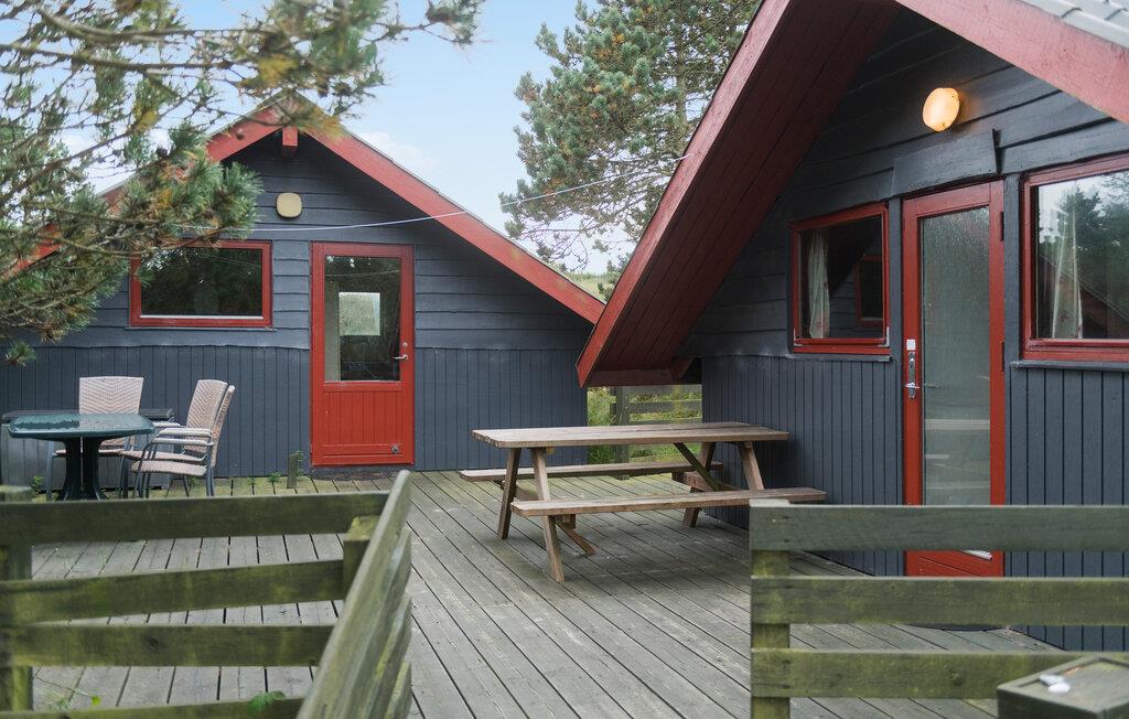Hyggeligt træhus i klitterne nær Hvidbjerg Strand med brændeovn og stor terrasse.