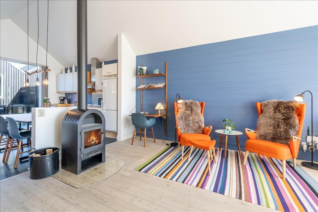 En komfortabel indretning med loft til kip, store vinduespartier samt masser af lys og luft gør dette feriehus til en skøn ramme om fridagene. Begge soveværelser har sengepladser til to personer, og fra det ene er der direkte adgang til solgården, mens det andet har udsigt til fjorden og adgang til terrassen. Ferieboligen rummer også to badeværelser, og mens det ene er indrettet med bruseniche og sauna, byder det andet på spabad. Det veludstyrede køkken og stuen er sammenlagt i ét stort rum med et skønt, gennemstrømmende lys, og både fra spisebordet og sofaarrangementet kan I nyde udsigten til fjorden. Brændeovnen sørger for en behagelig temperatur, og med tv og wi-fi er er underholdningen sikret.