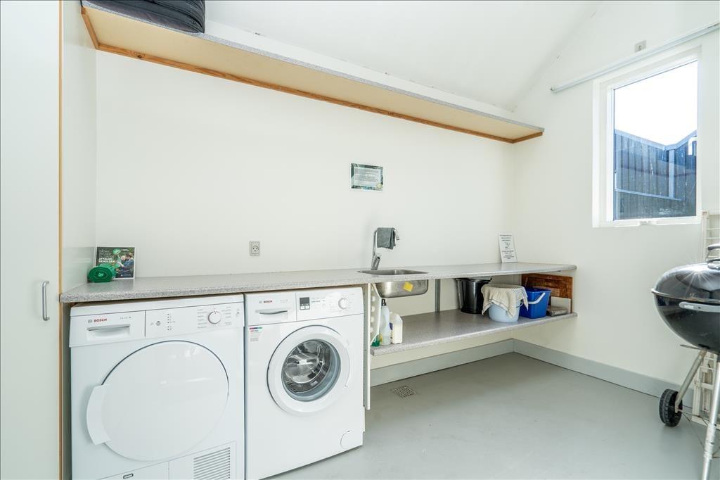Foruden en garage findes her også et udhus med et bryggers, der er udstyret med vaskemaskine, tørretumbler, fryser og et praktisk grovkøkken, hvor lystfiskeren kan rense dagens fangst. Fiskene kan grilles i solgården, der er godt afskærmet og helt ugeneret. Den sydvendte terrasse er stedet, hvor I kan nyde sommerdagene i solsengene, og her har I et pragtfuldt vue til fjordens stille vand og havnens maritime liv.