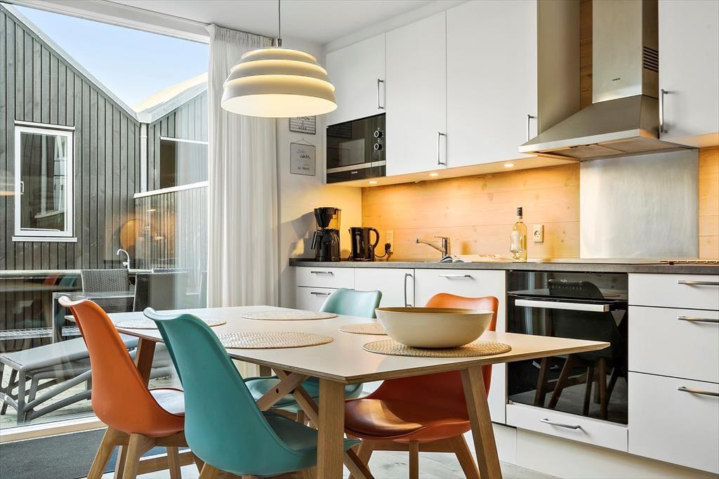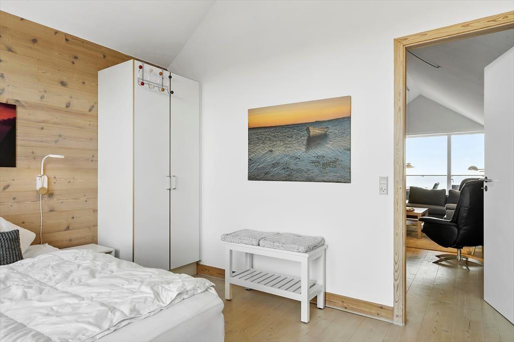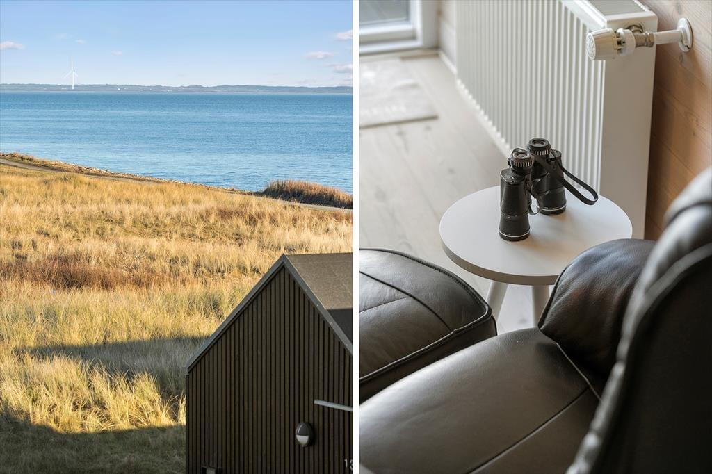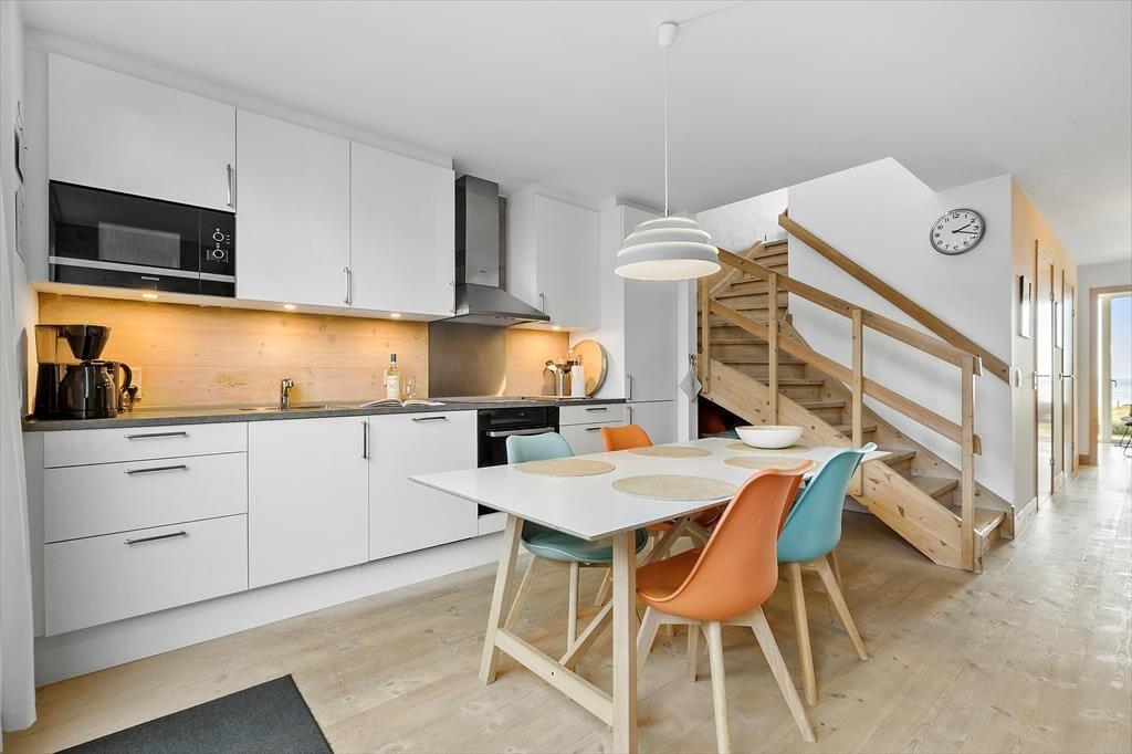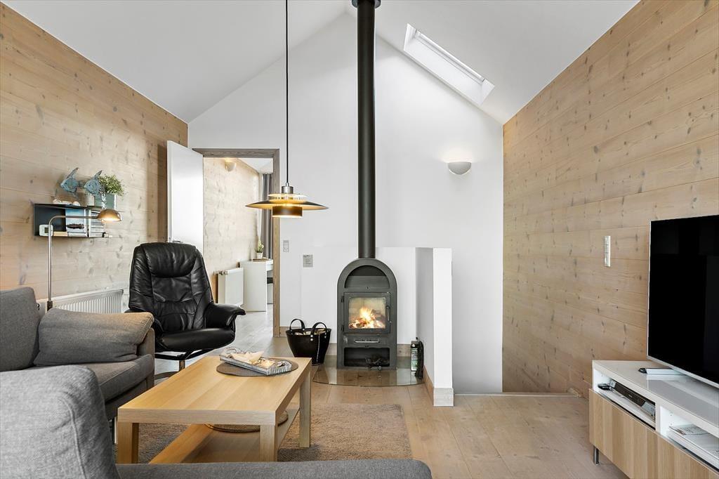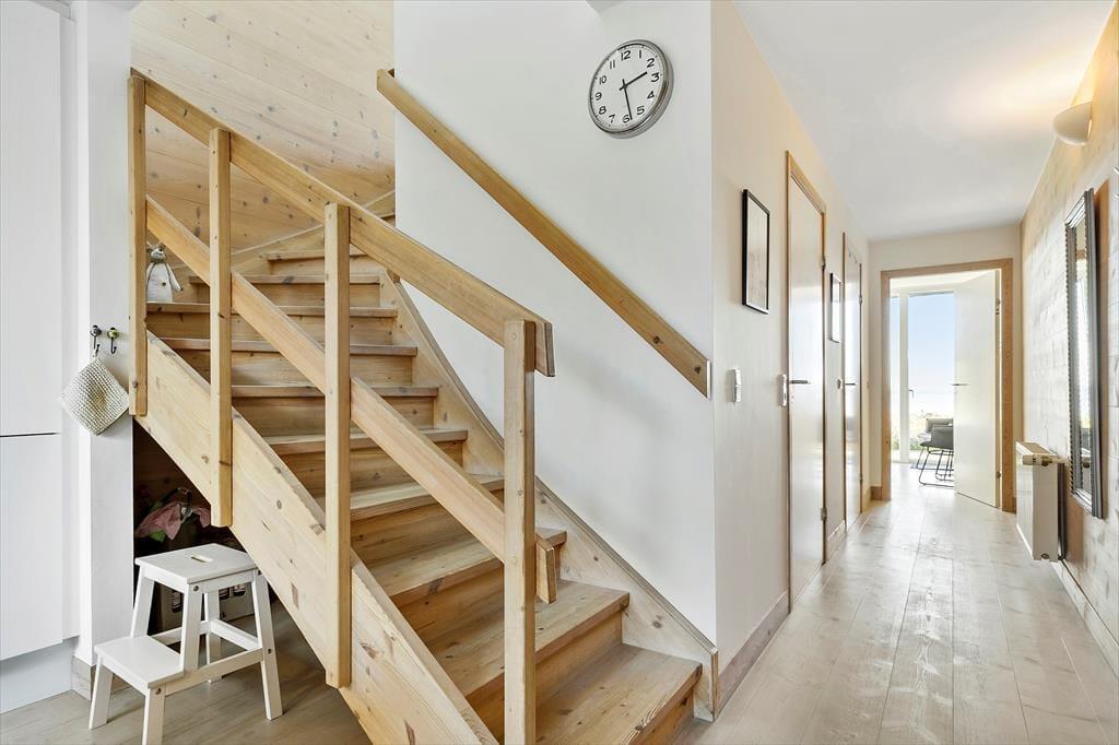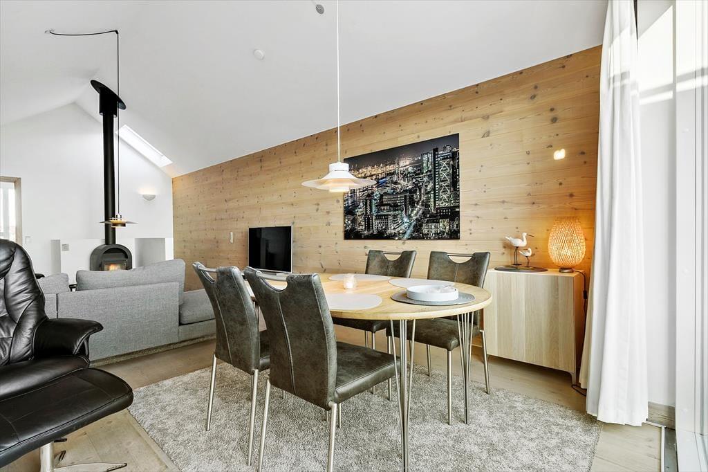 Det 116 m2 store rækkehus er opført i lækre kvalitetsmaterialer, og der er rigtigt kælet for indretningen. Det kan blandt andet ses i stueplanets veludstyrede spisekøkken og på førstesalen, hvor stuen byder på et ekstra spisebord og en komfortabel sofaafdeling nær brændeovnen. Hvis I ikke sidder fordybet foran den store fladskærm, kan I beundre fjordudsigten gennem stuens store panoramavindue – og vuet er for øvrigt stort set lige så skønt fra stueetagens soveværelse. I alt er der to soveværelser i huset, og det andet har fin udsigt mod nord over hustagene. Planløsningen byder også på to badeværelser. Endelig er der et bryggers, og her er der vaskemaskine, tørretumbler, dybfryser og en fiskerenseplads.