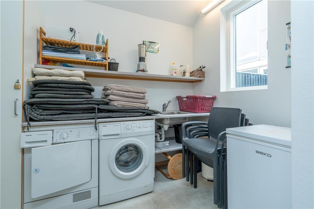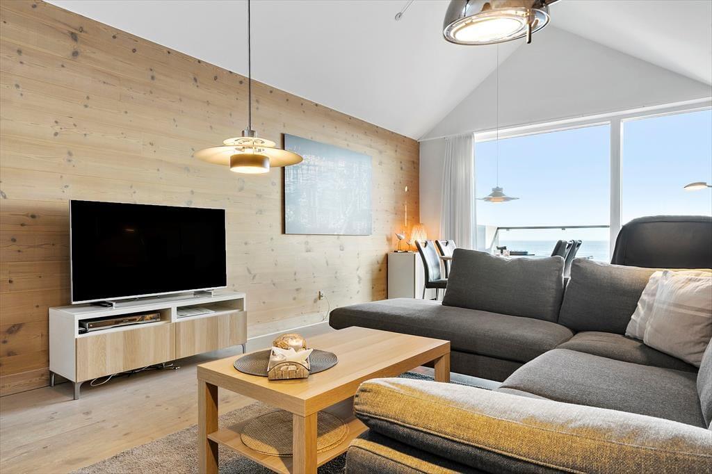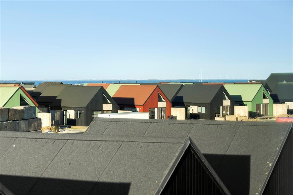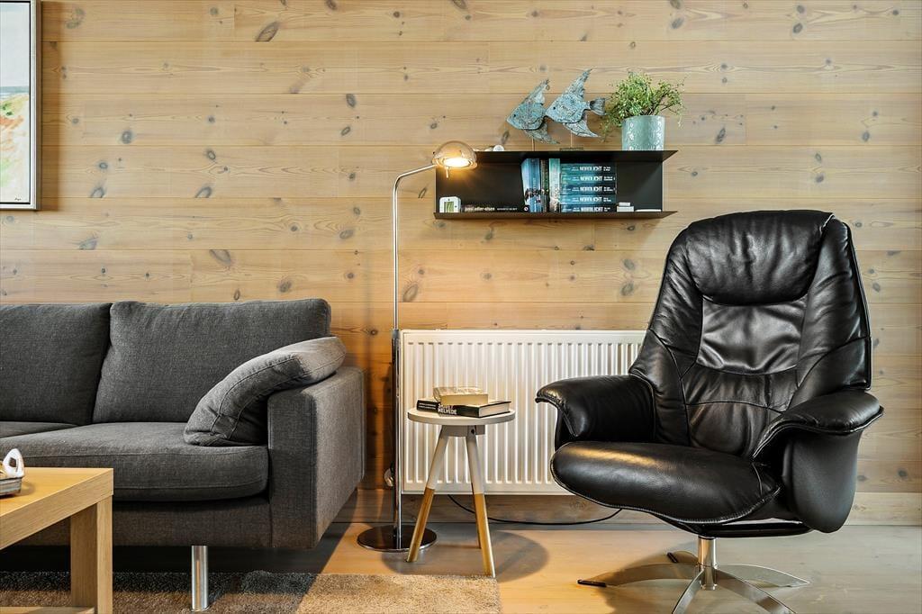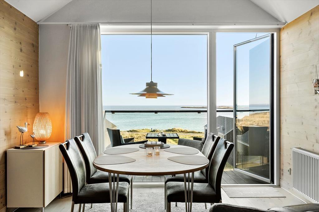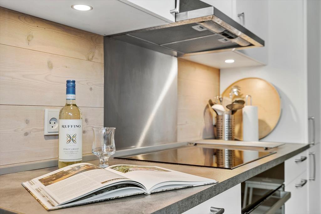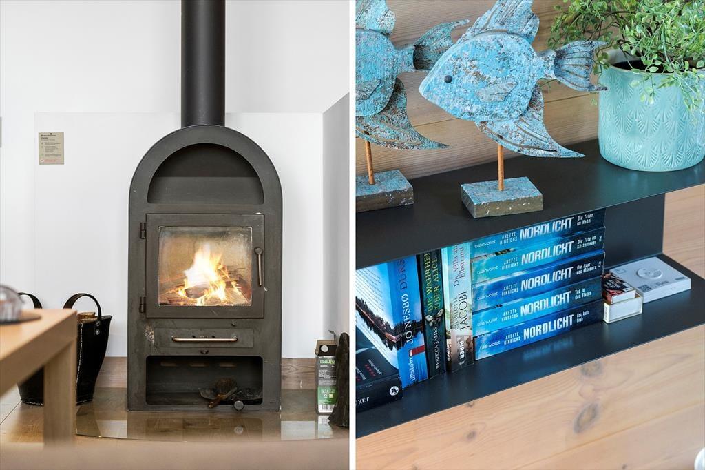 Det 116 m2 store rækkehus er opført i lækre kvalitetsmaterialer, og der er rigtigt kælet for indretningen. Det kan blandt andet ses i stueplanets veludstyrede spisekøkken og på førstesalen, hvor stuen byder på et ekstra spisebord og en komfortabel sofaafdeling nær brændeovnen. Hvis I ikke sidder fordybet foran den store fladskærm, kan I beundre fjordudsigten gennem stuens store panoramavindue – og vuet er for øvrigt stort set lige så skønt fra stueetagens soveværelse. I alt er der to soveværelser i huset, og det andet har fin udsigt mod nord over hustagene. Planløsningen byder også på to badeværelser. Endelig er der et bryggers, og her er der vaskemaskine, tørretumbler, dybfryser og en fiskerenseplads.
