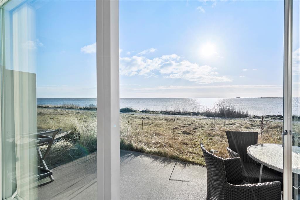 Imellem grovkøkkenet, garagen og selve huset ligger en skøn solgård, der er helt aflukket og derfor dejligt ugeneret. Mod syd kan I sætte jer på terrassen, der ligger så tæt på vandkanten, at I har det skønneste vue over fjordmundingen og dele af byen. Herfra kan I følge med i bådenes sejlads på vandet, og måske får I også øje på sælerne, der nyder godt af de mange fisk omkring slusen.