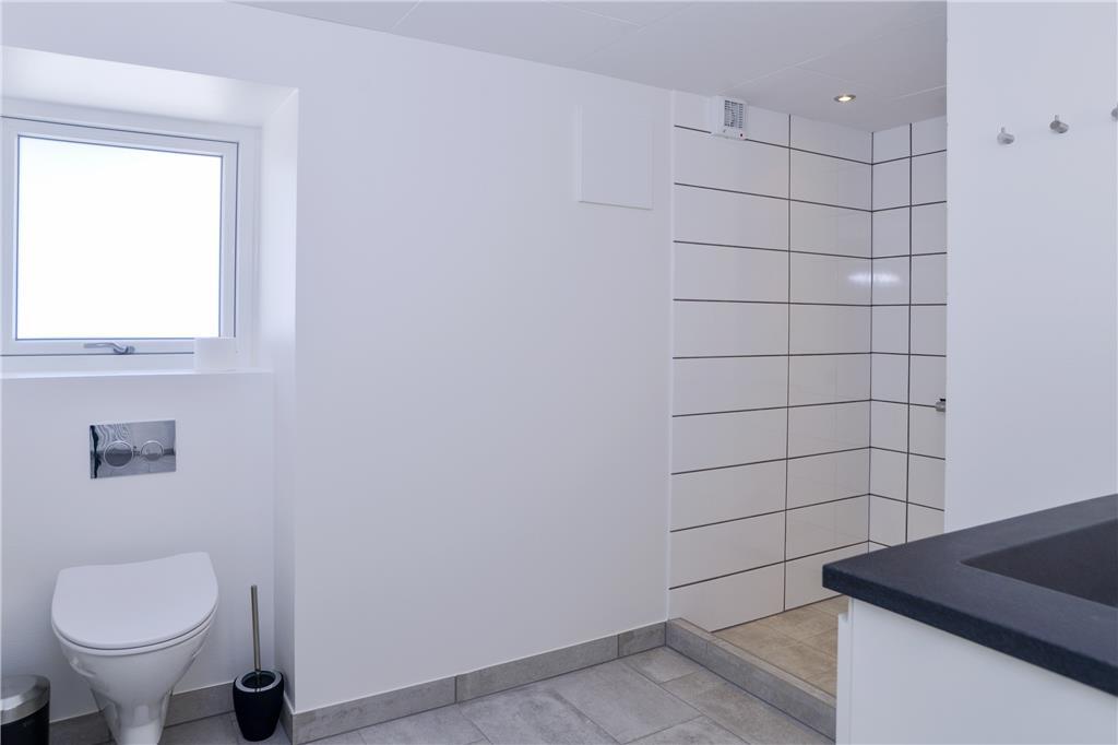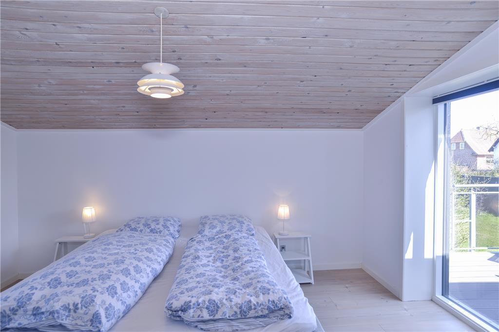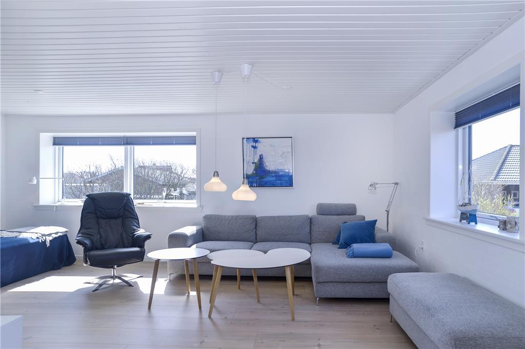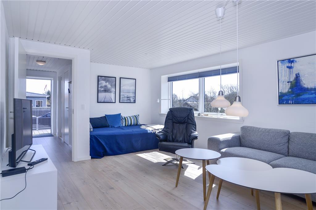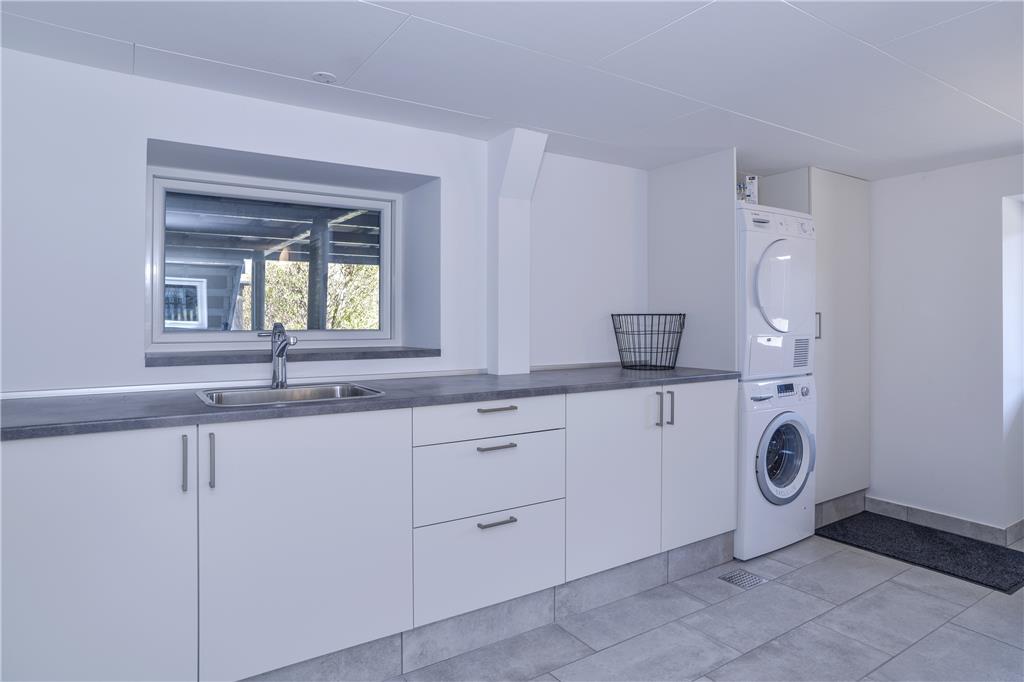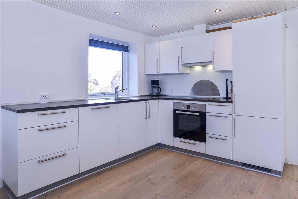 Feriehuset er lækkert og moderne indrettet, og to soveværelser byder på sovepladser til fire personer. Badeværelset er indrettet med bruseniche og gulvvarme, og ud over entréen består resten af ferieboligen af et stort køkken-alrum og en rummelig stue. Køkkenet er veludstyret til de små såvel som store måltider, og opvaskemaskinen gør afrydningen nem og bekvem. Retterne serveres let ved spisebordet i alrummet, og i stuen danner bløde sofaer rammen om hyggelige aftener med brætspil. Huset byder på wi-fi, ligesom her er tv, så aftenerne også kan nydes med film og tv-serier. I kælderen har I et praktisk bryggers med vaskesøjle.