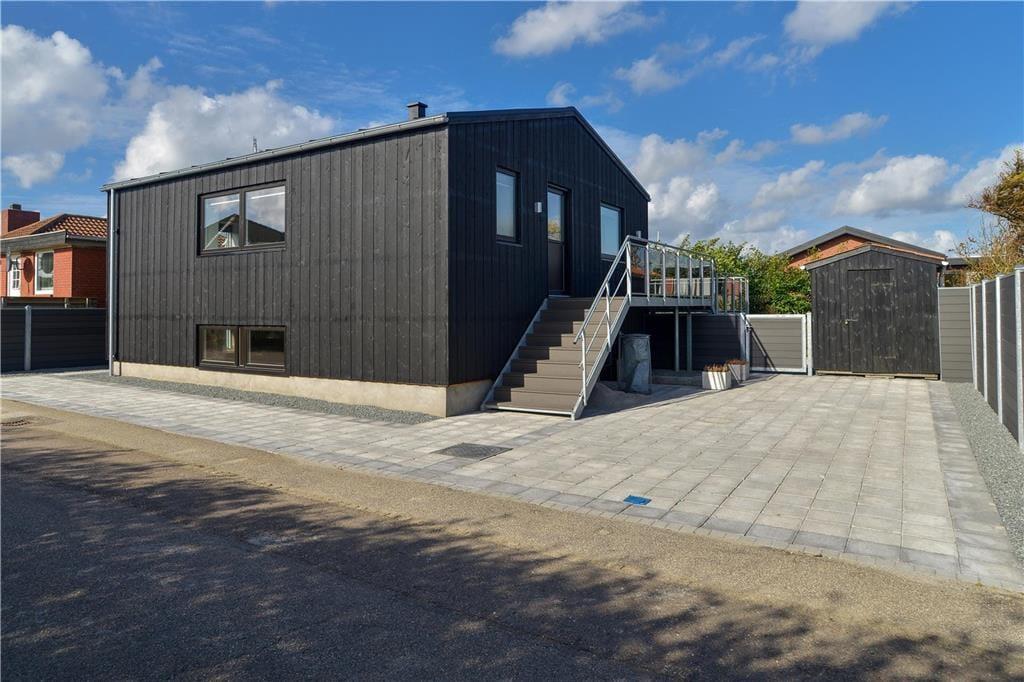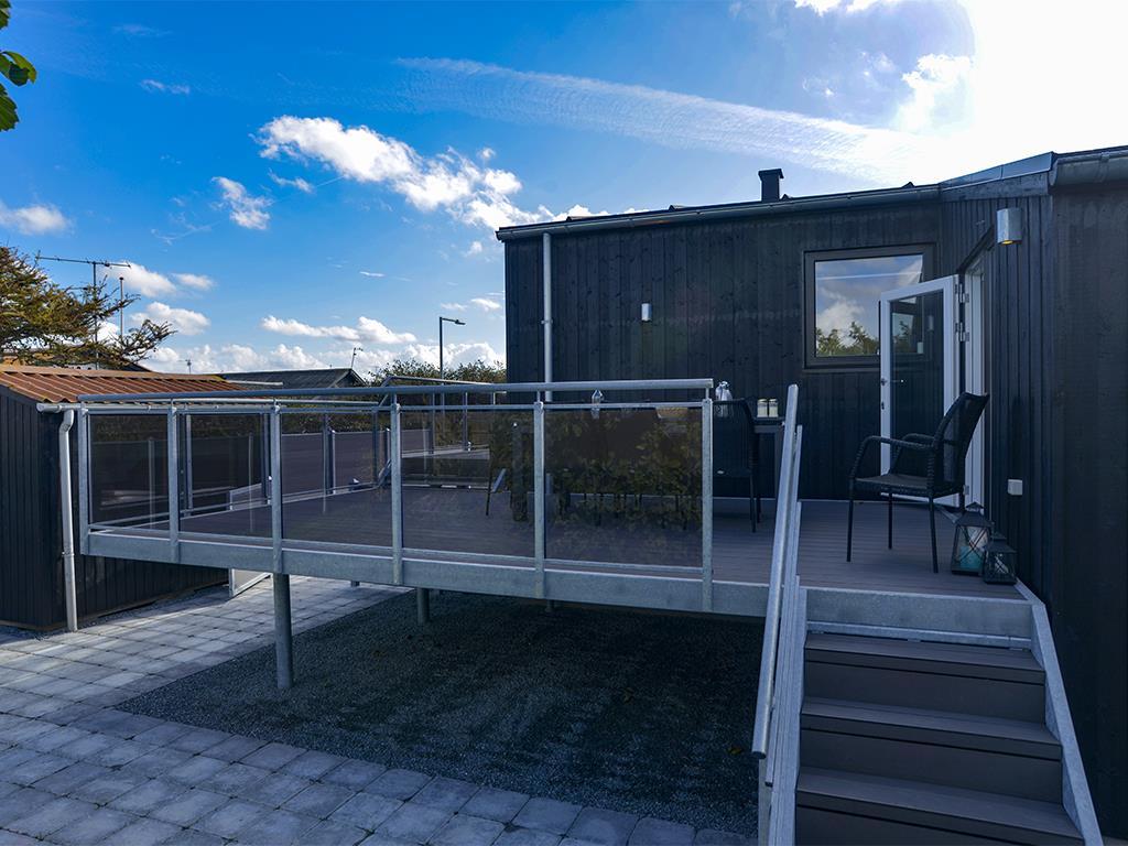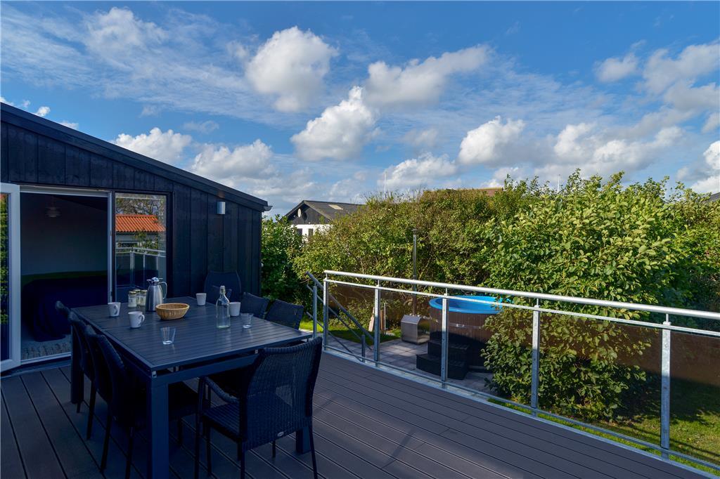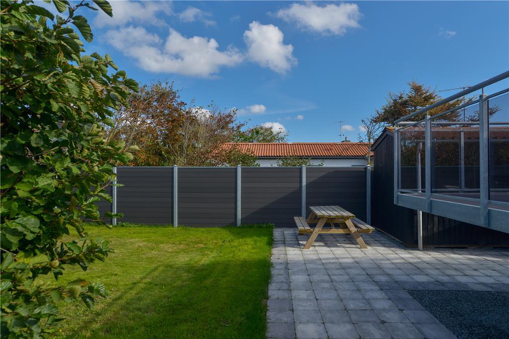 Et stort, hævet terrassemiljø er stedet, hvor kølige drikke og lækker mad fra grillen kan serveres under åben himmel. Fliseterrassen i terræn og haven giver mulighed for leg og boldspil. Som prikken over i’et er her vildmarksbad, hvor det varme vand især er skønt i aftentimerne under den blinkende stjernehimmel. Endvidere kan I gælde jer over en udendørs bruser, så sand og saltvand nemt kan vaskes af efter en tur på stranden.