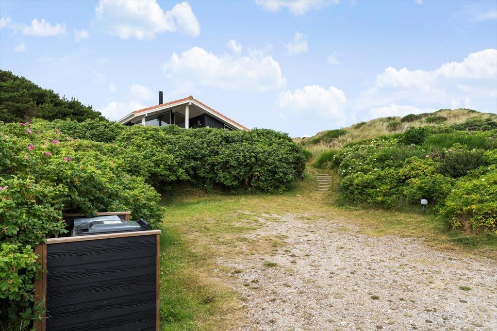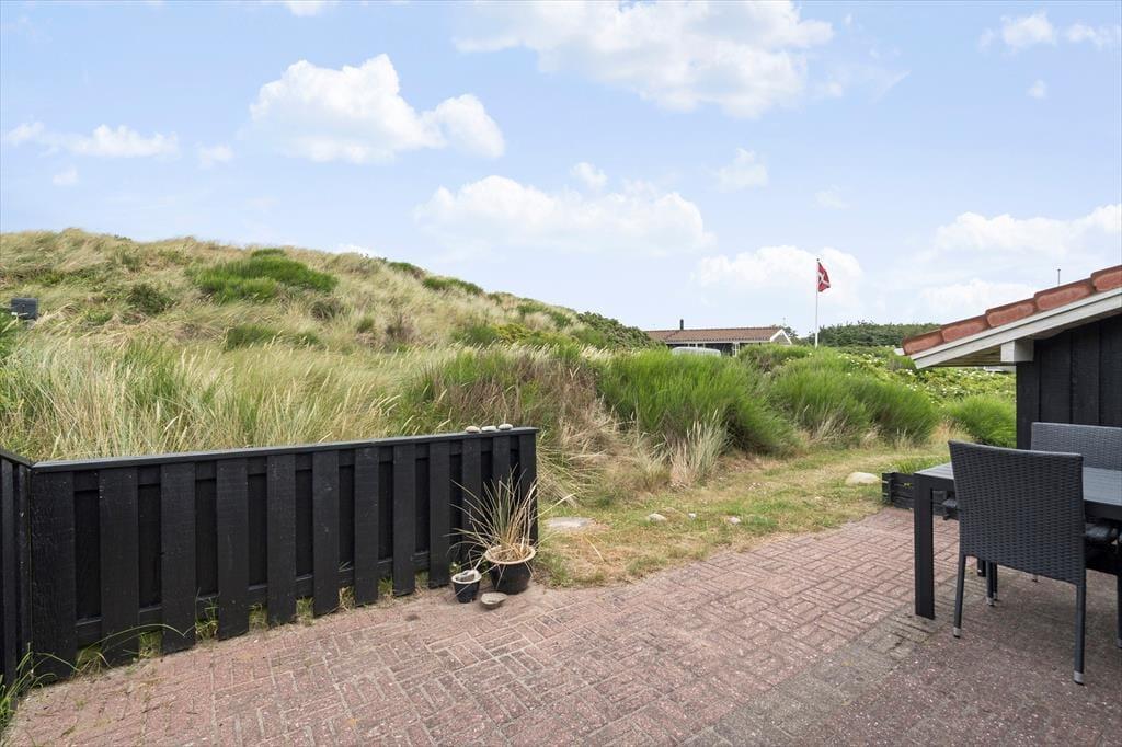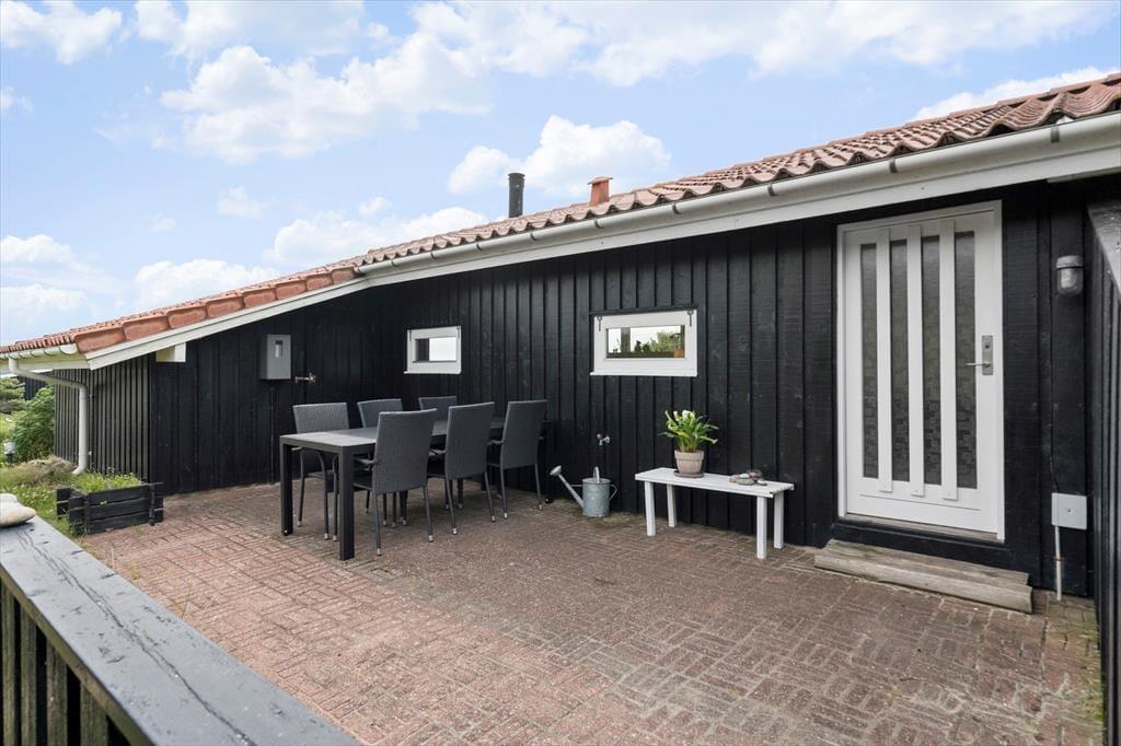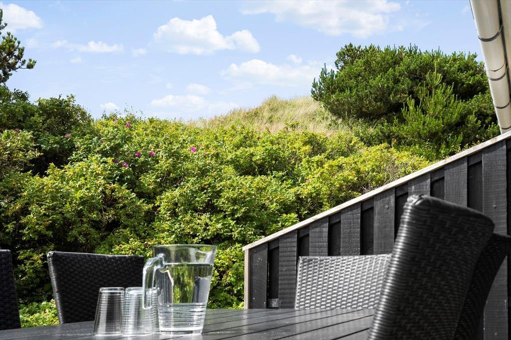 Overdækkede og åbne terrasser omkring huset giver mulighed for at nyde sommerdagene til fulde, og morgenkaffen, sommerfrokosten, aftensmåltidet samt alle dagens forfriskninger kan serveres i solen. Huset omkranses af en naturgrund og ligger i læ af en klit og frodig bevoksning, og her er også parkeringsplads.