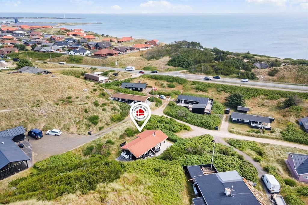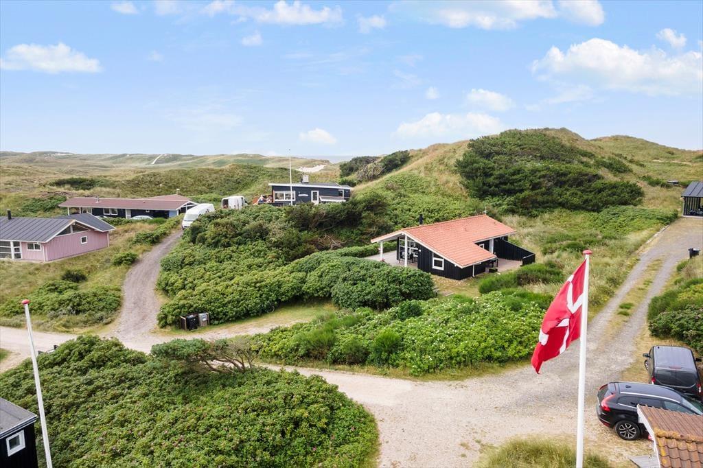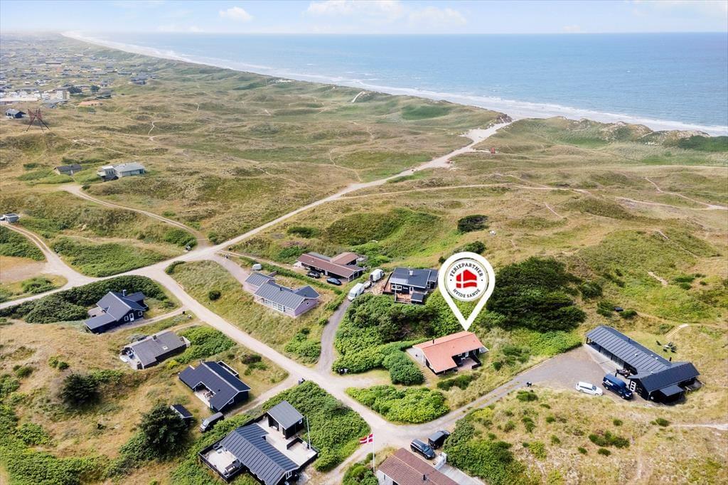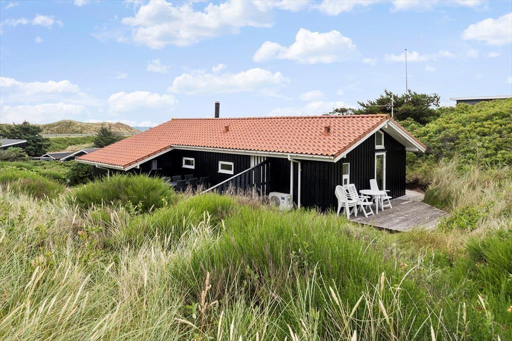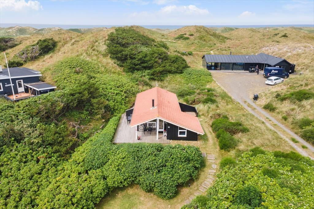 Overdækkede og åbne terrasser omkring huset giver mulighed for at nyde sommerdagene til fulde, og morgenkaffen, sommerfrokosten, aftensmåltidet samt alle dagens forfriskninger kan serveres i solen. Huset omkranses af en naturgrund og ligger i læ af en klit og frodig bevoksning, og her er også parkeringsplads.