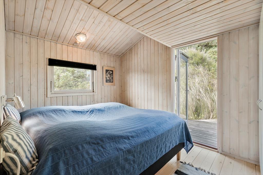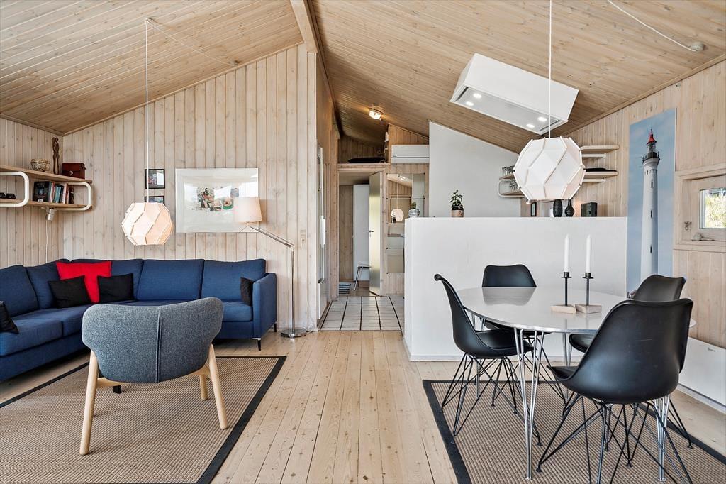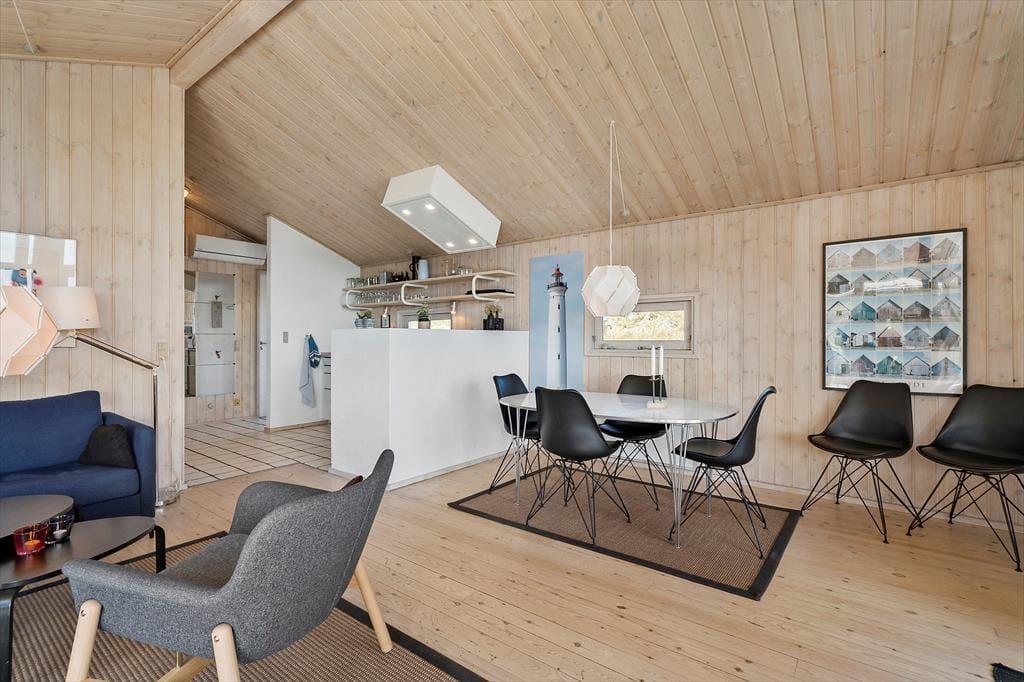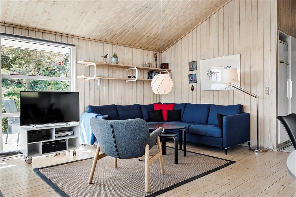 Feriehuset byder på klassisk sommerhusstemning, og med tre gode værelser er her sengepladser til seks personer. Foruden et badeværelse med bruseniche og vaskemaskine består resten af ferieboligen af et åbent opholdsområde, hvor varmepumpen og brændeovnen sørger for en behagelig temperatur. Køkkenet er godt udrustet til små og store måltider, og med opvaskemaskinen går rengøringen let. I stuen giver loft til kip og vinduespartier fra gulv til loft et skønt lysindfald og udsigt til naturen, og her er både en spisesektion samt et sofaafsnit. Her er god plads til, at hele familien kan dyste i brætspil, og med wi-fi og tv er aftenunderholdningen også sikret.