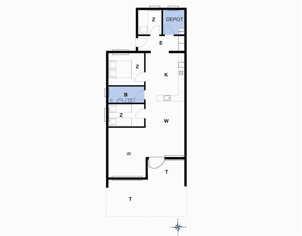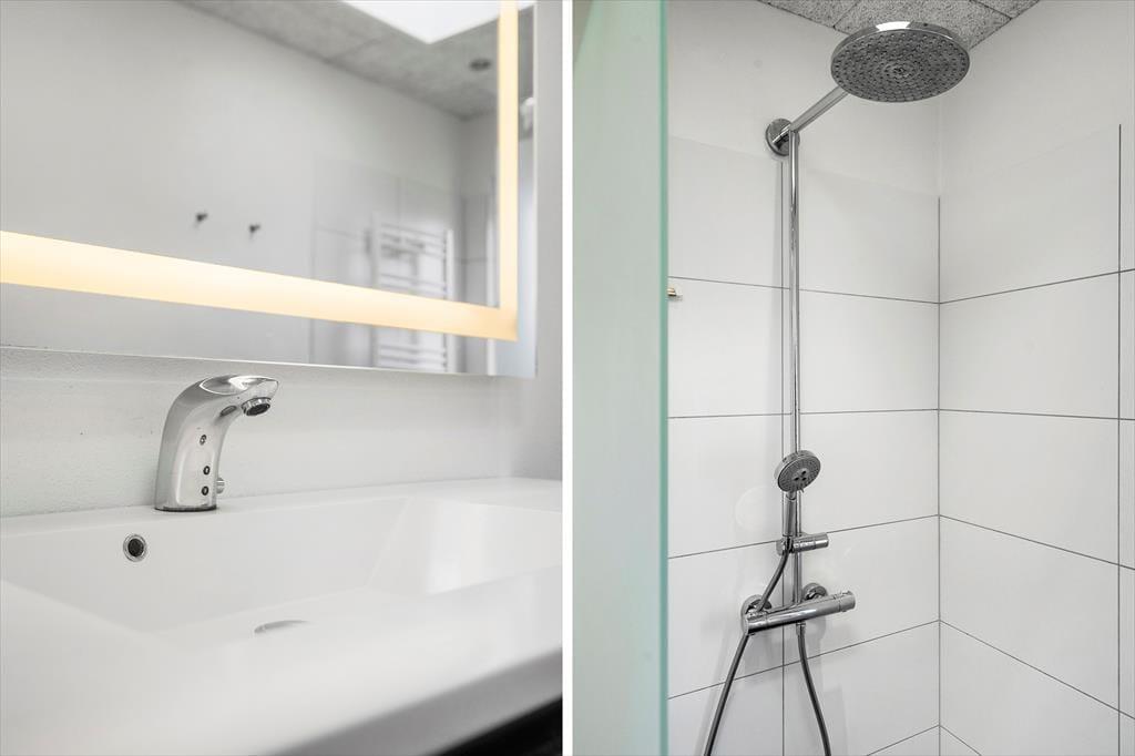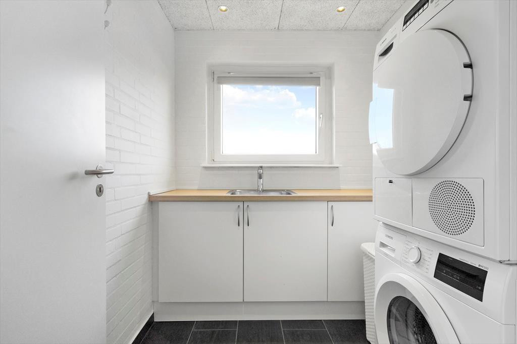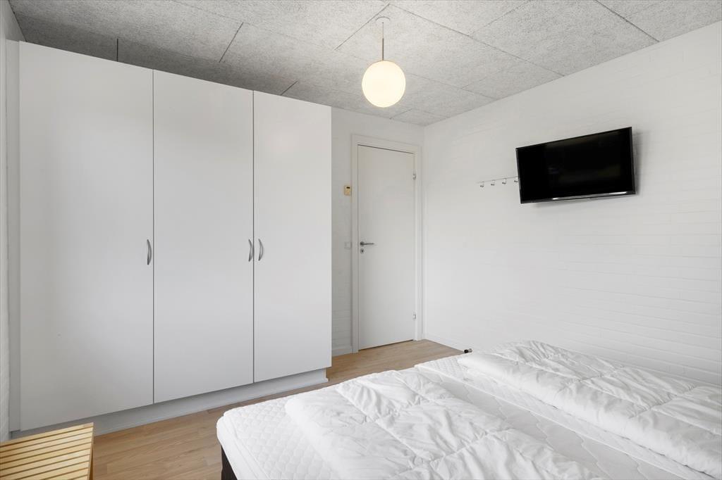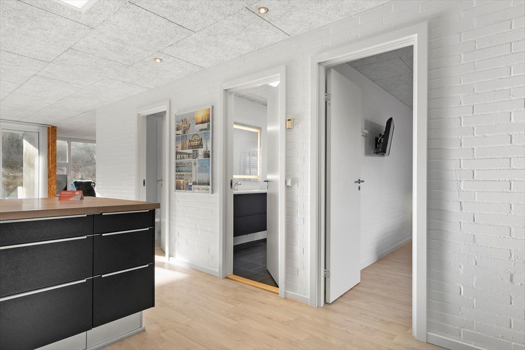 Ferieboligen, der mere præcist er et halvt dobbelthus, er moderne og komfortabelt indrettet med gulvvarme overalt, og tre soveværelser giver sengepladser til fem personer. Plads får I rigeligt af i opholdsafdelingen, hvor køkkenet og stuen ligger i åben forbindelse. I det lækre køkken kan I være sammen om at lave mad, og opvaskemaskinen klarer let rengøringen. Måltiderne kan serveres ved spisebordet, hvor I også har god plads til brætspil. Stuen byder desuden på et sofaafsnit og lænestole, og med tv og wi-fi er aftenernes underholdning sikret. Badeværelset er indrettet med bruseniche, entréen har god plads til sko og overtøj, og feriehuset fuldendes af et bryggers med grovkøkken, fryser og vaskesøjle.
