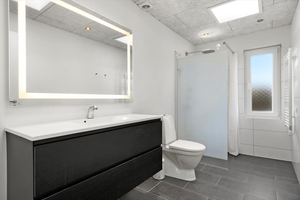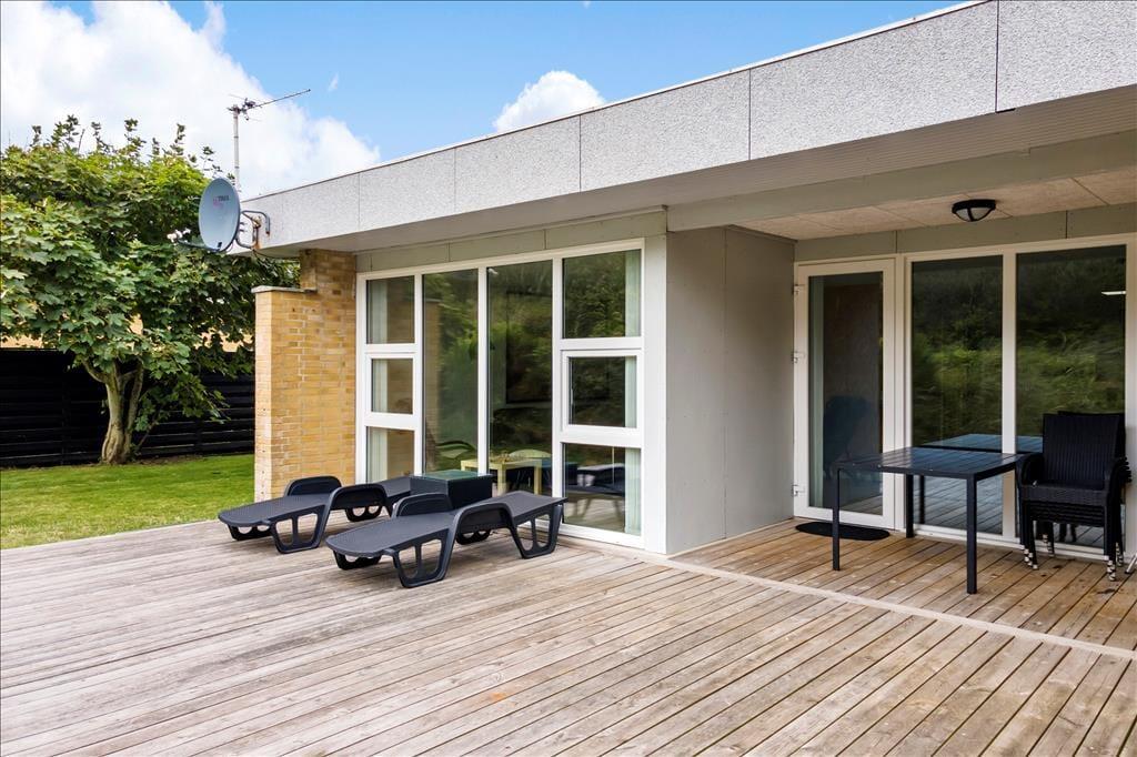 Fra opholdsafdelingen er der direkte adgang til den store, sydvendte træterrasse, så det er let at rykke måltiderne ud under åben himmel. Her kan I også nyde sommerens sol fra morgen til aften i liggestolene, mens familiens yngste kan få græs mellem tæerne i haven. Haven og terrassen er godt afskærmet, så her er ugeneret og god læ for brisen fra vest.