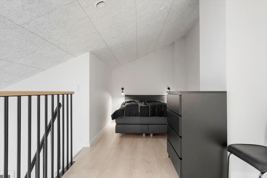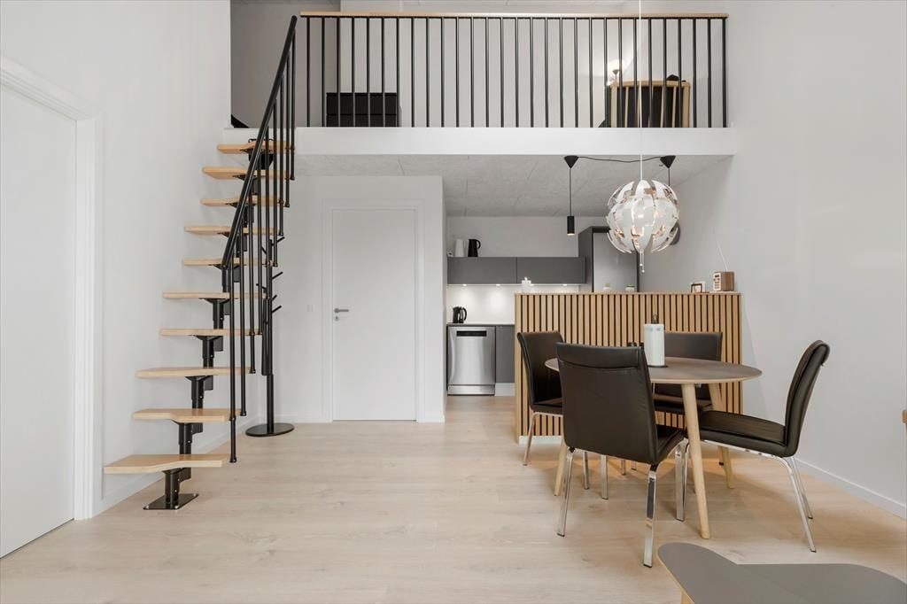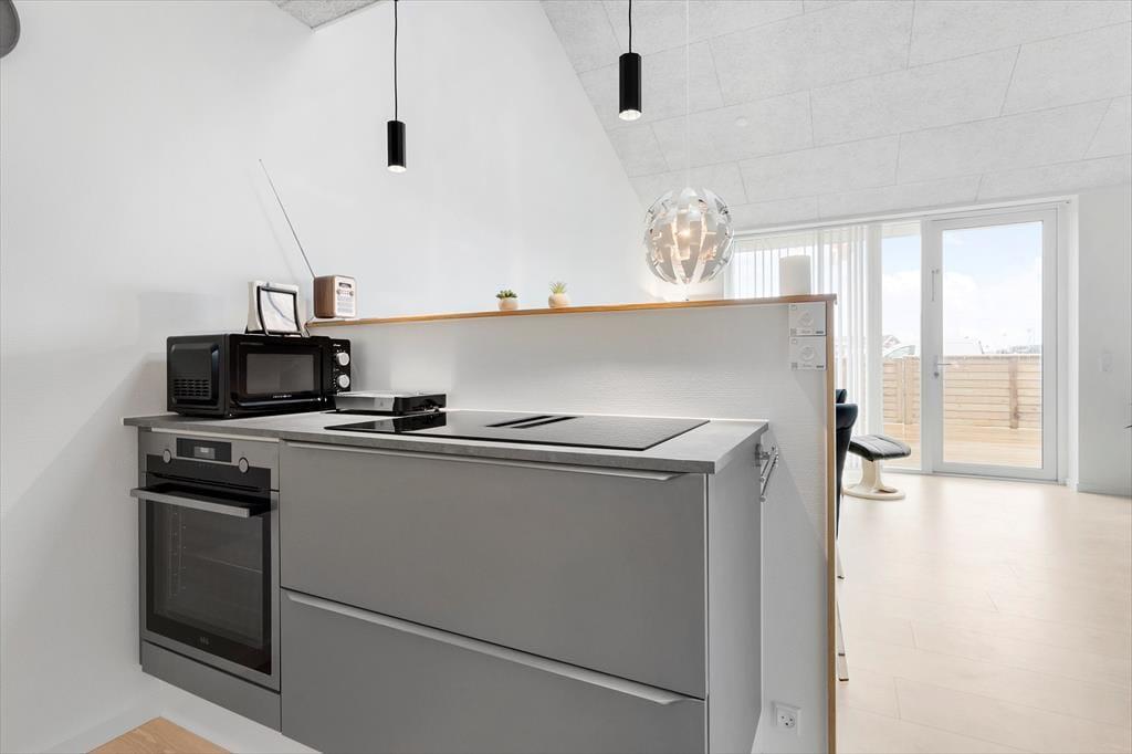 Tidligere var det Hotel Holmsland Klit, der lå her på adressen, mens I i dag finder en række af velbyggede ferielejligheder opført i 2023. Netop dette lyse og indbydende eksemplar har en god planløsning på 54 m2, der består af et soveværelse, et brusebadeværelse og en stue med integreret køkken. I stuen giver en trappe jer adgang til en stor, åben hems på yderligere 16 m2, og her er der en dobbelt sovesofa, som børnene oplagt kan bruge. Det lyse badeværelse er med vaskemaskine og gulvvarme, og i køkkenet har I alt, hvad I skal bruge – inklusiv opvaskemaskine og komfur med indbygget emhætte. En lynhurtig wi-fi-forbindelse og et fladskærms-tv med danske, tyske, svenske og norske kanaler hører også med til lejlighedens tjekkede faciliteter.