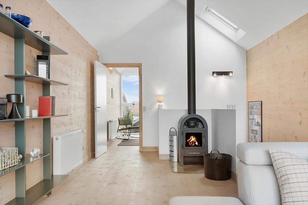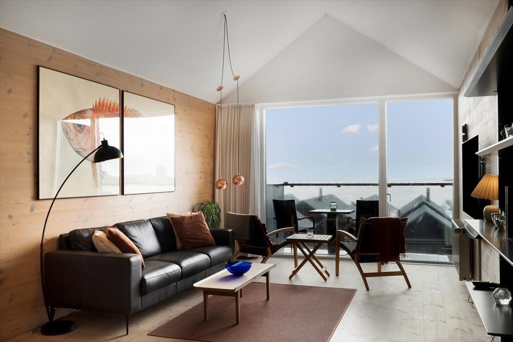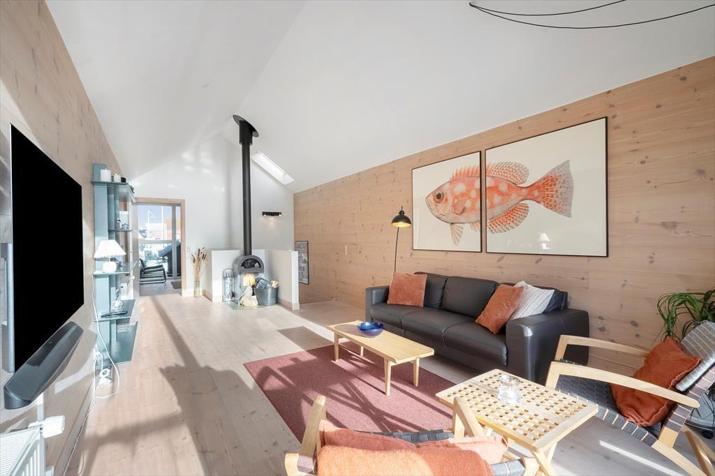 Når du træder ind i feriehuset, vil du blive mødt af en lys og moderne atmosfære, og værelserne åbner op gennem de store vinduer. I stueetagen finder I en komfortabel opholdsstue med et veludstyret køkken, som indbyder til afslappende timer med at tilberede måltider og nyde dem sammen ved spisebordet. Hvis du ønsker at blive yderligere forkælet, er der to badeværelser med spabad og sauna. Ovenpå finder du en hyggelig stue med pejs og en fantastisk udsigt over fjorden – både fra sofaen indenfor og fra balkonen, hvor du kan indånde den friske havluft.