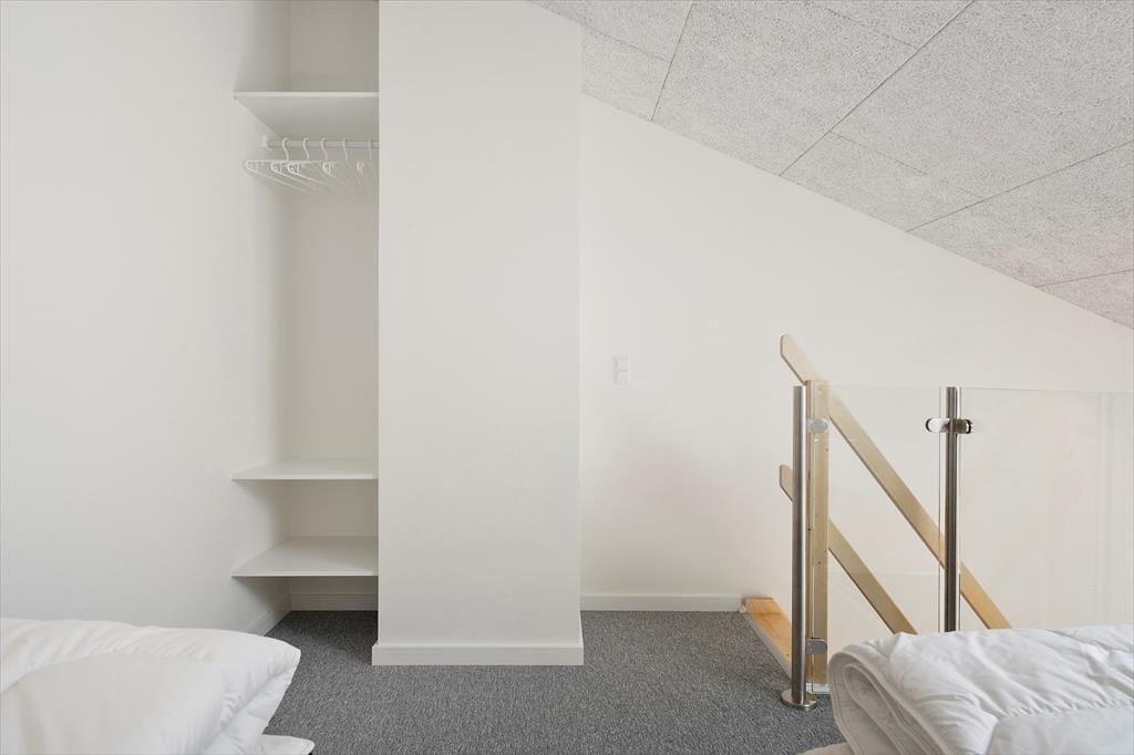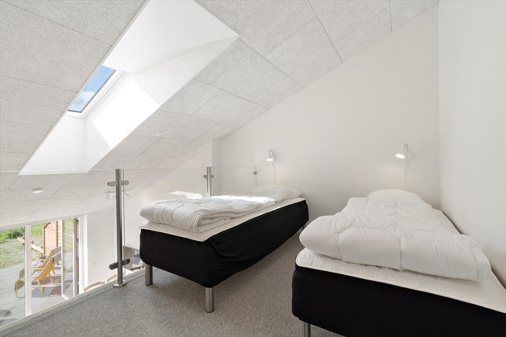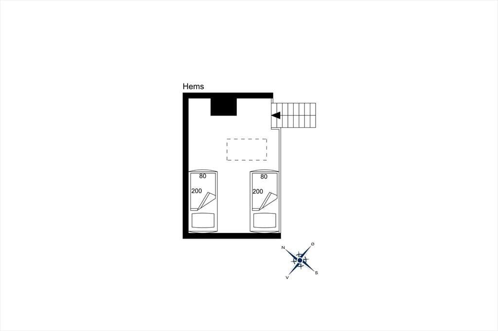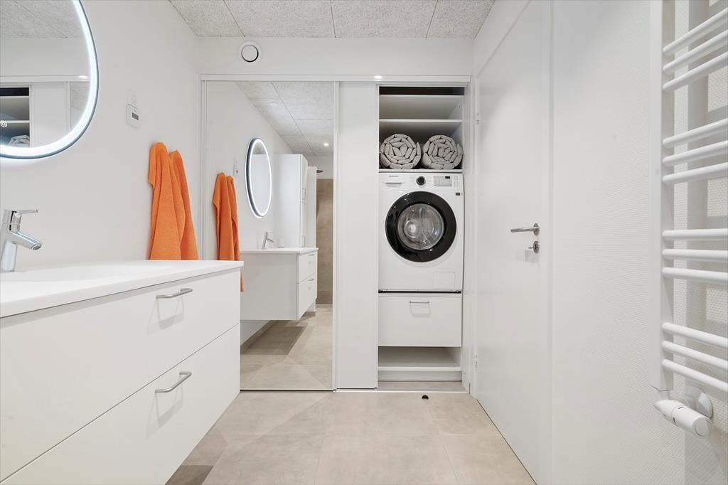 Rummeligt køkken/alrum med nye møbler og bl.a. sovesofa, der kan benyttes som alternativ til sengene på hemsen. Stort badeværelse med brusekabine, mange skabe og skuffer samt kombineret vaskemaskine/tørretumbler. Den store hems, der har fuld ståhøjde overalt, giver rigtig god rumfornemmelse og er meget anvendelig med to senge, der kan stilles sammen eller hver for sig.