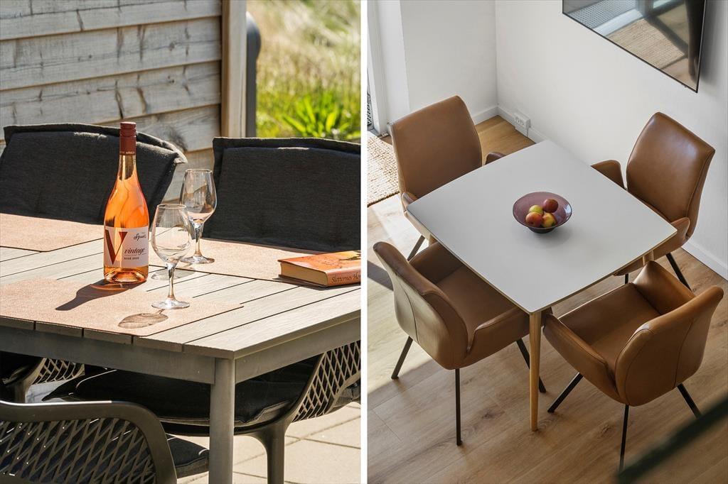 Stor sydvendt solterrasse med havebord og stole samt to loungestole med hynder. Terrassen er omkranset af hegn på to sider, så der er mulighed for at sidde udenfor i fred og ro med gode læforhold.
