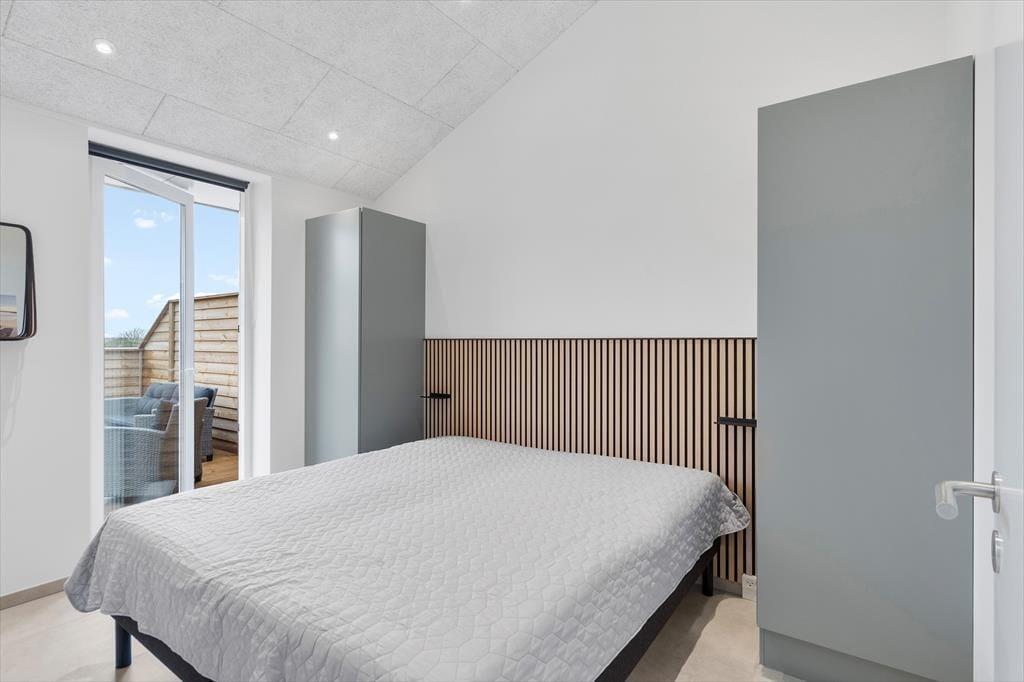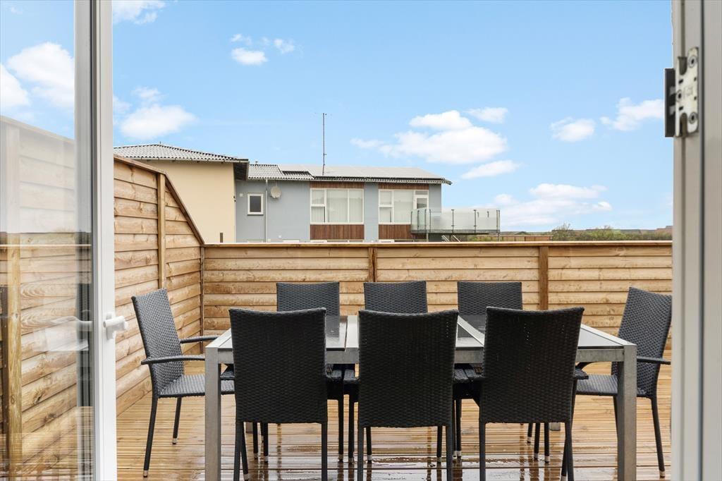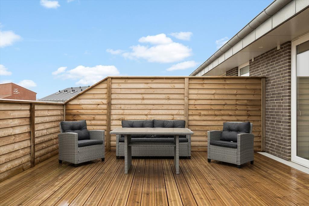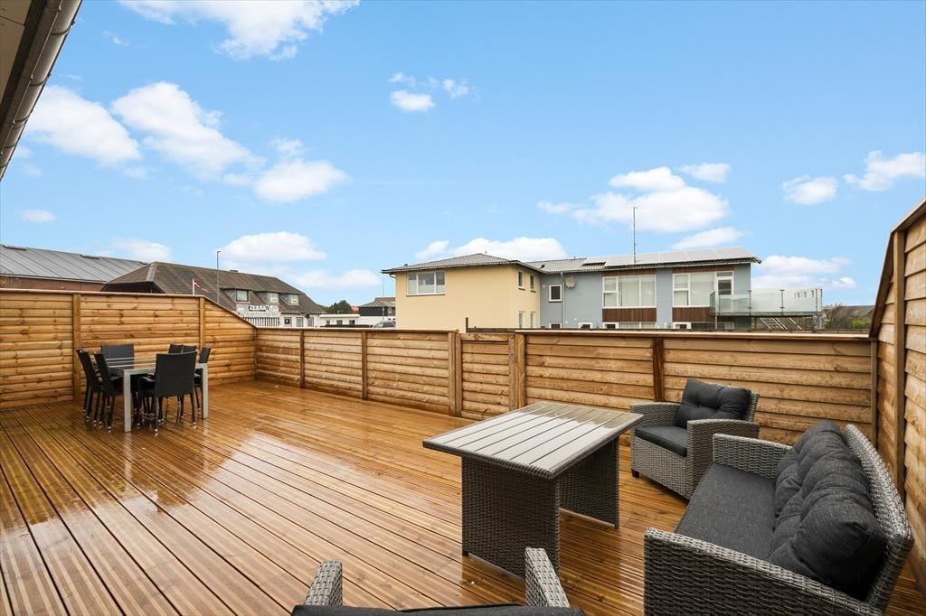 En flot træterrasse på hele 50 m2 breder sig i forlængelse af lejligheden. Ikke bare fra stuen, men også fra de to soveværelser fører en glasdør ud til det fri – så lige fra morgenstunden er det ingen sag at smutte ud i det fri for at trække frisk luft eller måske endda lave yoga-øvelser i den friske luft. Det kan også være, at en rolig stund i en havestol er lige det, du har brug for, og om aftenen har du mulighed for at grille, hvis du og dine kære ikke er ude for at spise på en af Hvide Sandes gode restauranter.