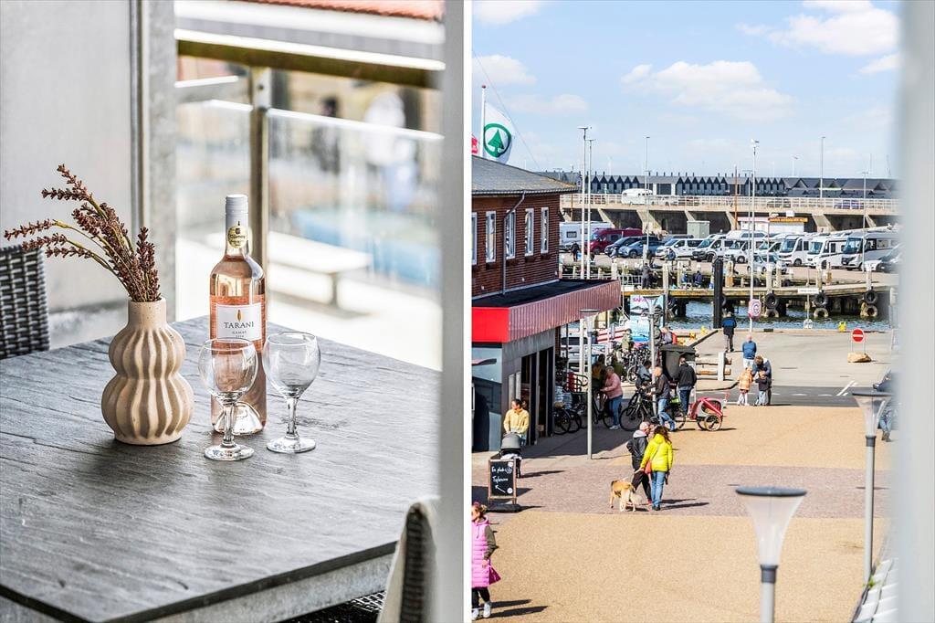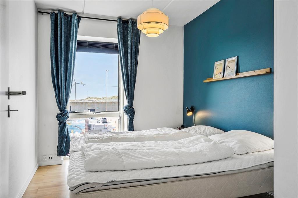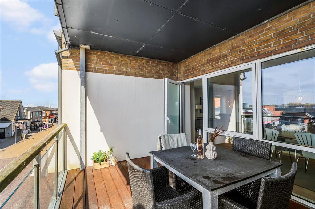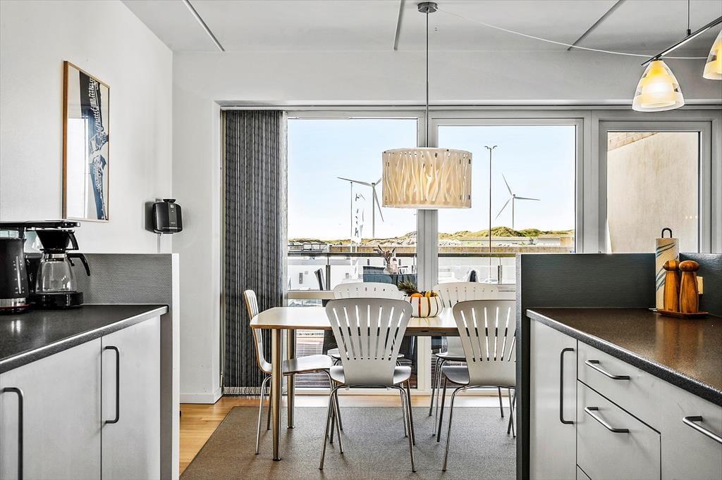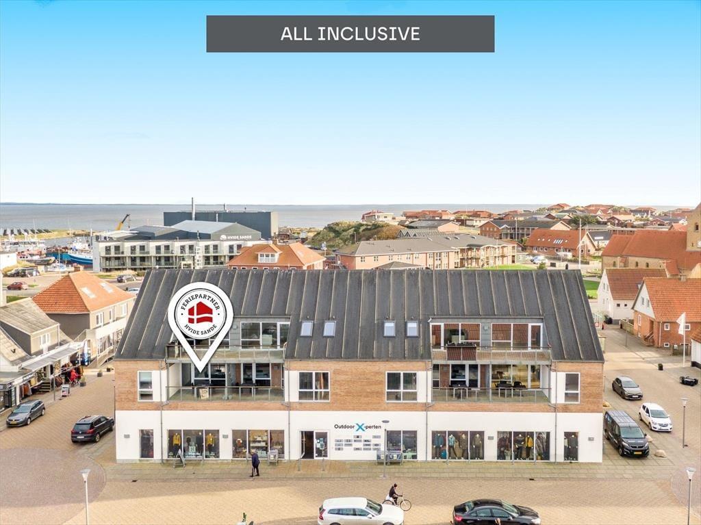 Denne attraktive ferielejlighed ligger midt i Hvide Sandes hyggelige bymidte, og fra en overdækket, vestvendt terrasse har I udsigt over byens tage til havnen og Vesterhavet.