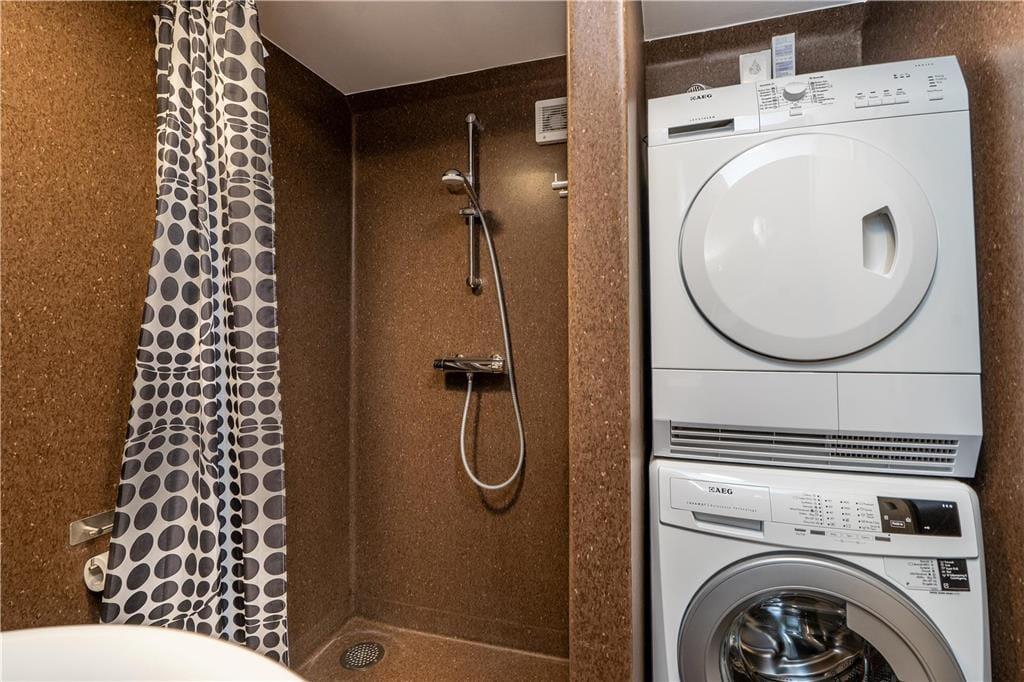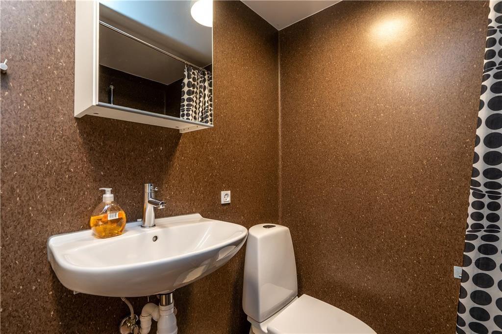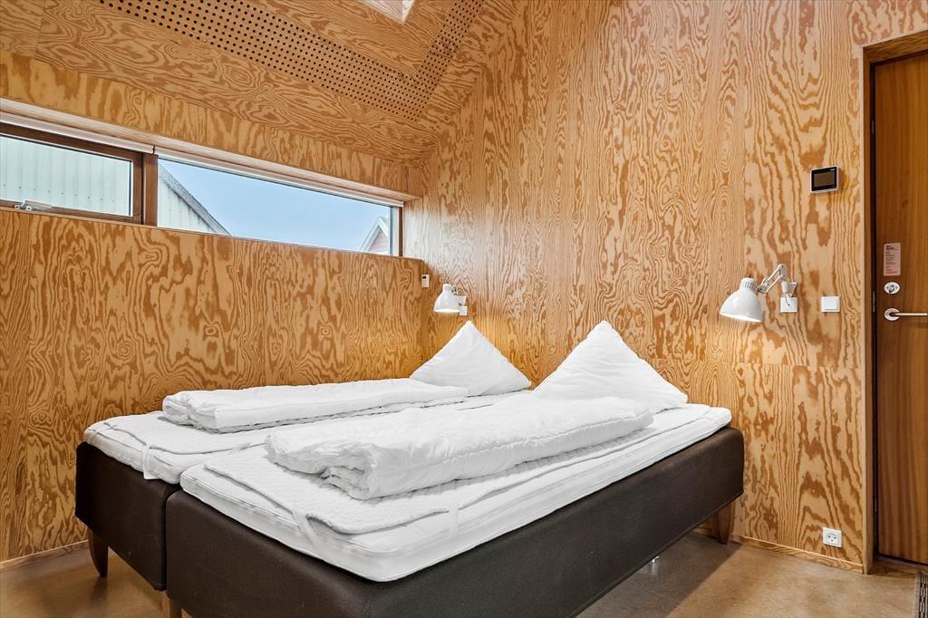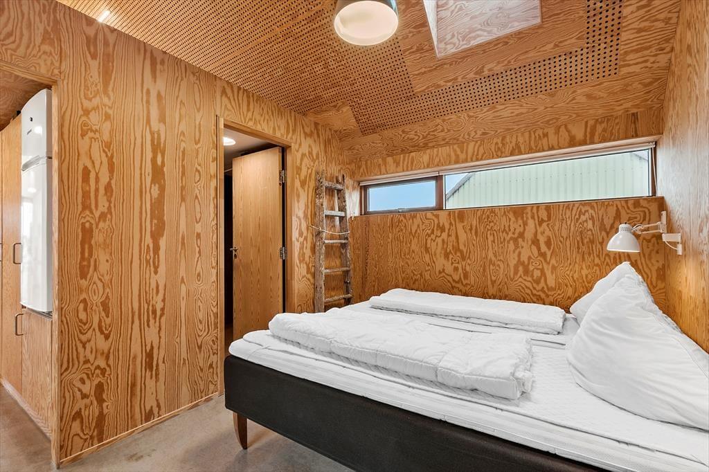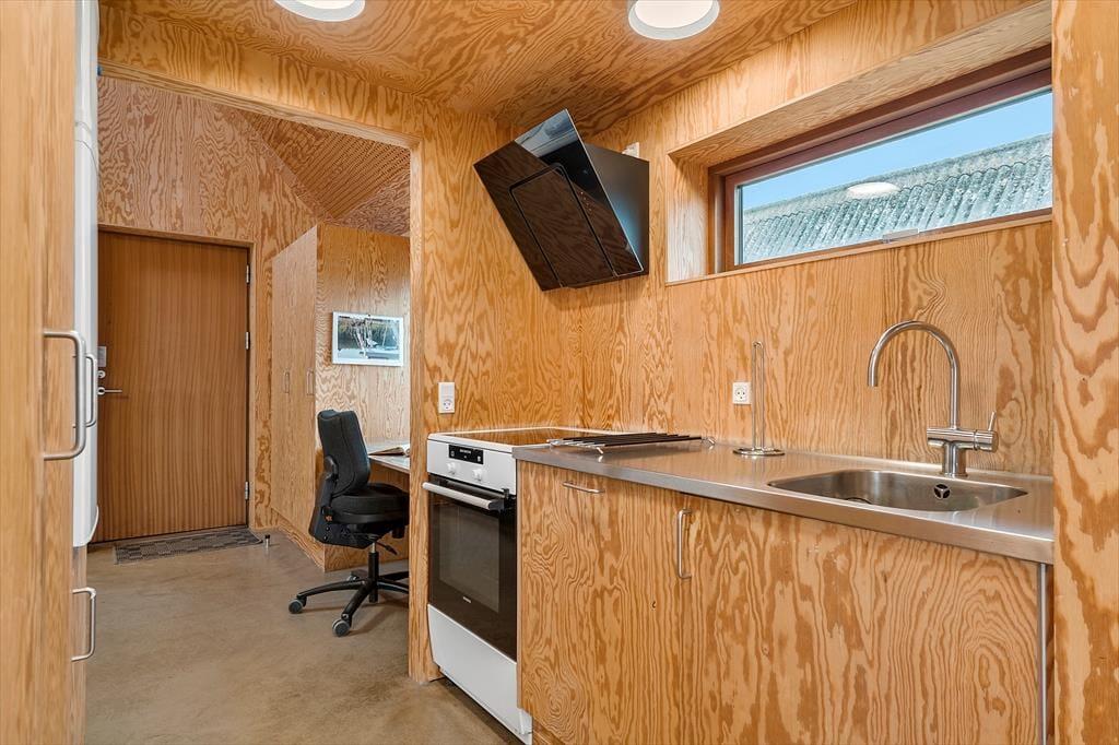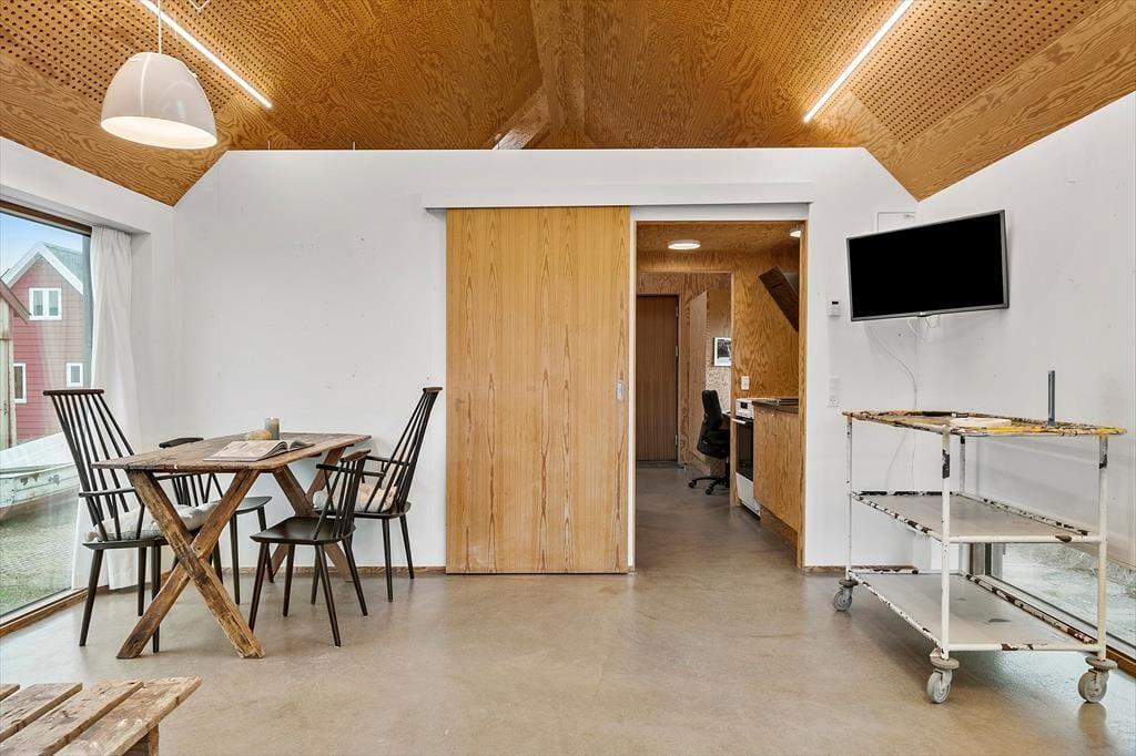 Arkitektonisk ligner huset en moderne nyfortolkning af de traditionelle fiskerhytter, der står langs havnen. Det er opført i 2016 og måler 50 m2, og planløsningen giver plads til to overnattende personer. Inden døre kan man tydeligt se, at det er skabt som atelier og kunstnerbolig, for de store, åbne rum har en minimalistisk indretning og et skønt lysindfald. Tagvinduer inviterer lyset ind fra oven, og store glaspartier åbenbarer den fantastiske udsigt over fjorden og havnen. Vægdekorationer vidner om de kunstnere, der har opholdt sig i huset, og det bidrager til husets særlige atmosfære. Udover den store stue byder huset på et velfungerende køkken, et badeværelse med bruser og et soveværelse med dobbeltseng og arbejdsplads. Overalt er der gulvvarme, og så er der god wi-fi-forbindelse og tv med parabol.