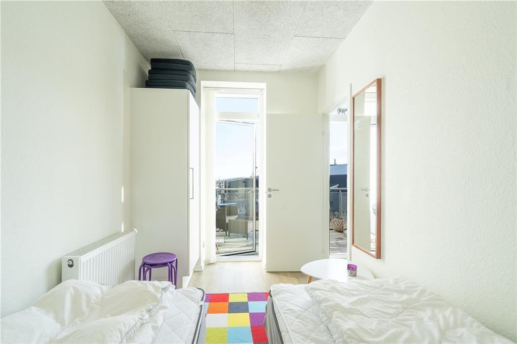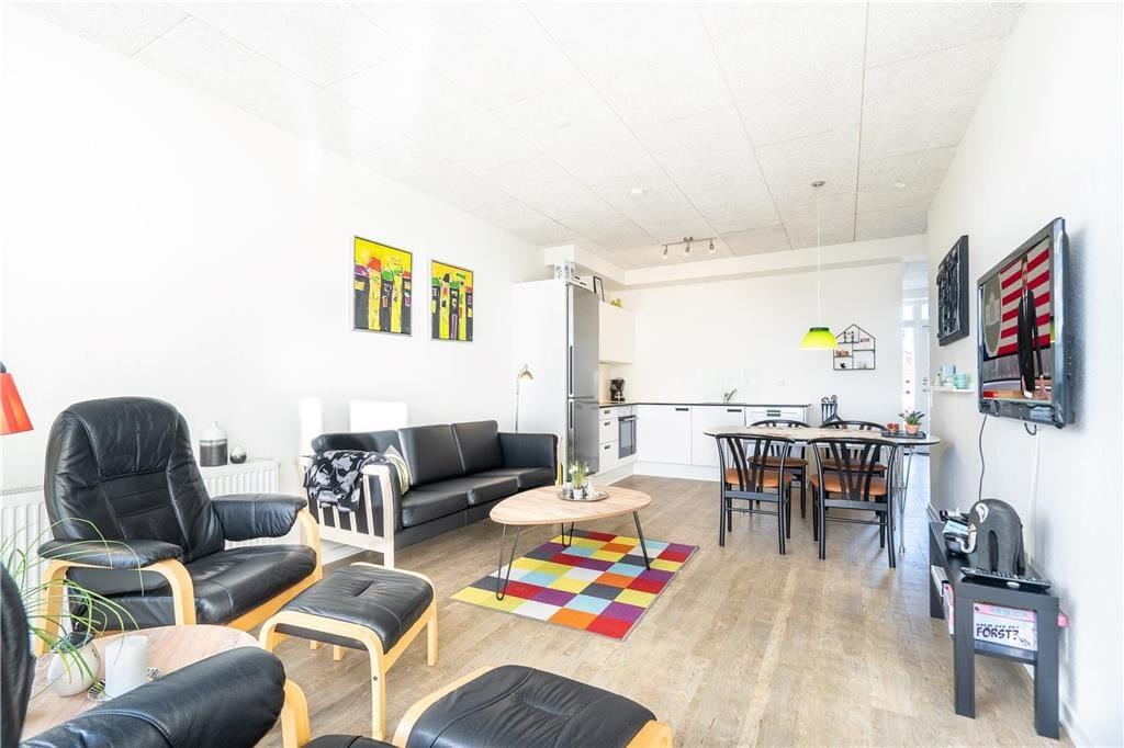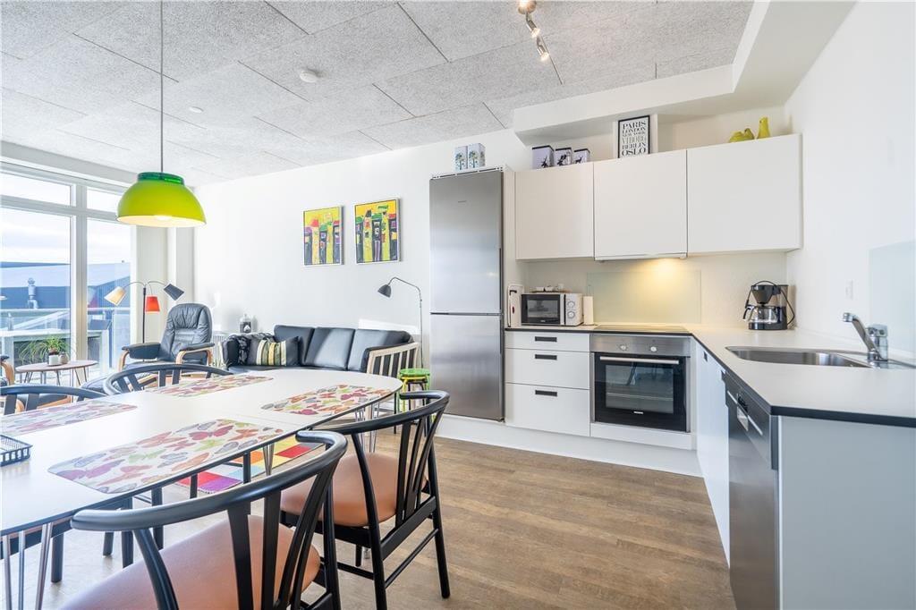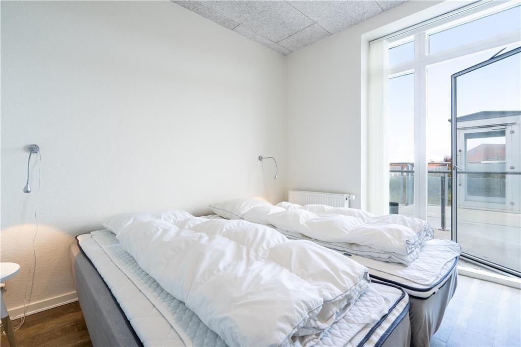 Lejlighedens stue er et dejligt opholdsrum med en lys og let atmosfære. Det skyldes ikke kun det store vinduepartis smukke lysindfald, men også den moderne og indbydende indretning. Et veludstyret køkken er integreret med stuen, der også har spisebord, sofa, lænestole og fladskærms-tv – med andre ord alt, hvad I skal bruge for at slappe af og nyde livet inden døre. Badeværelset er udstyret med bruser, vaskemaskine, tørretumbler og gulvvarme. Endelig har de to soveværelser begge to sengepladser, så lejligheden egner sig både til en børnefamilie og til to vennepar, der gerne vil holde ferie sammen.