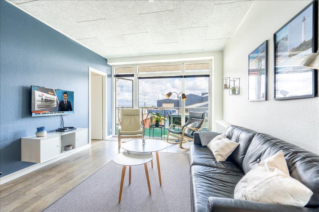Udsigten imponerer her fra første sal, hvor denne flotte ferielejlighed ligger. Fra stuen, det ene soveværelse og altanen kan I følge med i livet på Hvide Sandes fjordvendte havn, og om morgenen kan I stå op til de flotteste solopgange over vandet.