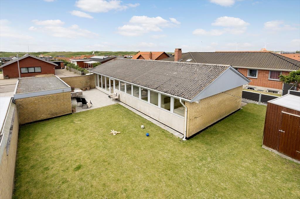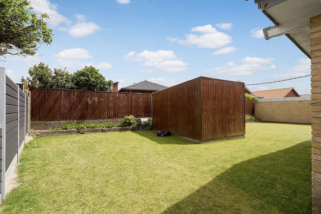 Når familien vil lege, solbade og grille, er det i baghaven, hele herligheden foregår. Haven er stor og godt afskærmet af plankeværk og husets gule mure, så det føles meget roligt og ugeneret på trods af den centrale adresse i byen. Græsplænen står helt skarpt takket være en robotplæneklipper, og terrassen er et skønt sted at slå sig ned med en kop iskaffe, mens børnene spiller bold – hvis altså ikke du selv vil deltage i de fysiske udfoldelser. Ud mod vejen er der både en indkørsel og en garage til parkering af bilen, og i husets skur har du plads til at opbevare elcykler, surfudstyr, barnevogn eller andet i tørvejr.