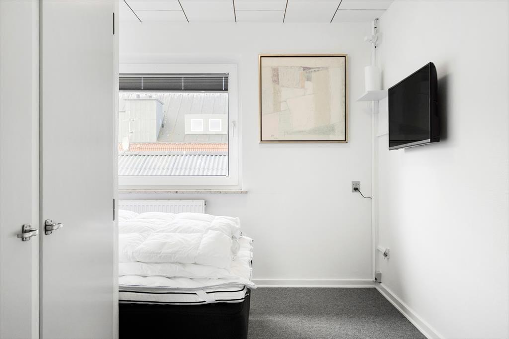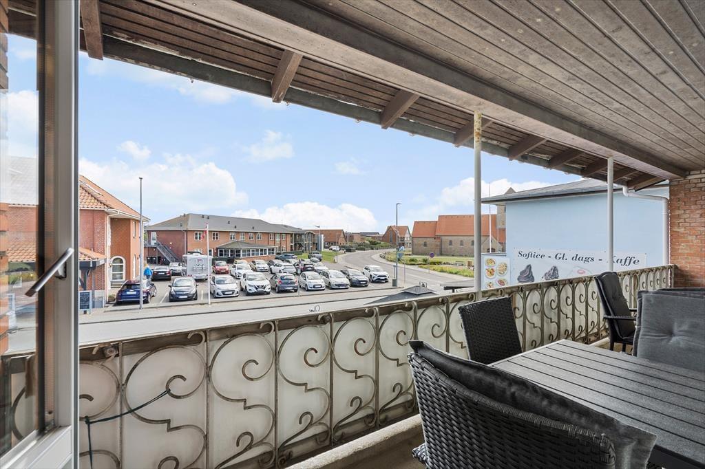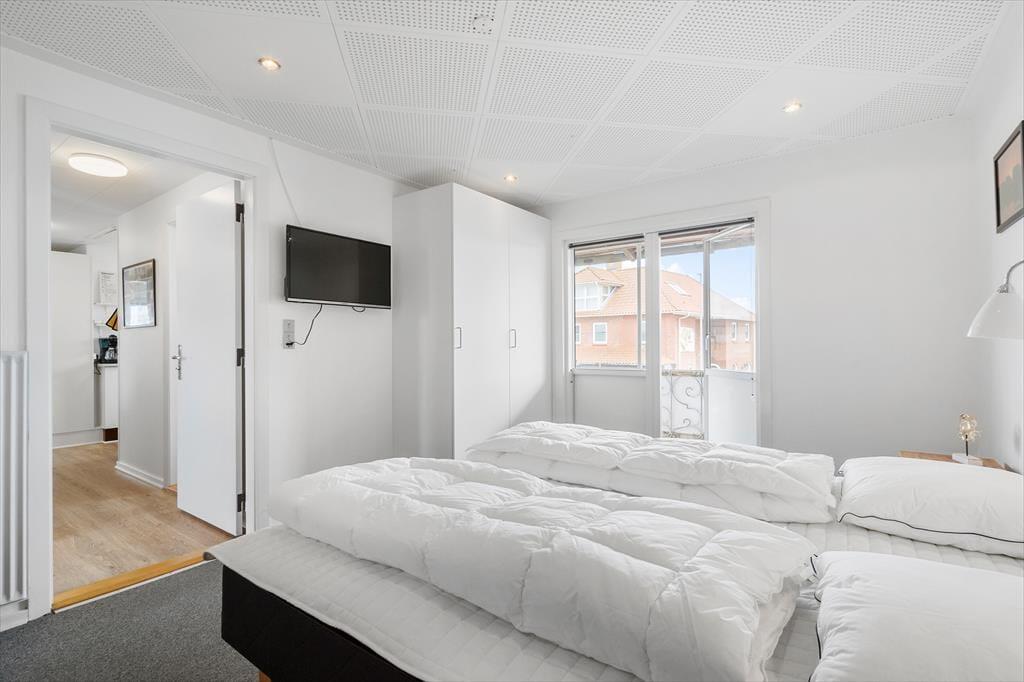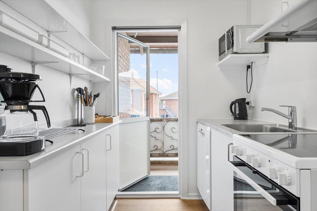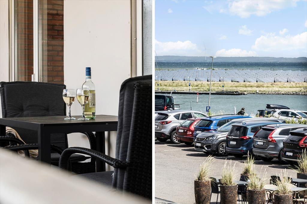 Både fra det ene soveværelse og fra køkkenet har du direkte adgang til lejlighedens østvendte altan – så lige fra morgenstunden kan du nemt smutte ud for at trække frisk luft eller tage dagens første kop kaffe med ud i det fri. Altanen er overdækket, og der er delvis afskærmning, så det er et rart sted at sidde, hvis du vil lade tankerne flyve og nyde udsigten til by, fjord og himmel. Bemærk venligst, at det ikke er muligt at parkere lige ved hoveddøren, for pladsen er reserveret til apoteket. Til gengæld er der gode parkeringsmuligheder på p-pladsen mellem Søndergade 1 og 3.