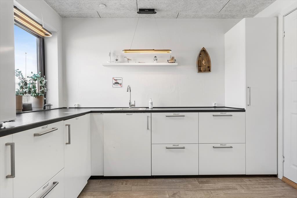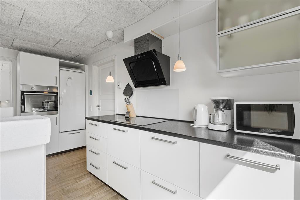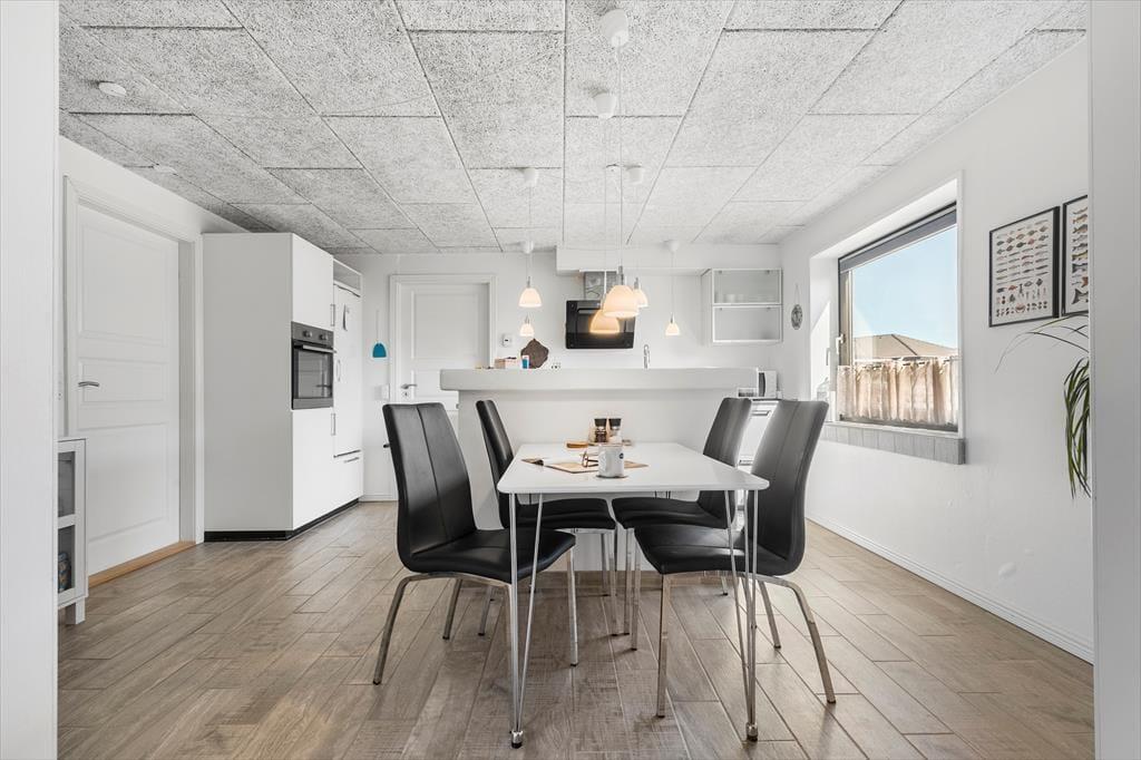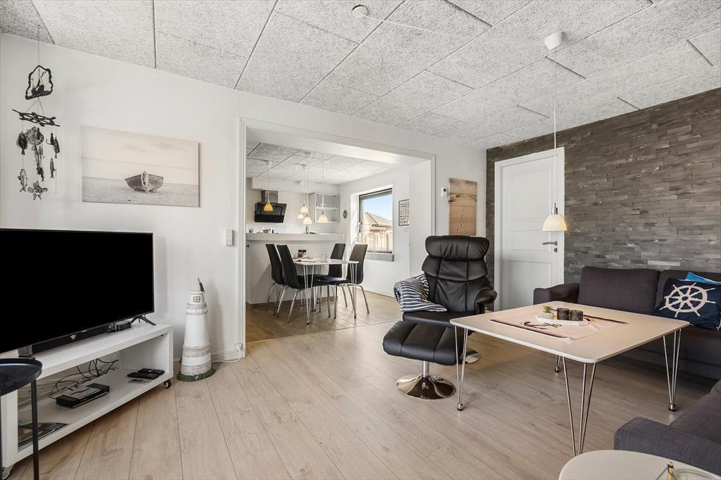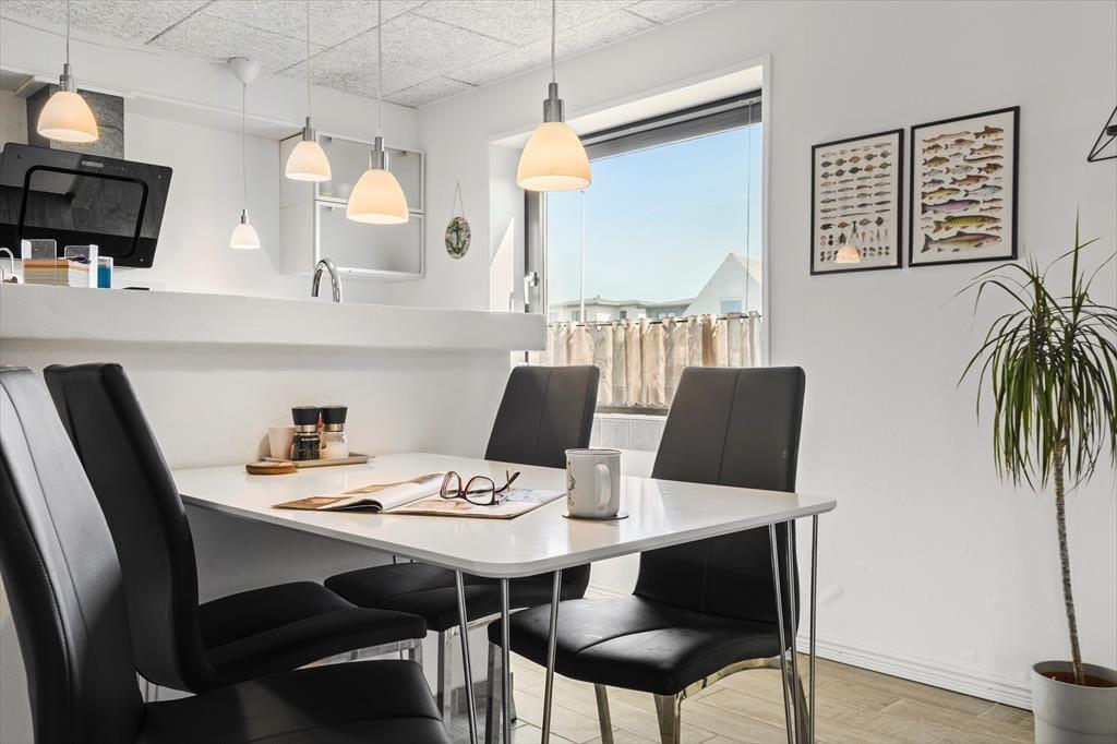 Når du træder ind i lejligheden, mødes du af en lys og indbydende atmosfære. De åbne rum og de enkle, men stilfulde møbler skaber en hjemlig følelse, hvor du kan slappe af efter en aktiv dag på stranden eller på udflugt i området. Den rummelige stue er det perfekte sted til at nyde en stille stund, mens du kigger ud over de omkringliggende naturområder. Det åbne køkken giver mulighed for at tilberede lækre måltider, som du kan nyde ved spisebordet – det er her, feriens små stunder af hygge og samvær kan nydes.