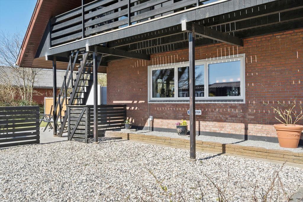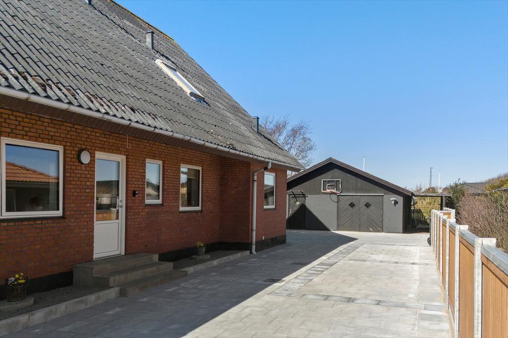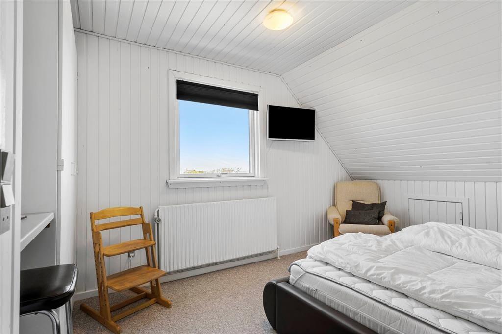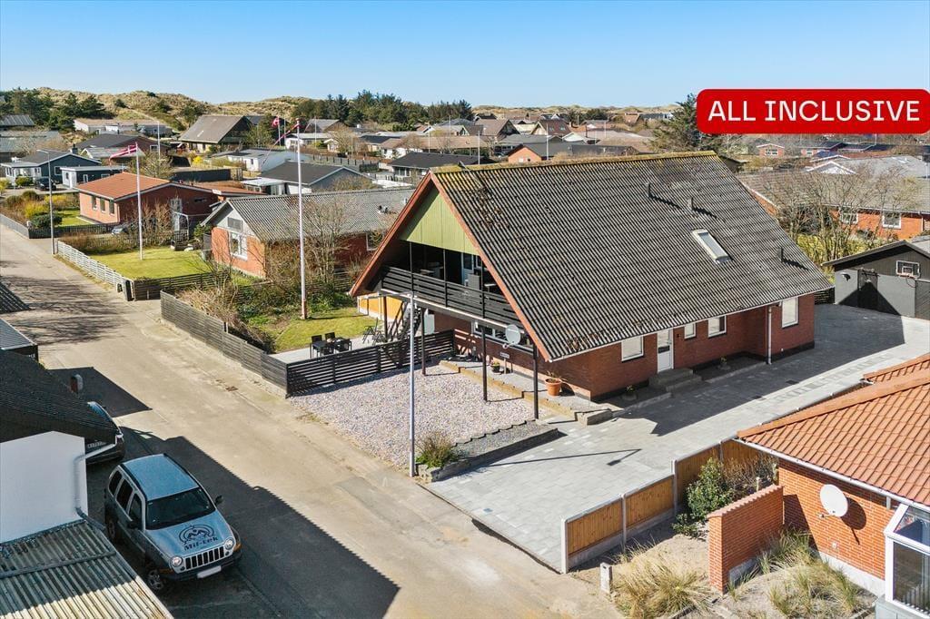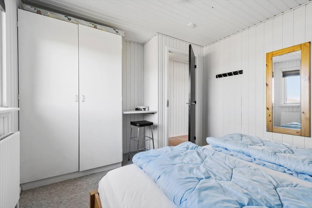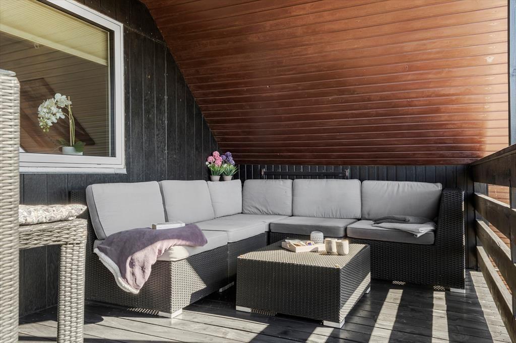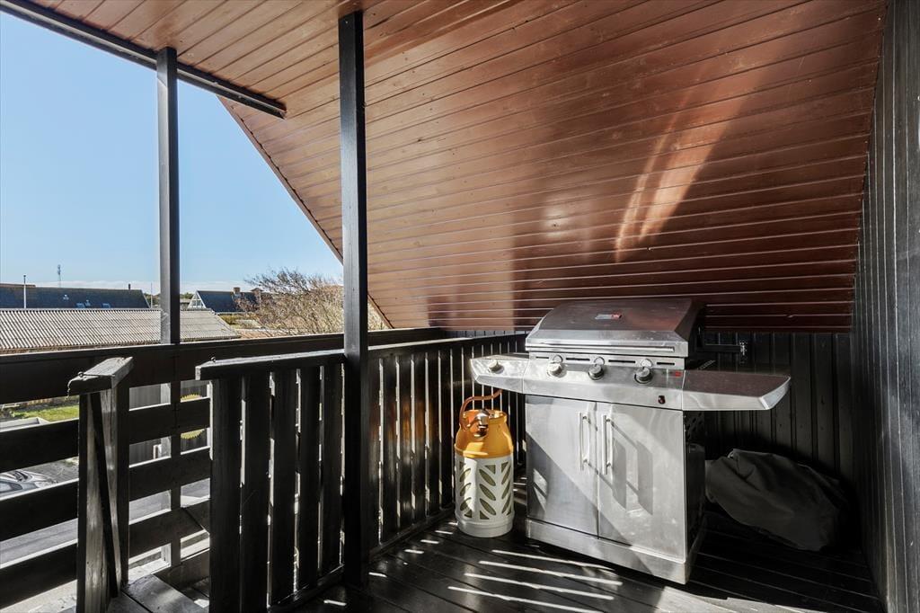 Altanen er hjertet i udelivet her – og det forstår man godt. Heroppe kan du sidde i læ for vinden med udsigt til det lille stykke græs nedenfor, mens morgenkaffen nydes under åben himmel. En trappe fra altanen fører ned til en dejlig terrasse, hvor du kan finde skygge på varme dage eller lade børnene lege, på det lille stykke græs, mens du selv slapper af i havemøblerne. Har du brug for at rense dagens fangst, har du adgang til en fiskerenseplads i det store aflåste skur, som også er ideelt til opbevaring af alt fra surfbræt og elcykel til fiskestænger. Og med privat parkering lige foran huset bliver logistikken under ferien dejligt enkel – du skal bare lande, pakke ud og nyde livet.