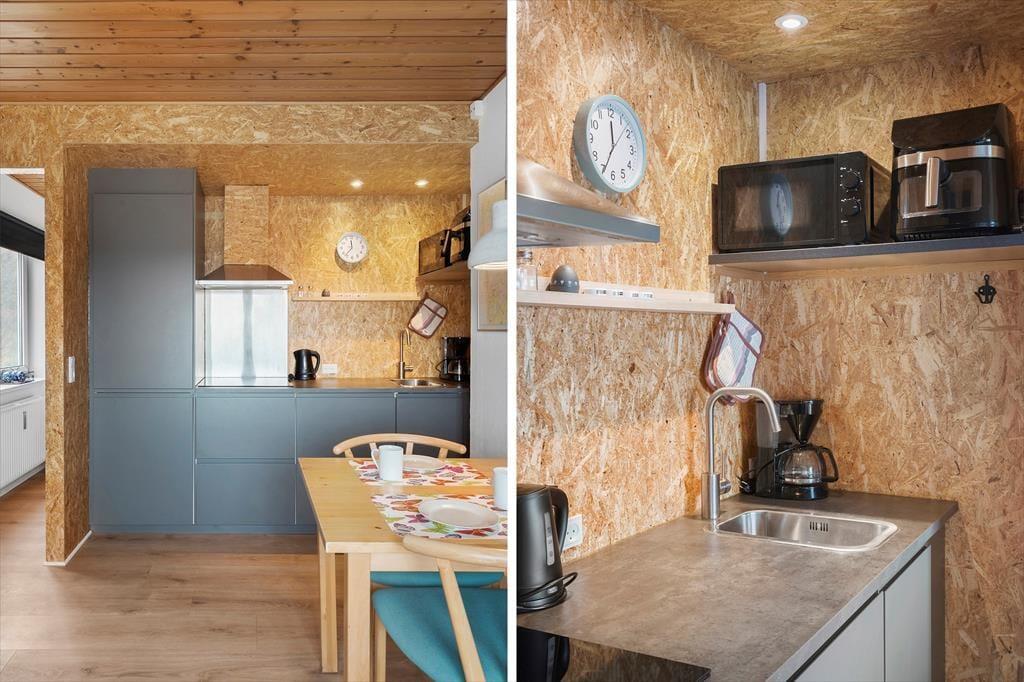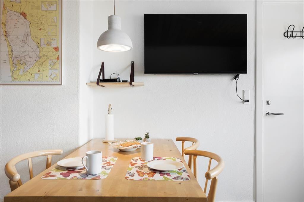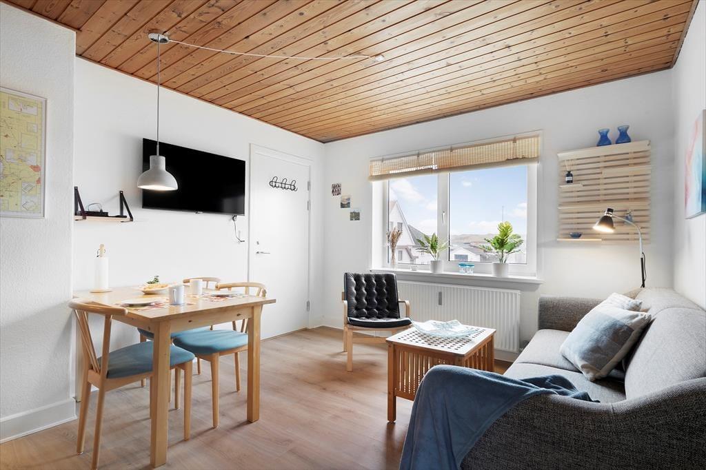 Lejligheden er en lille hyggelig og velindrettet perle midt i Hvide Sande by, så du har alt, hvad du behøver for en behagelig ferie. Det åbne opholdsrum kombinerer stue og køkken, så du let kan lave en lækker morgenmad, inden du begiver dig ud på eventyr. Indretningen er enkel og funktionel, og de store vinduer sørger for et dejligt lysindfald i løbet af dagen. Lejligheden har en halv skillevæg ind til soverummet, hvor der også er et stort klædeskab til at opbevare dine ting i. Efter en lang dag i den friske havluft kan du slappe af i sofaen med en god bog eller en film. Skulle du få brug for at vaske tøj undervejs, er der mulighed for vask og tørring i kælderen, så du altid har friske håndklæder og tørt tøj til næste dags oplevelser.