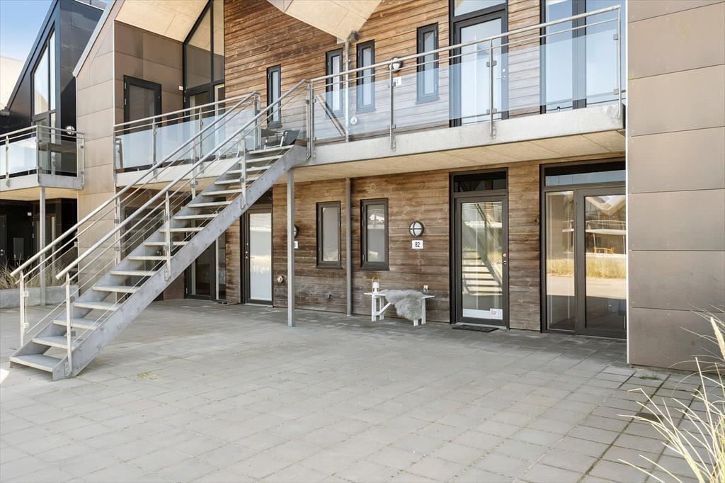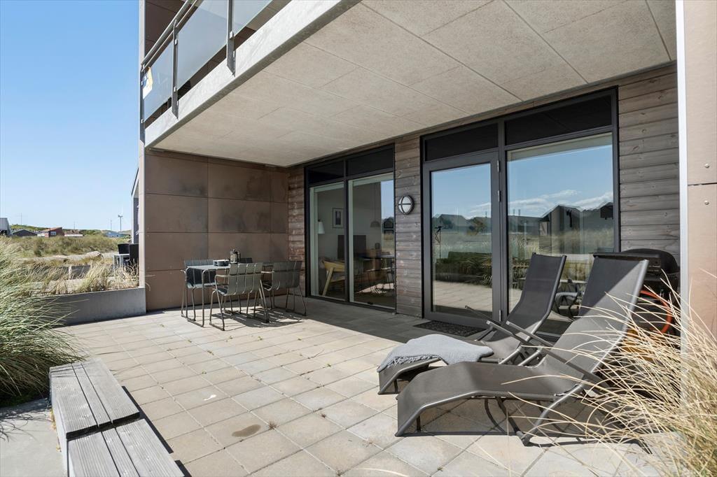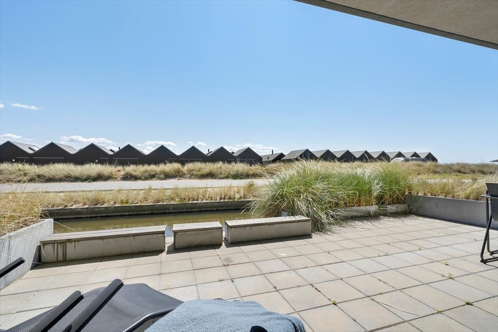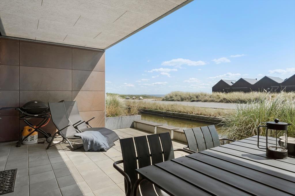 Nord for ferielejligheden er der plads til at parkere bilen lige ved fordøren, og der er også en lille krog, hvor I kan sidde og nyde det gode vejr. I kommer nu nok til at tilbringe mere tid på den anden side af lejligheden på den store og delvist overdækkede terrasse. Den er ikke bare sydvendt og derfor dejligt solrig, men har også udsigt til Ringkøbing Fjord og en trappe lige ned mod kanalens vandspejl.