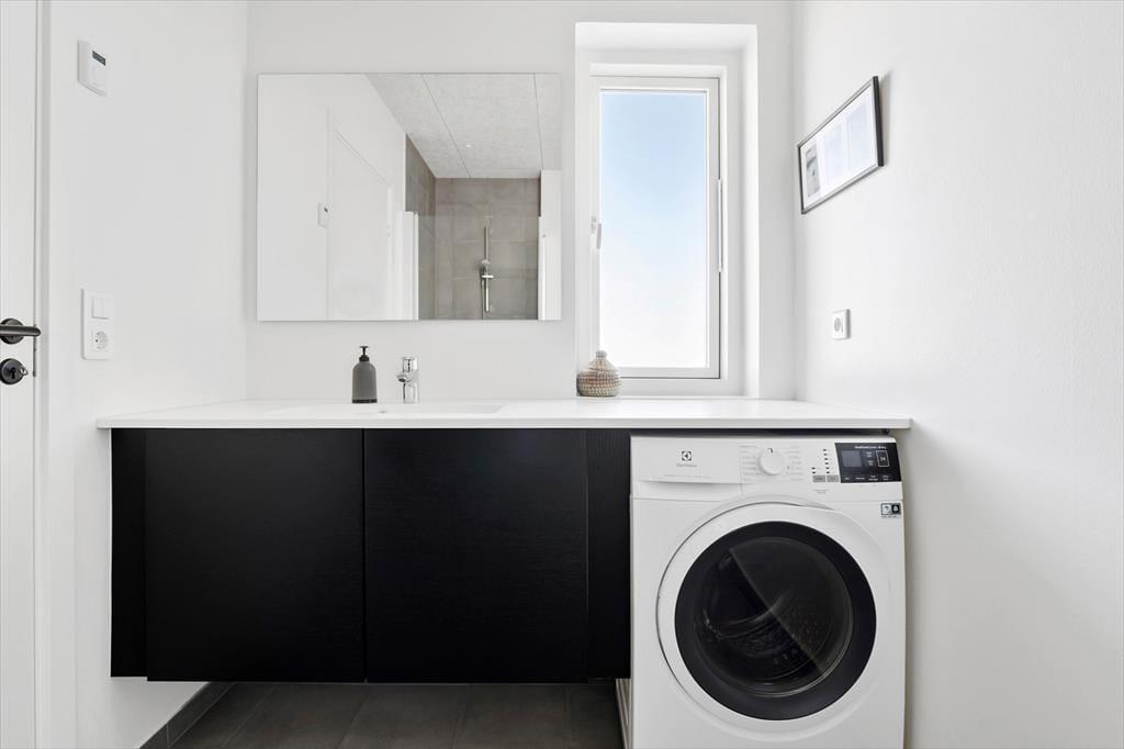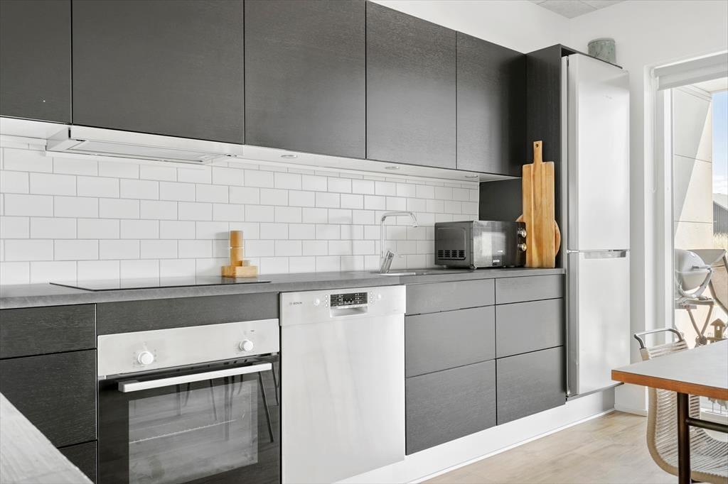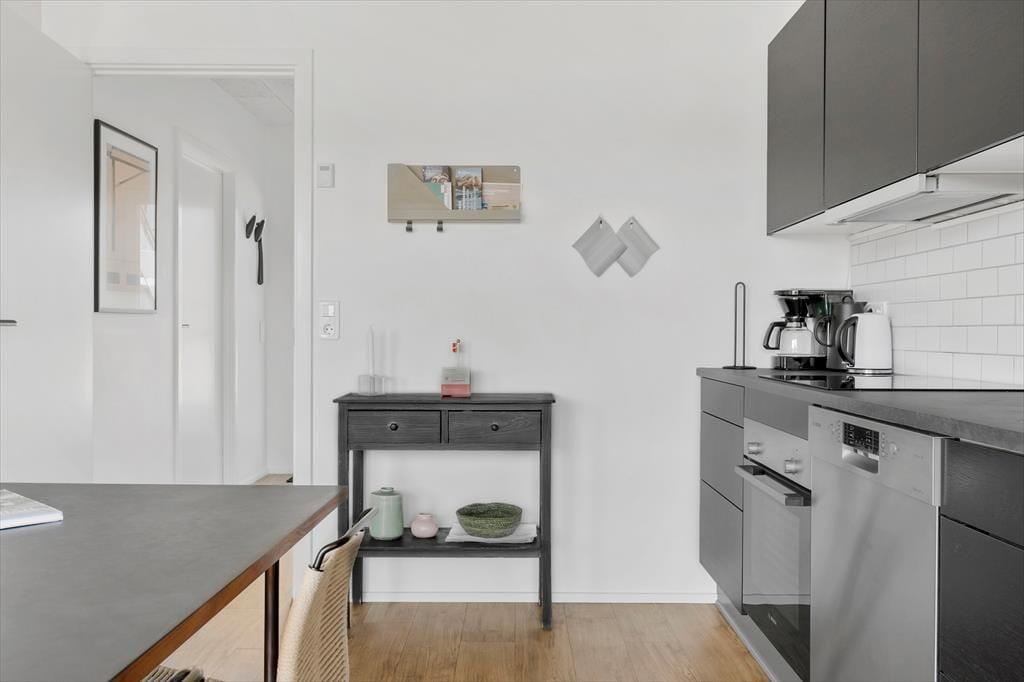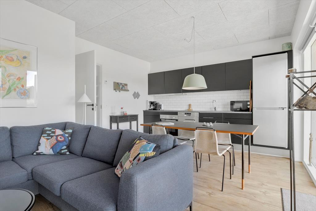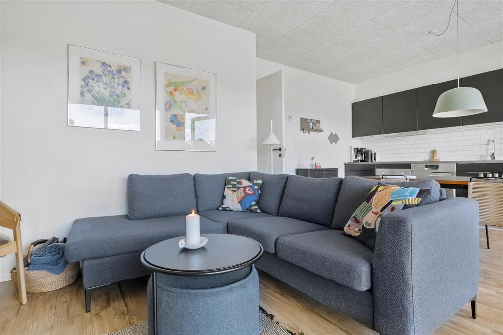 Lejligheden ligger i stueplan i en arkitekttegnet ejendom fra 2019. Som man kan forvente af et moderne byggeri, er der tænkt over både funktionaliteten og komforten, hvilket den stilfulde indretning også er med til at understrege. Med andre ord kan I se frem til at slappe af i skønne rammer – endda med udsigt til fjorden gennem stuens store, sydvendte vinduer. Køkkenet er på velfungerende vis integreret med stuen, og terrassedøren gør det nemt at smutte ud, så snart solen skinner. Fra lejlighedens flotte soveværelse har I desuden direkte adgang til udearealerne, hvis I vil trække frisk luft lige fra morgenstunden. Planløsningen byder for øvrigt på et velindrettet badeværelse med glasbruseniche og kombineret vaskemaskine og tørretumbler.