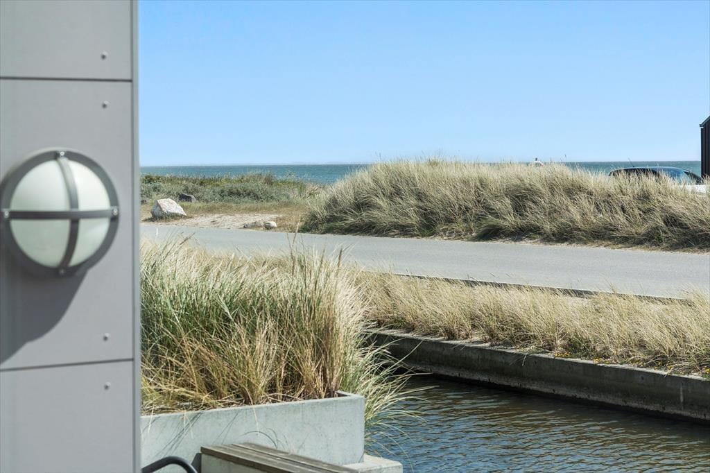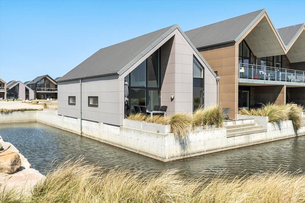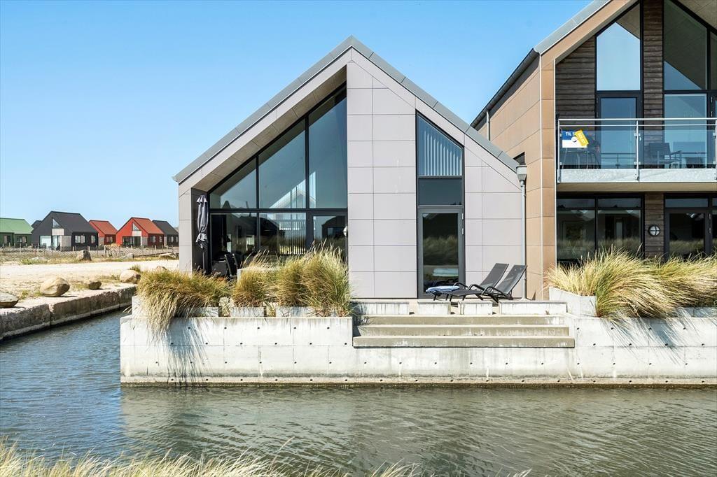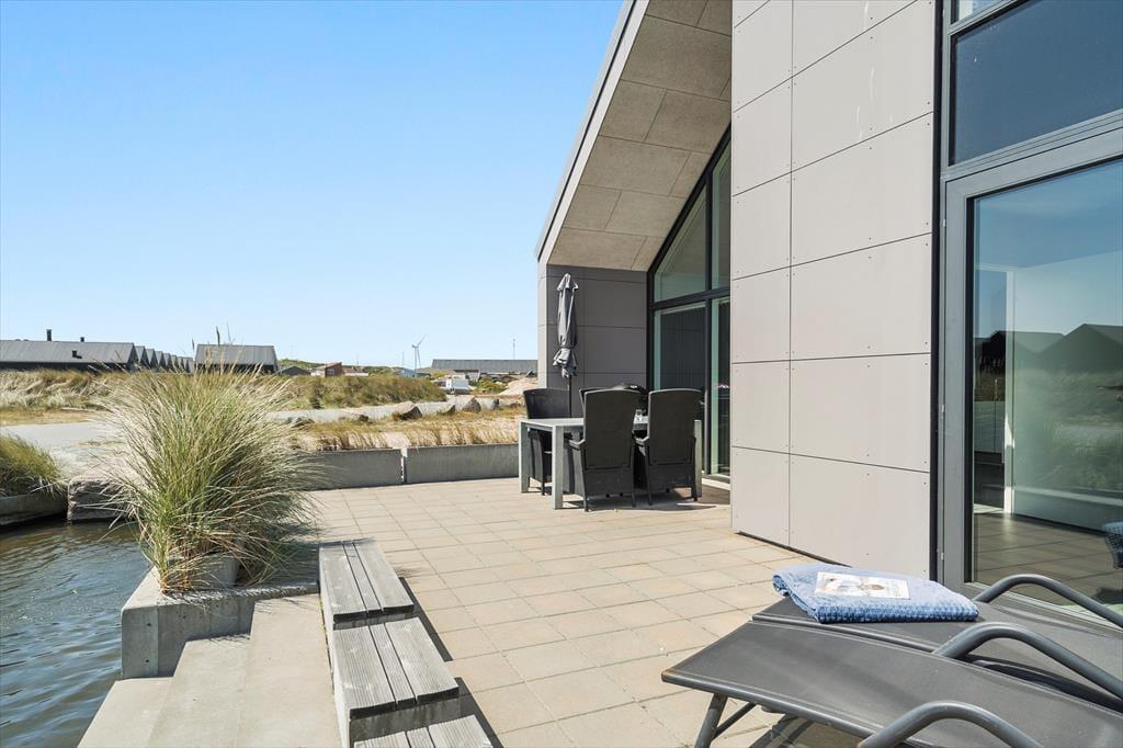 Udearealerne er mindst lige så tjekkede som selve sommerhuset. Mod nord er der god plads til at parkere bilen, og I kan også sætte jer herud for at nyde de lyse sommeraftener. Men den sydvendte terrasse vil nu nok alligevel blive jeres foretrukne opholdsplads i det fri, for den er nemlig stor, solrig og smukt placeret lige ud til kanalens vandspejl. Fra sydterrassen har I desuden udsigt til Ringkøbing Fjord, så det kan ikke blive meget skønnere.