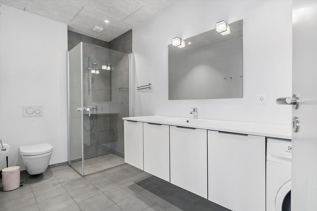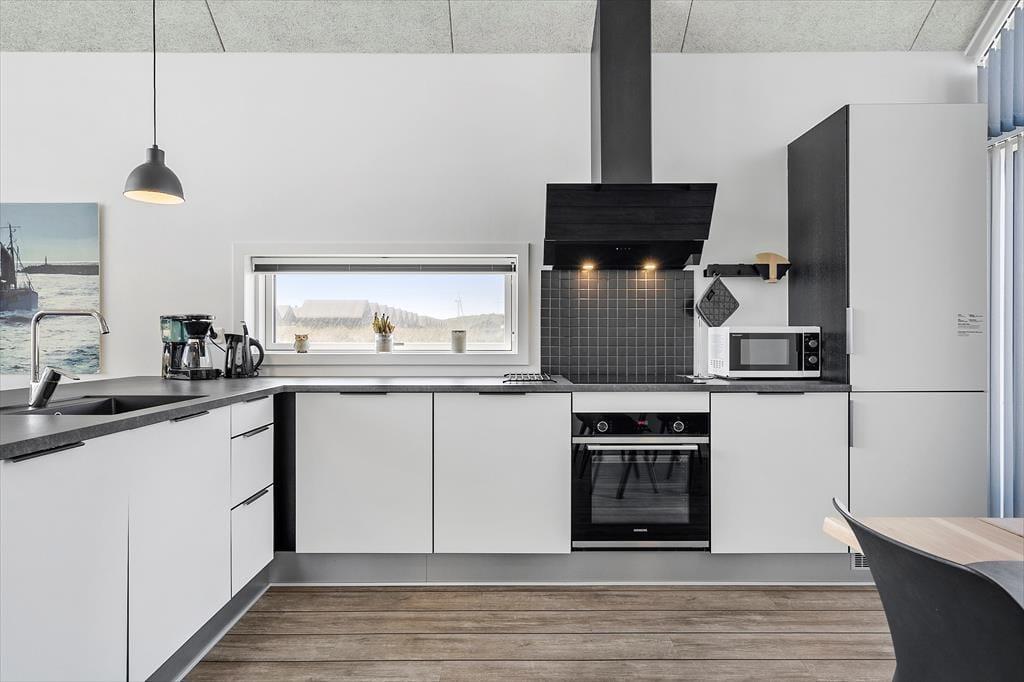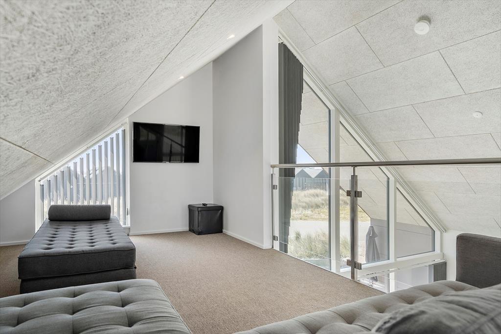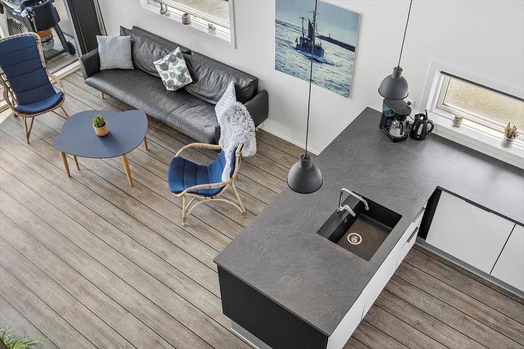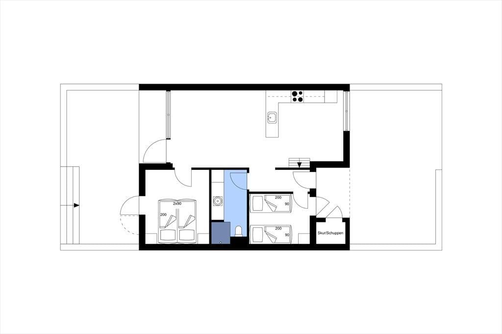 Nærheden til vandet var et af de centrale principper, da arkitekterne tegnede stregerne til Langsand Langs Vand, som feriekomplekset hedder. Netop denne enhed er et enderækkehus, så I har kun naboer til én side og derudover vinduer vendt mod tre verdenshjørner. Det er med til at skabe en lys og let atmosfære i opholdsrummet, hvor I kan slappe af med en god film i sofaafdelingen, spille kort ved spisebordet eller hygge jer med madlavningen i det åbne køkken. I kan også tage turen op på den store hems, der oplagt kan danne rammen om børnenes leg eller en middagslur efter en god frokost. Om natten kan I se frem til at sove sødt på de to gode soveværelser, og når I er klar til at stå op igen, kan I begynde dagen med et opkvikkende brusebad på det velindrettede badeværelse.