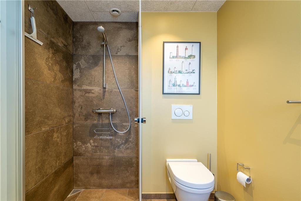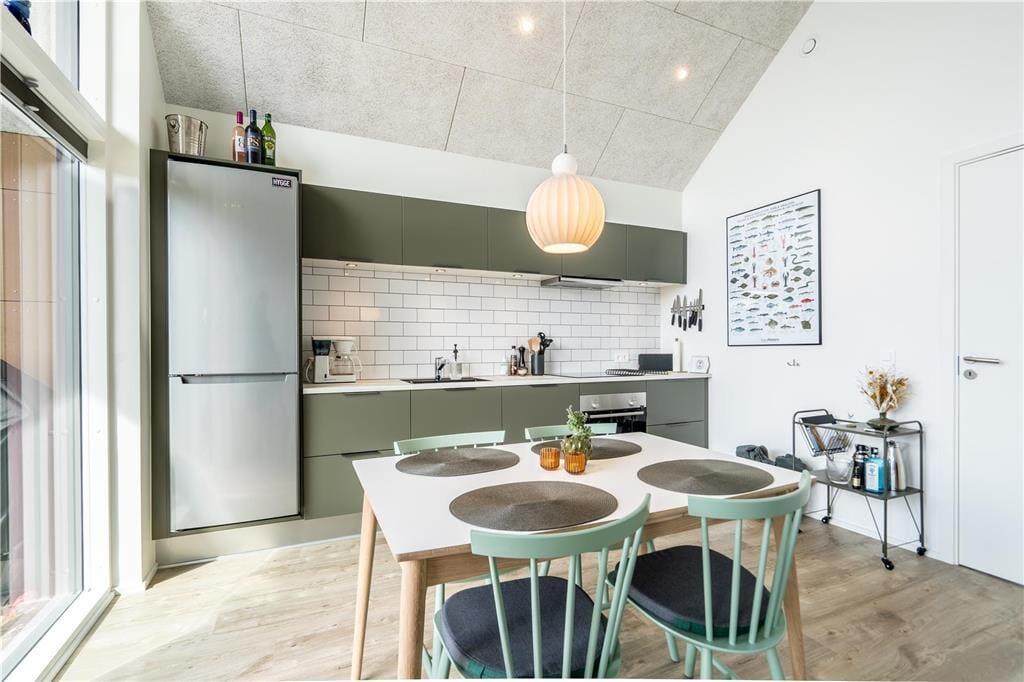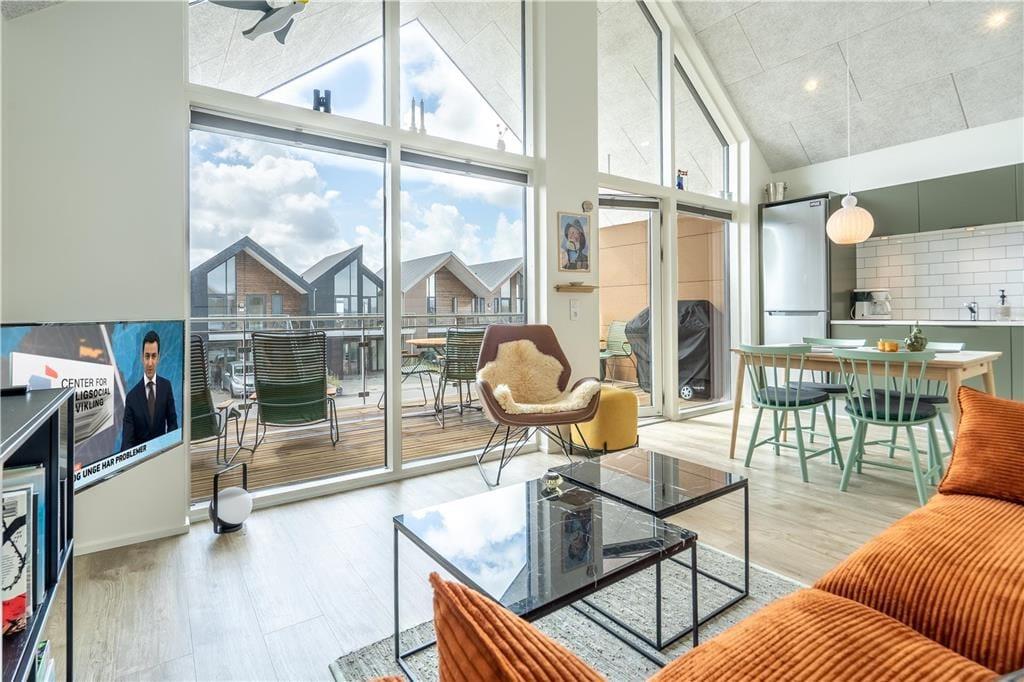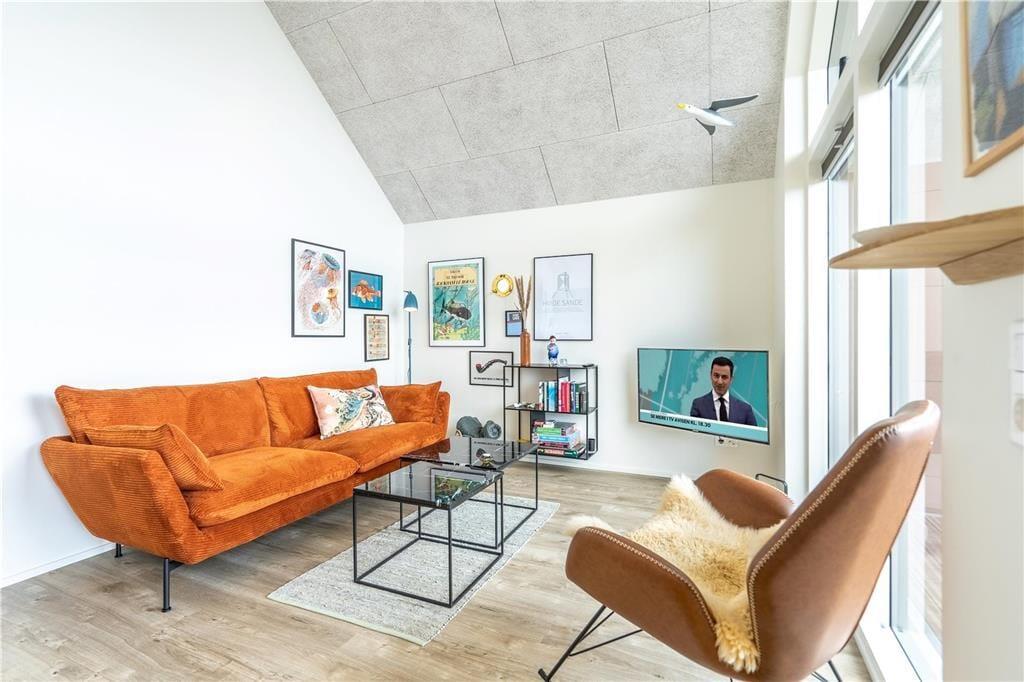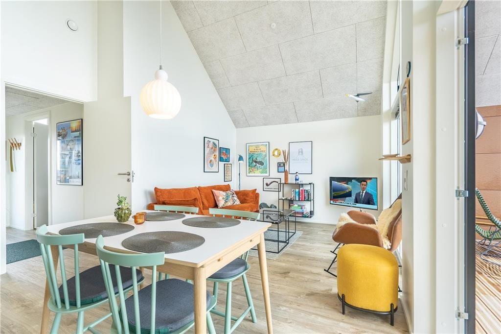 Når beliggenheden er så skøn som denne, har selve ferieboligen en hel del at leve op til. Og netop denne lejlighed lever op til selv de højeste forventninger, for den ligger på første sal i et arkitekttegnet kvalitetsbyggeri fra 2020. Den høje beliggenhed og de kæmpestore vinduer er med til at sikre et dejligt lysindfald og giver jer udsigt over det stemningsfyldte lokalområde. Det moderne møblement sætter farve på ferietilværelsen, så det er let at se, hvorfor ejerne kalder ferieboligen for deres Happy Place. Ejerne har for øvrigt indrettet stuen, med alt, hvad hjertet kan begære – lige fra fladskærms-tv, bluetooth-højttalere og brætspil til et veludstyret køkken, hvor I kan kræse om den friskfangede fisk og de lokalt indkøbte lækkerier. Et flot badeværelse med bruser og et dejligt soveværelse med tv hører også med til planløsningen, så alt i alt er det en perfekt indendørs oase til to personer.