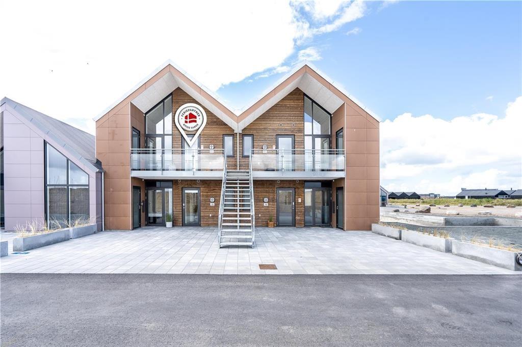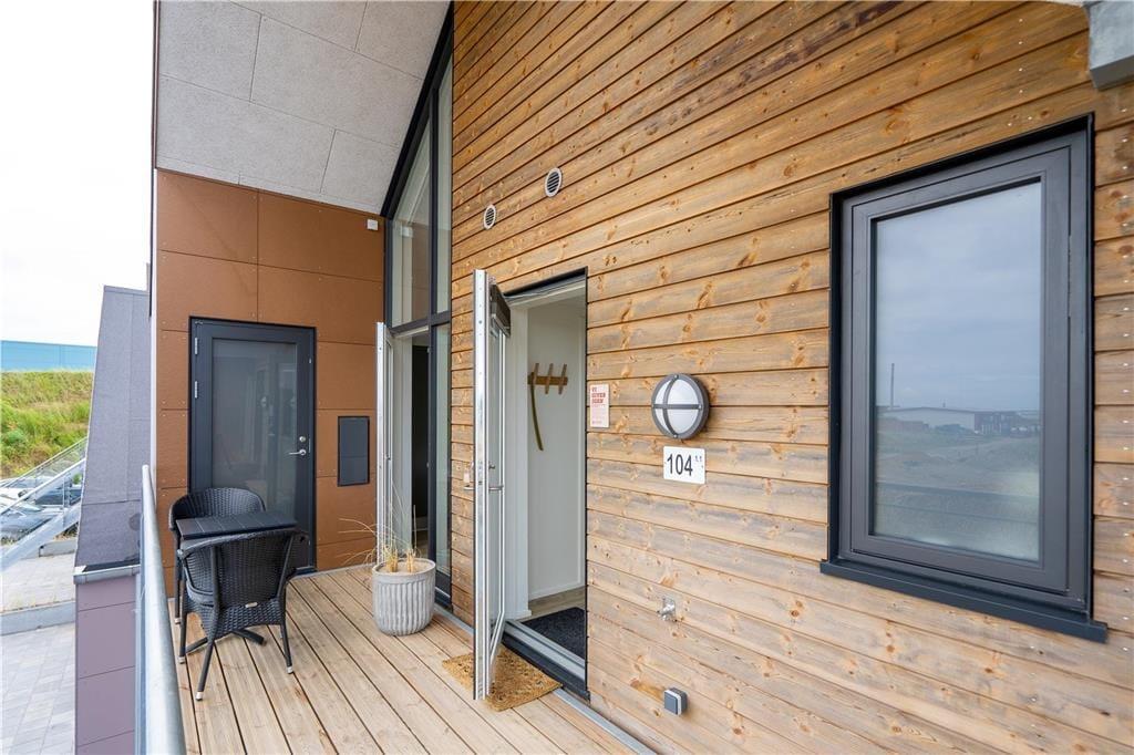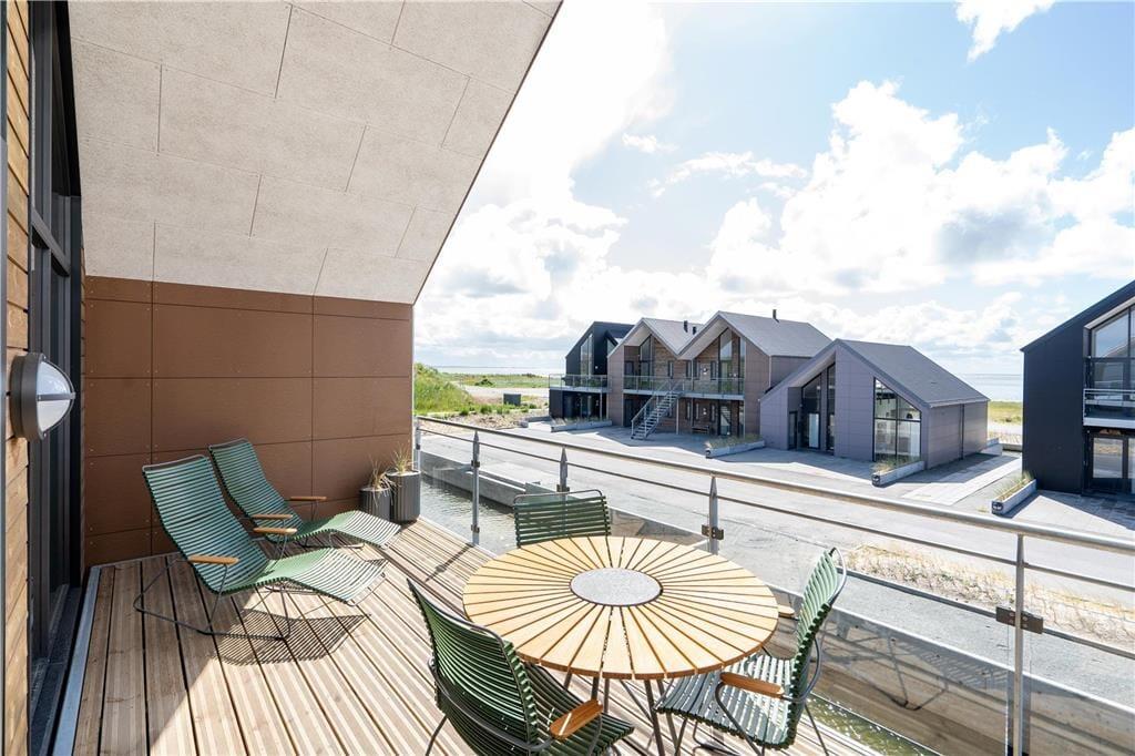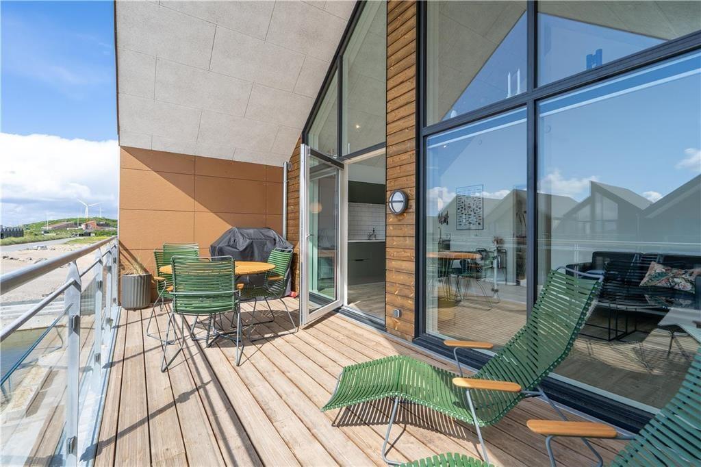 På den sydvendte, overdækkede altan går den gennemført lækre stil igen, så det søde ferieliv får tilsvarende gode vilkår ude i det fri. Fra altanen har I kig til fjorden, og I kan også nyde synet af kanalen, der smukt omkranser ejendommen. Nord for lejligheden kan I sætte jer på altangangen i dagens sidste solstråler, og hvis I bliver siddende ude for at nyde aftenens ro og den friske, salte luft, kan I måske se lysglimtene fra Lyngvig Fyr i det fjerne. Endelig skal det nævnes, at der er parkering på tilhørende plads lige nedenfor trappen.