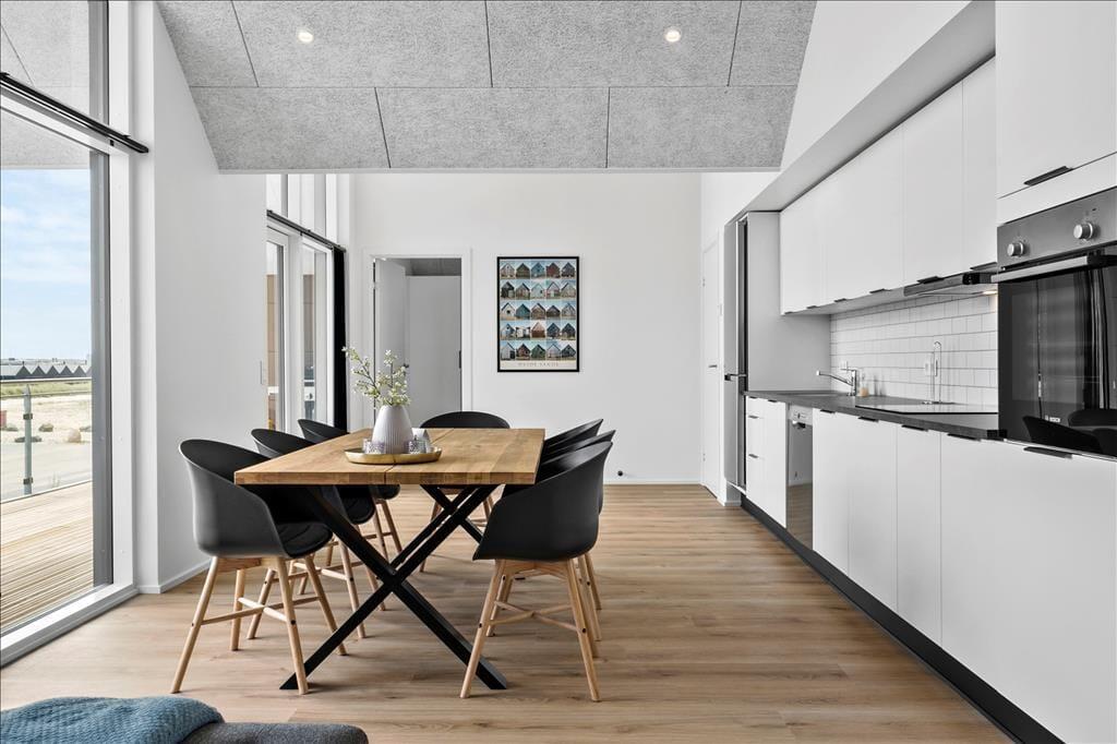 Den 100 m2 store feriebolig stod færdig i 2021, og med tre soveværelser, to badeværelser og et stort, åbent opholdsområde er her plads til både familie og venner. Alle rum fremstår lyse og indbydende, og med akustiklofter, god wi-fi-forbindelse, kombi-vaskemaskine og tv i såvel stuen som på værelserne, er komfortniveauet højt inden døre. De tre værelser har alle en god størrelse og kan nemt rumme seks personer tilsammen. Begge badeværelser er indrettet med gulvvarme og bruseniche, og det største byder derudover på et lækkert hjørnebadekar. I opholdsafdelingen glider stuen og køkkenet i ét. Det veludstyrede køkken giver jer god plads til at lave mad sammen, mens opvaskemaskinen gør rengøringen let som en leg. Retterne serveres let ved spisebordet, og vinduespartier fra gulv til loft giver et behageligt lysindfald og et skønt kig ud over kanalbyen Langsand Langs Vand.