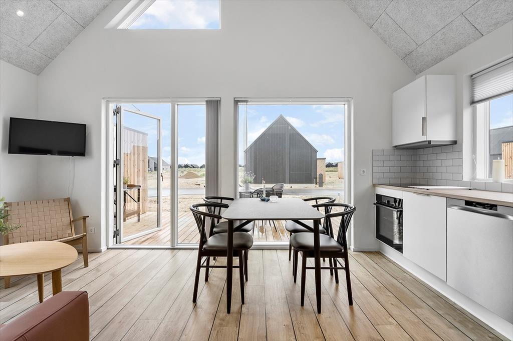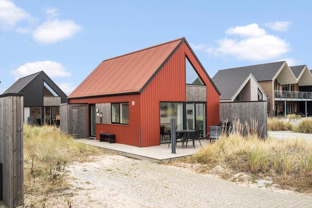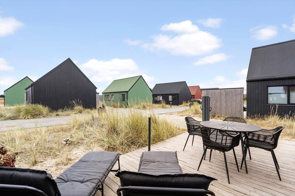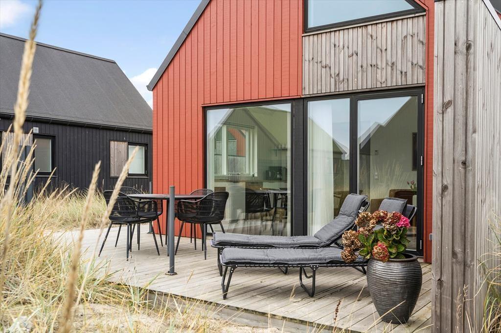 Hyggeligt ser det ud her i Langsand Langs Sand – en nybygget, farverig og attraktiv feriebebyggelse, der liger smukt placeret i Hvide Sande nær Tyskerhavnen og Ringkøbing Fjord. Hvis man zoomer ind på netop dette sommerhus, er charmen heller ikke til at tage fejl af, for både inde og ude, er der kælet for detaljerne.