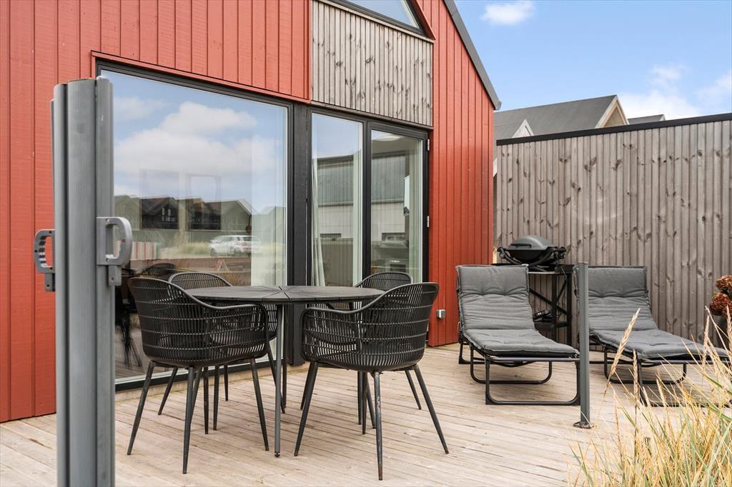 Den 28 m2 store træterrasse breder sig syd og vest for sommerhuset, og der er selvfølgelig havemøbler, liggestole og grill til rådighed, så I kan nyde sommeren til det yderste.