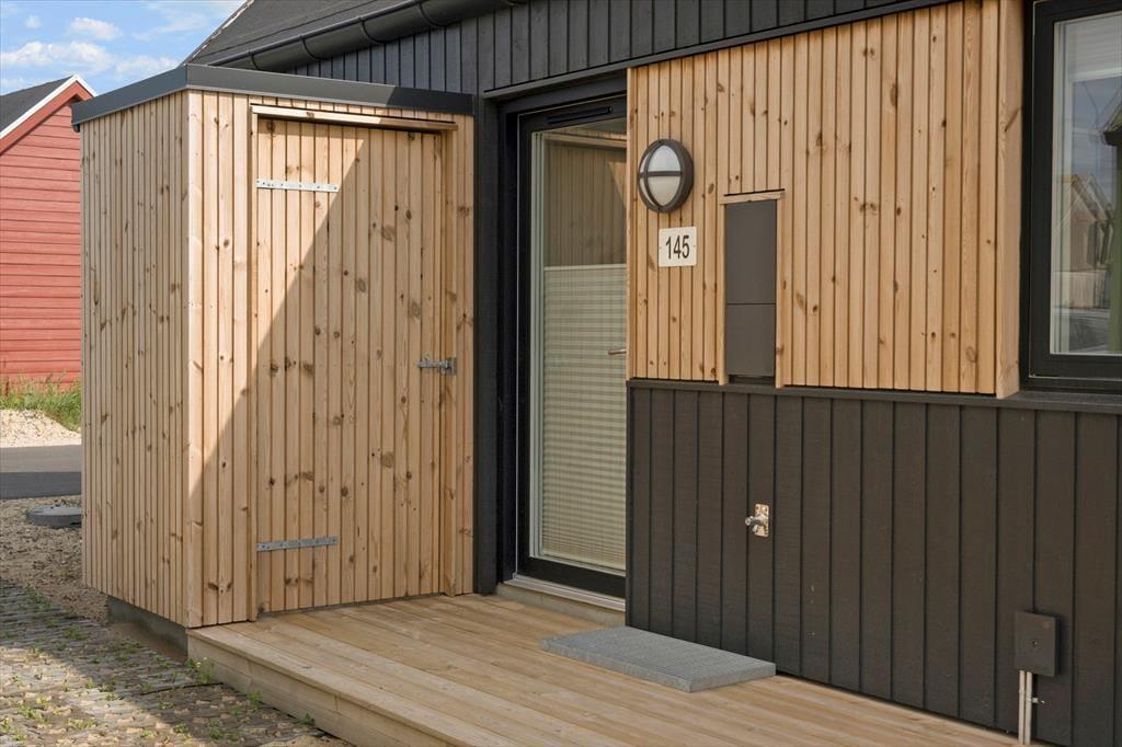 Det søde ferieliv kan også foregå ude i det fri, hvor en 28 m2 stor træterrasse breder sig på husets syd- og vestside. Vil I grille, spise søndagsfrokost i solen eller tage en slapper i liggestolene, kan det alt sammen foregå her i Langsands hyggelige og afslappende omgivelser. Bilen kan holde på den tilhørende p-plads lige ved huset.